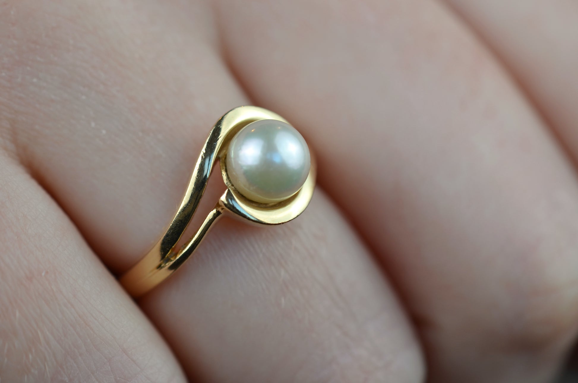 • Face of ring measures 10.3mm wide, 10.2mm across, with a rise of 7.1mm at pearl and 3.5mm at band; back of band measures 2mm wide and 0.9mm thick