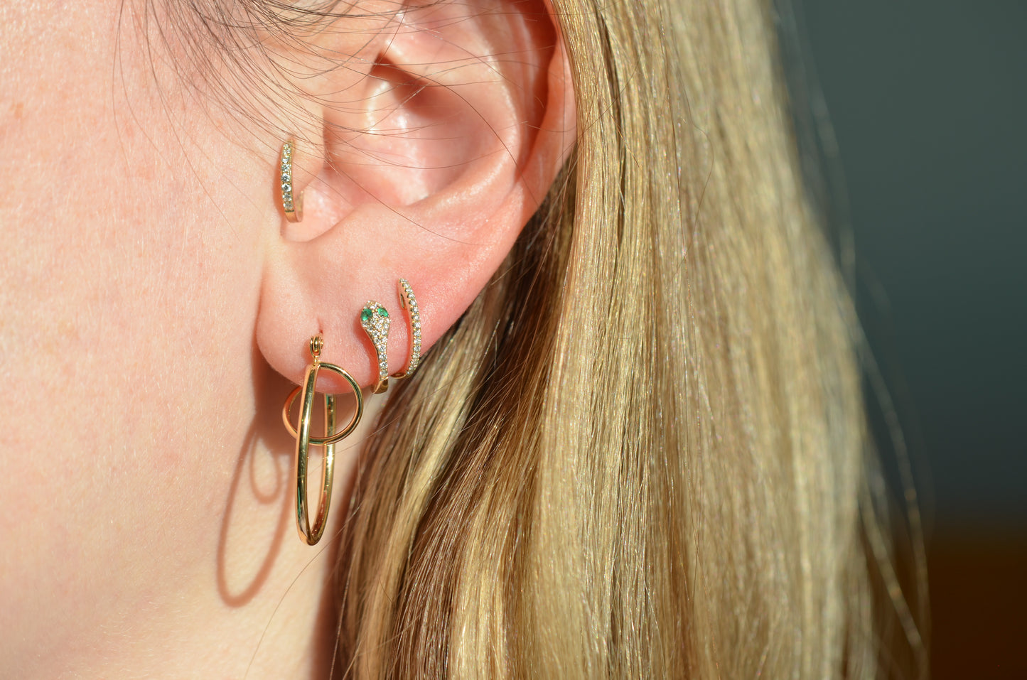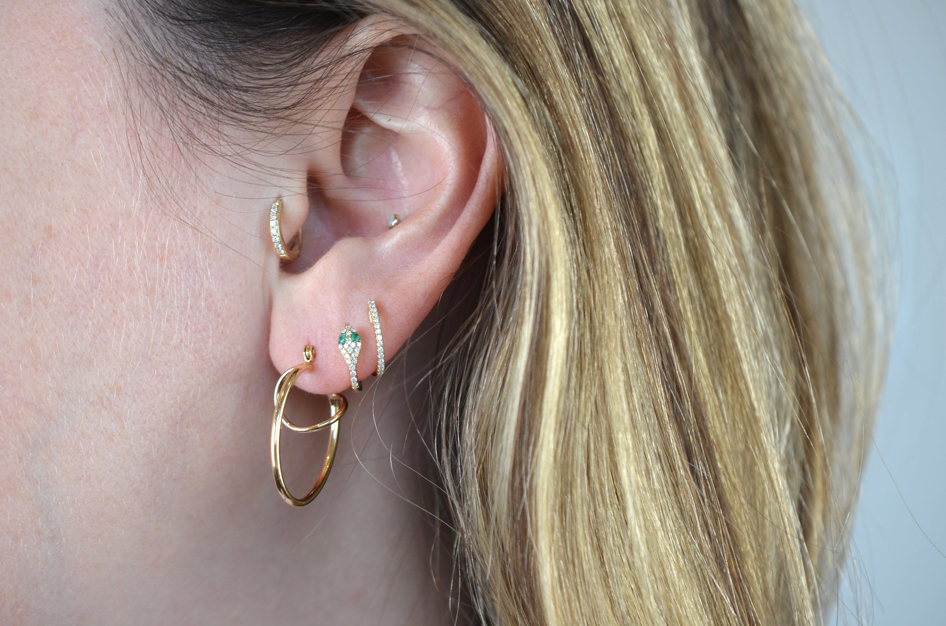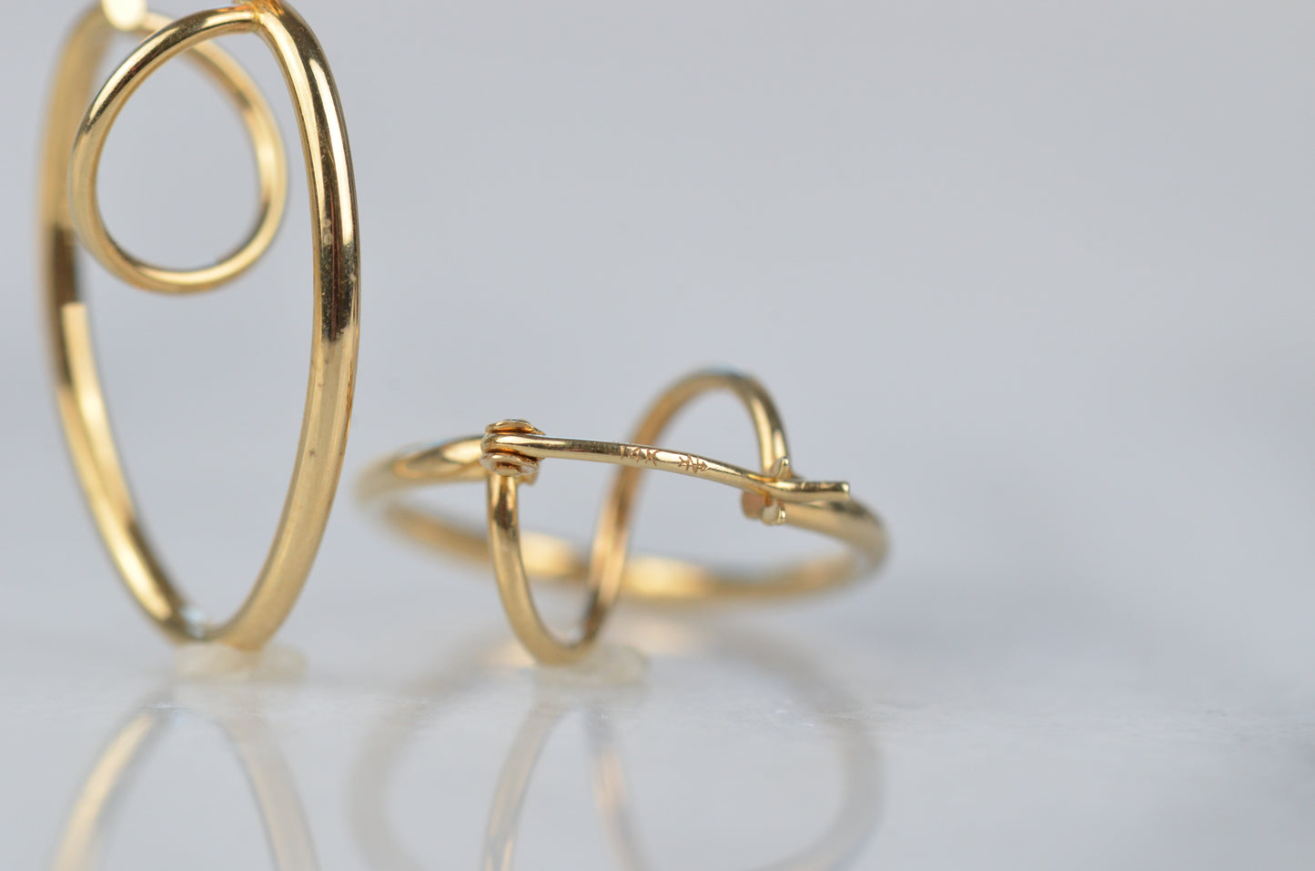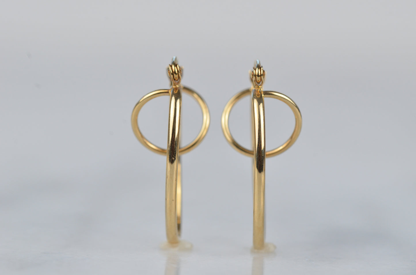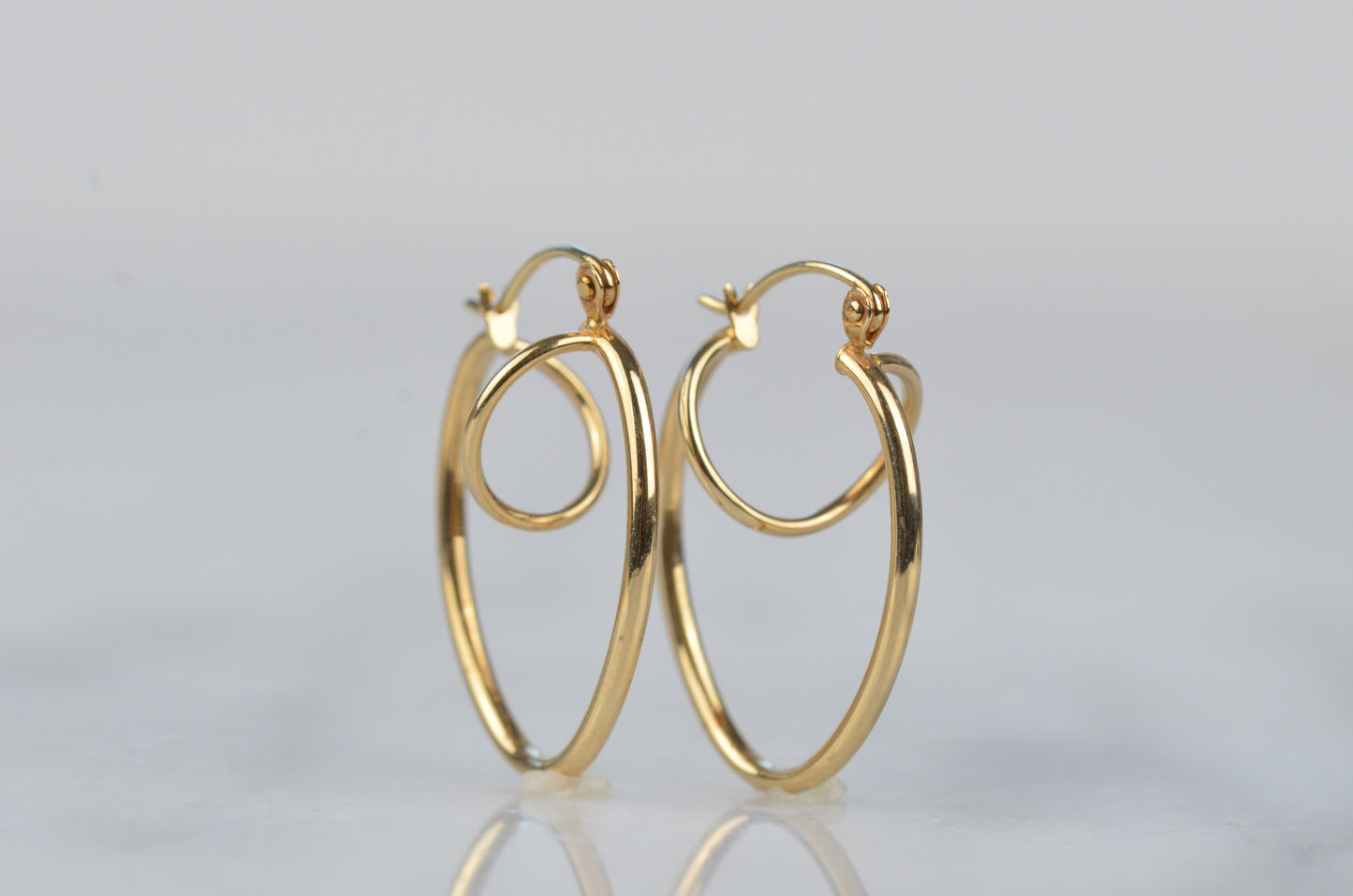 Swirling and entrancing double hoops are the perfect way to add interest and depth to your ear game. A slim elongated outer hoop is offset by a sweet corkscrew of gold that hugs closer to the lobe and adds width and volume without weight. The dropped loop makes these easy to stack with other earrings, while providing enough oomph to make an impact on their own.