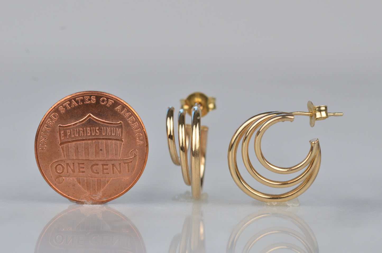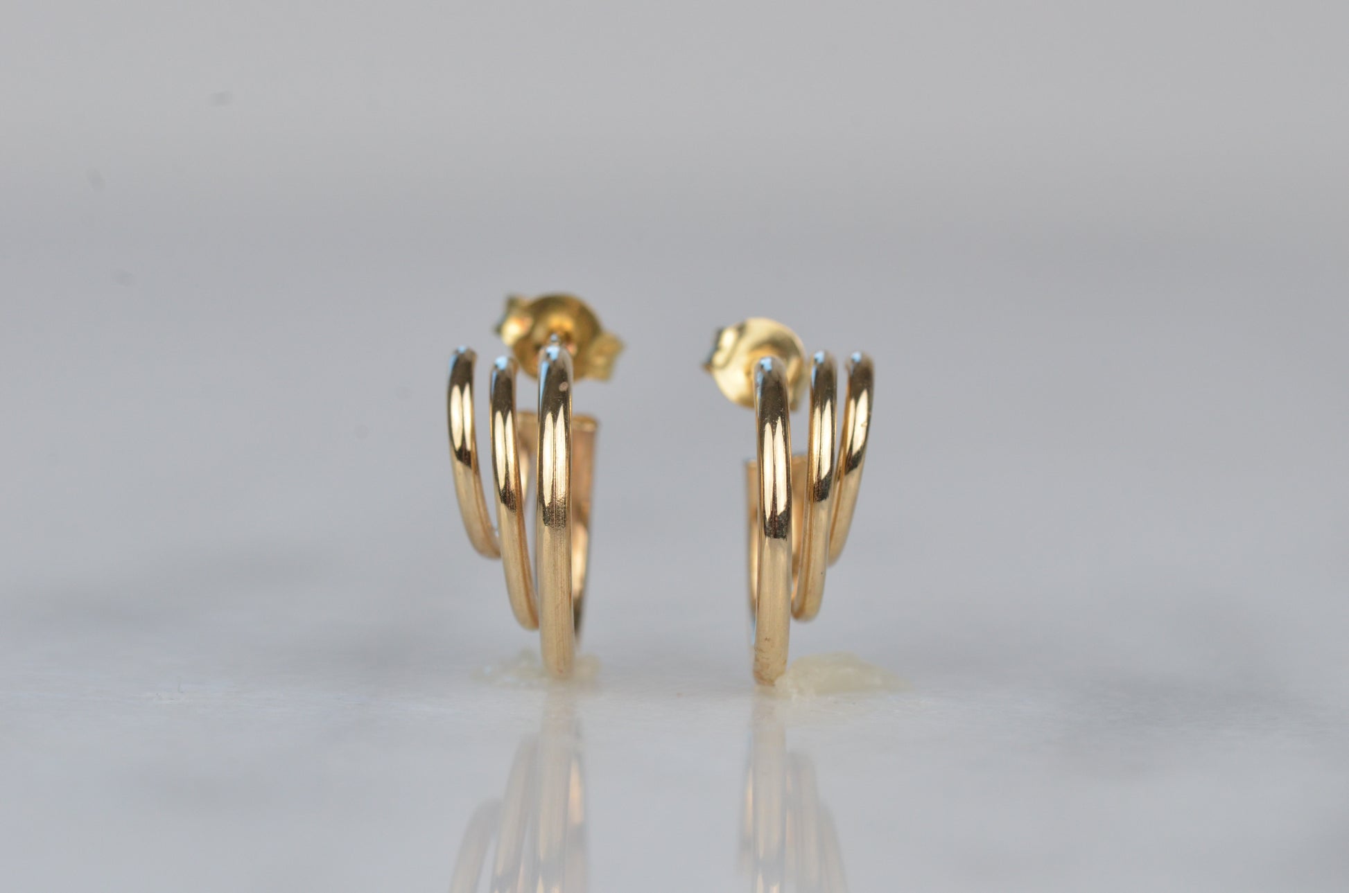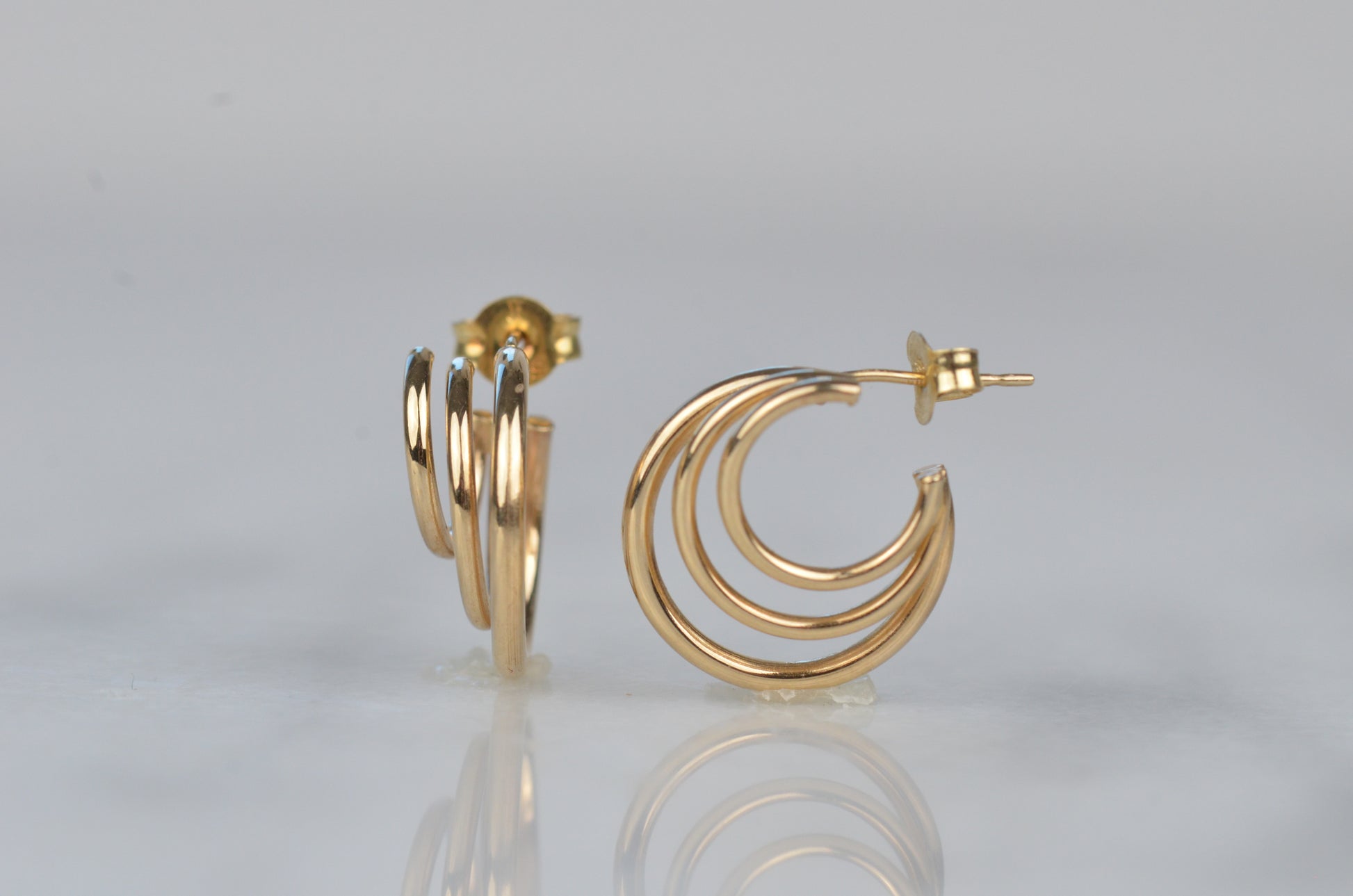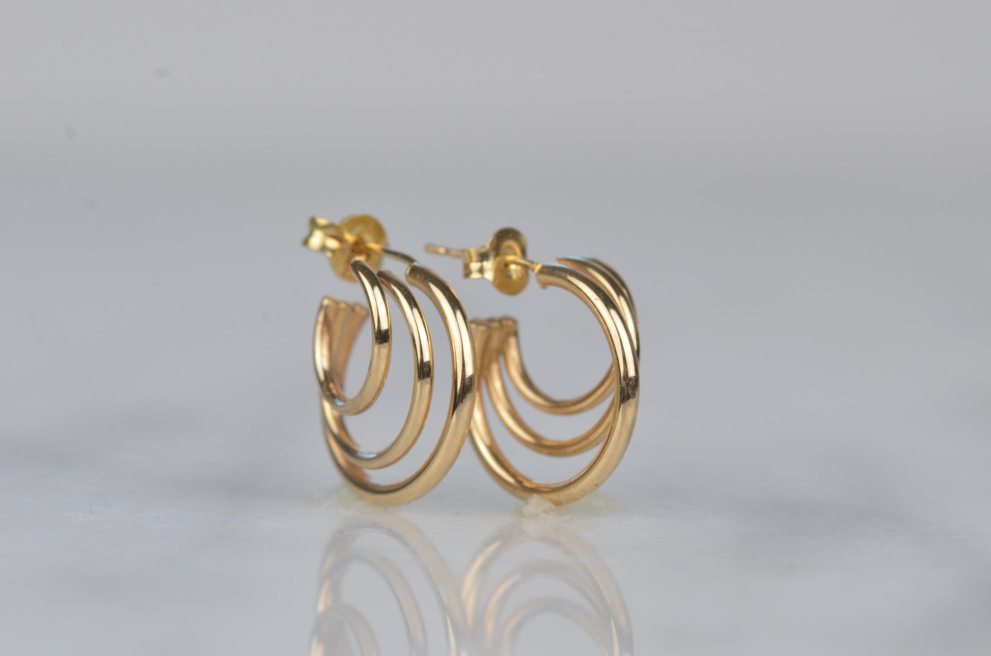 The perfect pair of earrings if you're looking for a staple piece with a twist - and especially if you're looking to add a playful look to your ear game without committing to extra piercings! Three graduated hoops attach in the back to create the look of a trilogy of earrings each in classic sizes. The wires are hollow tubes to ensure a lightweight and comfortable feel, along with the volume created by negative space between the hoops.