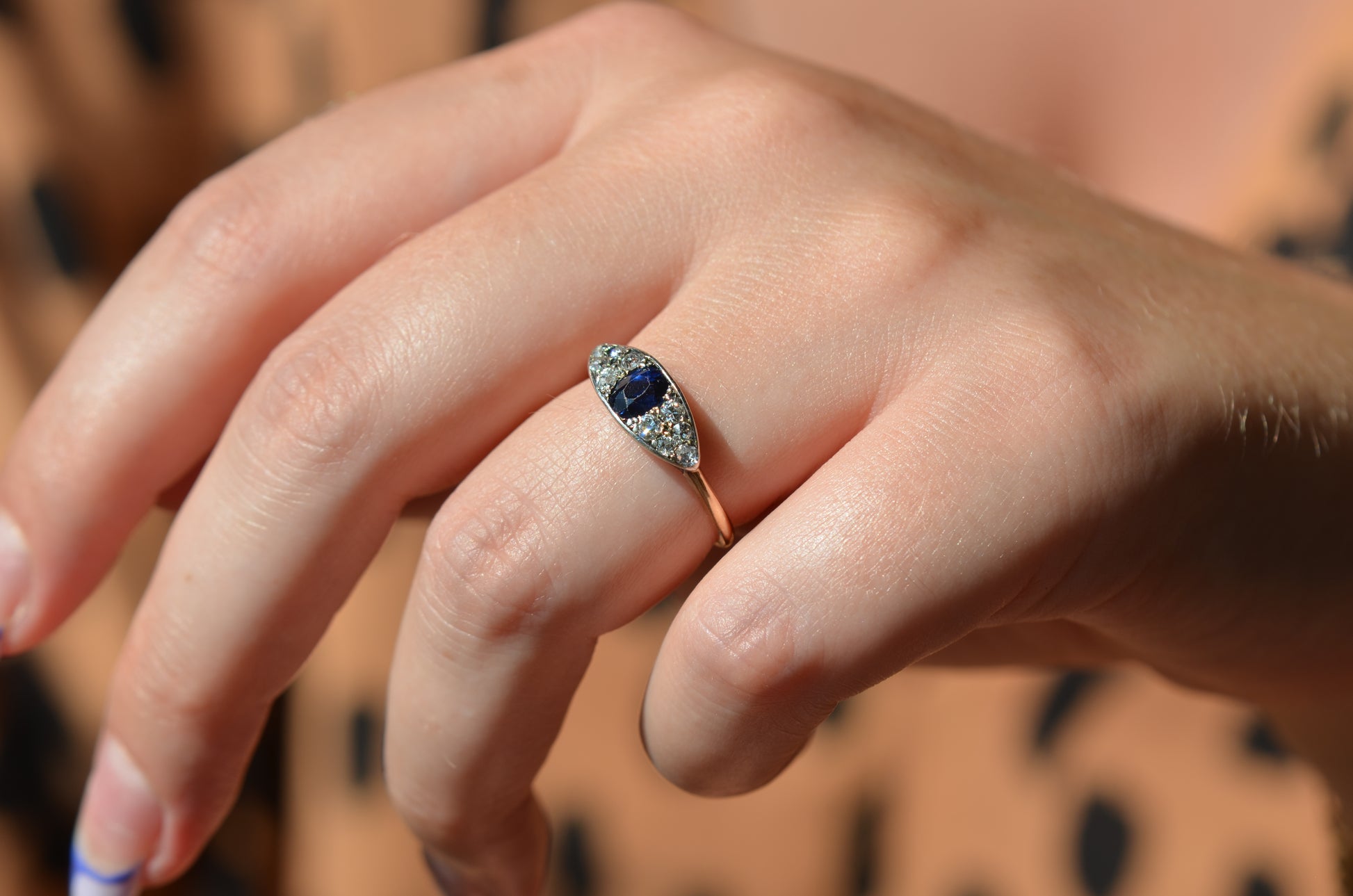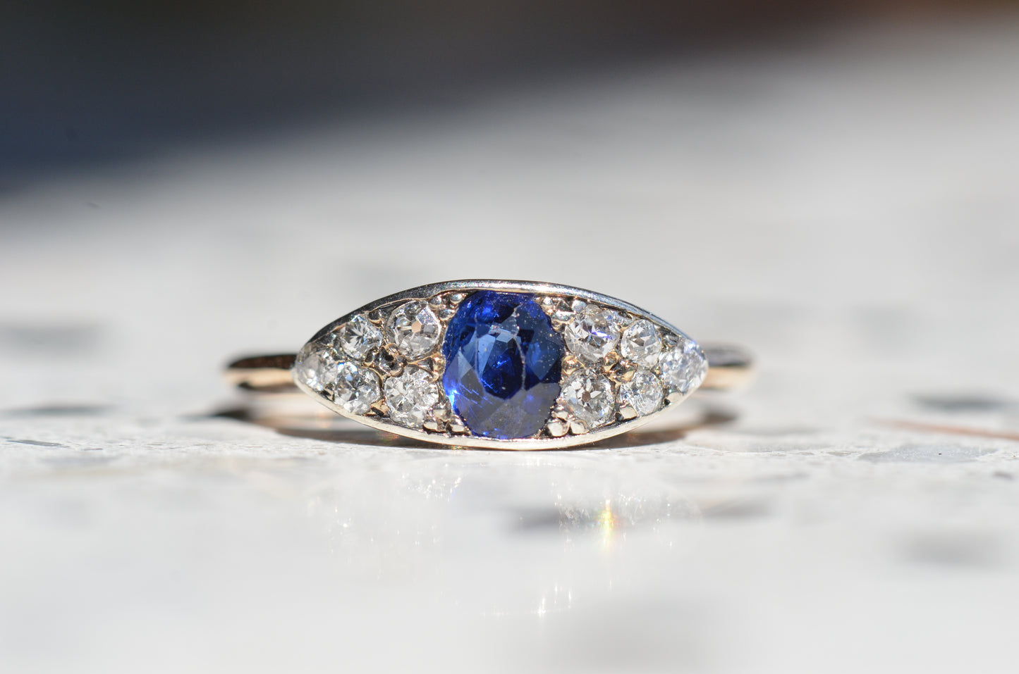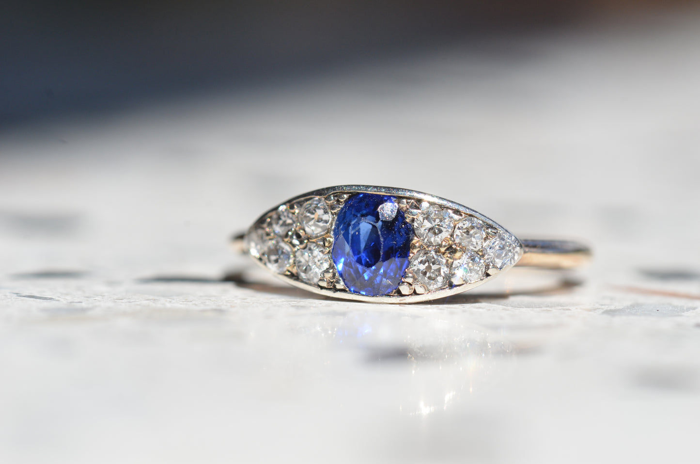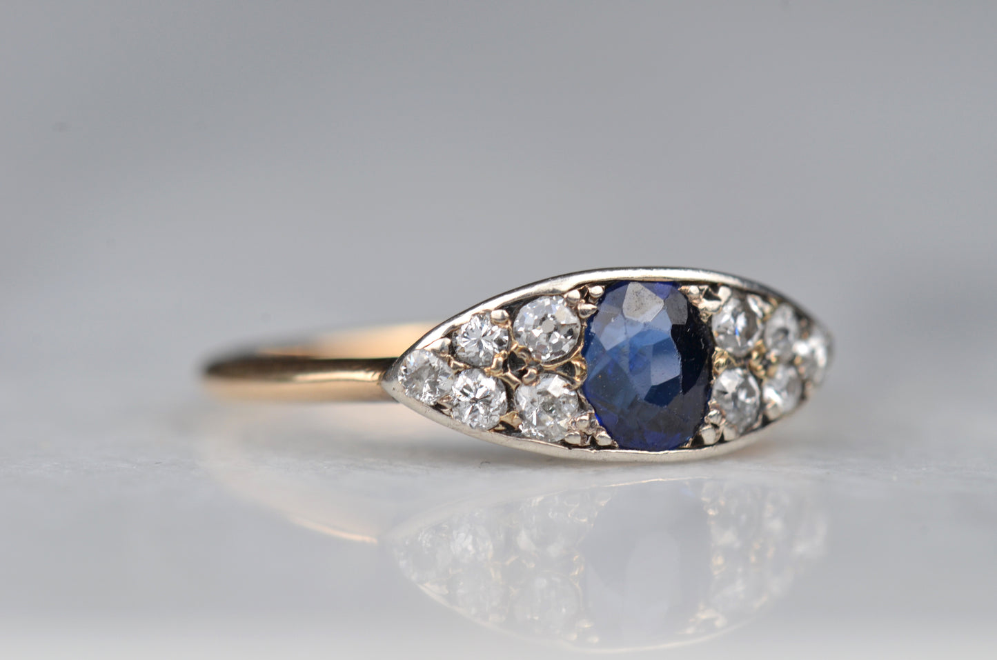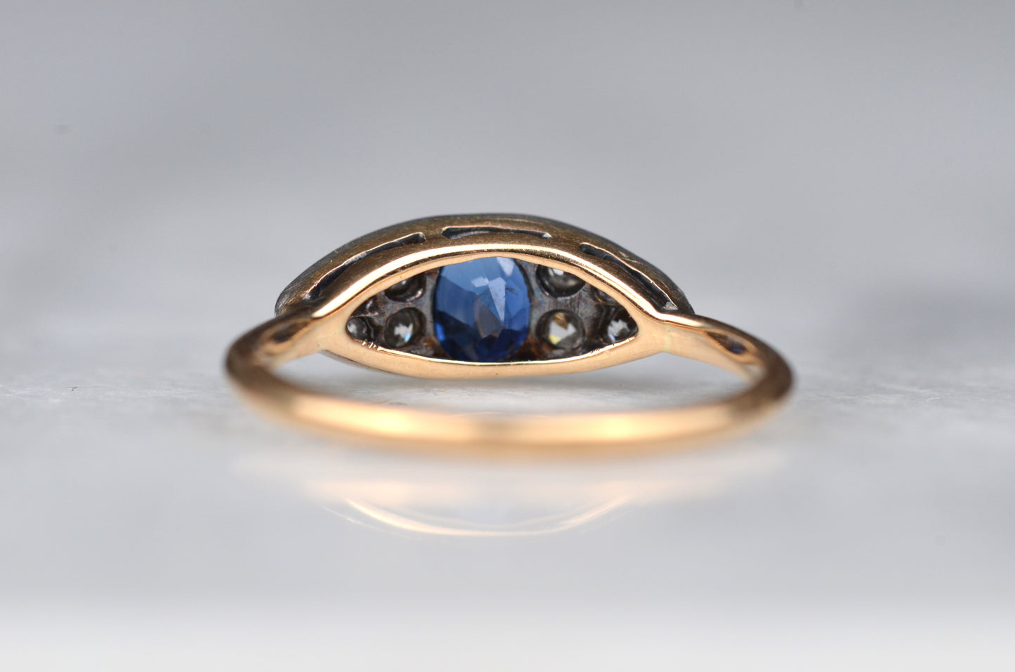 Gorgeous and unique, this antique ring features a unique, east-west navette-shaped halo of diamonds around a single rich cushion-shaped sapphire, evocative of a protective eye. For centuries, white metals have been used to set diamonds to brighten their appearance - as of the 20th century, this has primarily been done in white gold and platinum, but before those options were available to jewellers it was silver that fit the bill and commonly topped yellow gold rings. We love these combinations of two-tone metals for the ease with which they blend into any jewelry collection and the way they tie together a mixed metal look.
