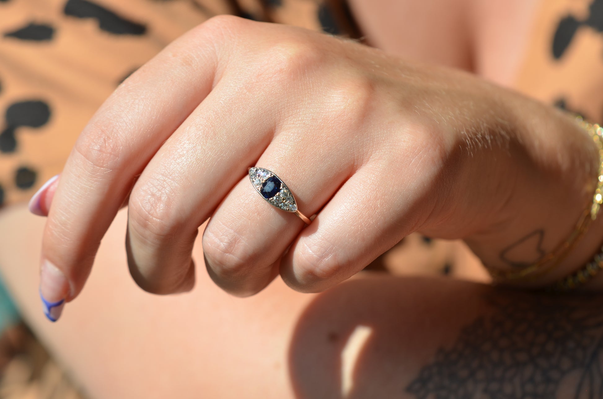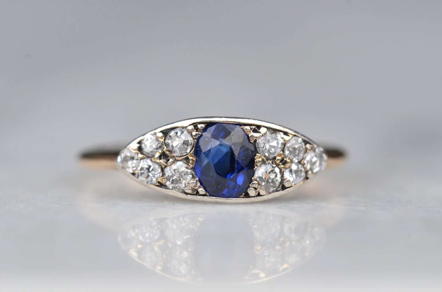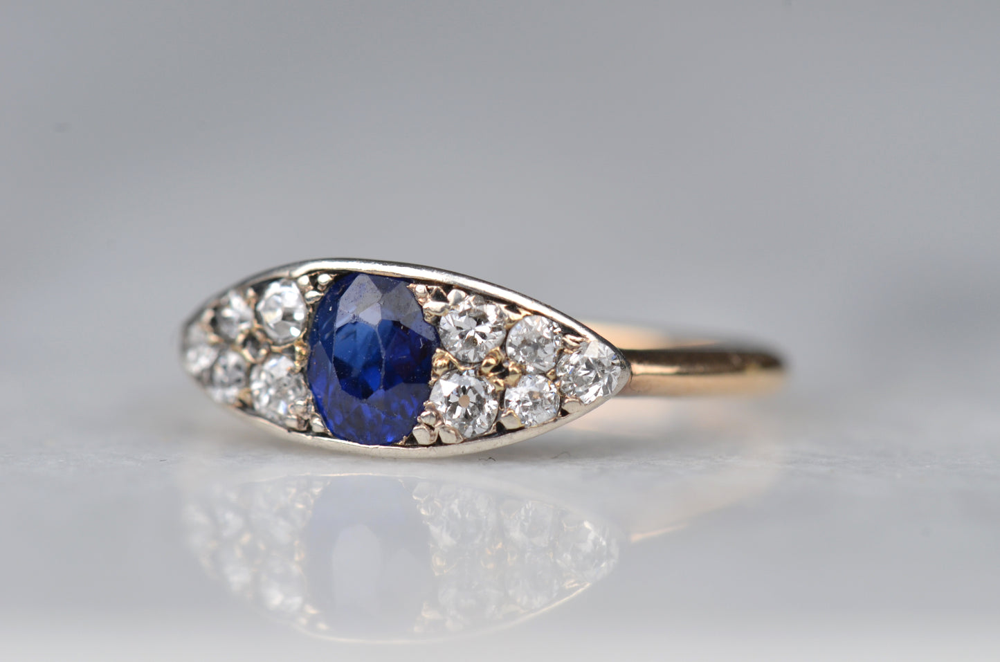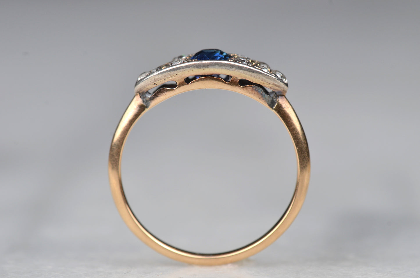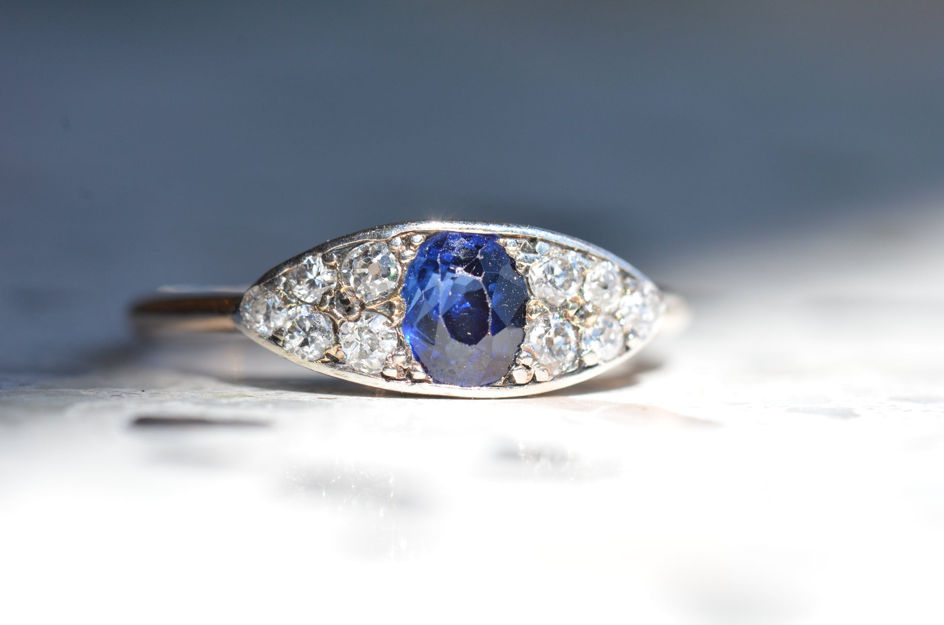 Gorgeous and unique, this antique ring features a unique, east-west navette-shaped halo of diamonds around a single rich cushion-shaped sapphire, evocative of a protective eye. For centuries, white metals have been used to set diamonds to brighten their appearance - as of the 20th century, this has primarily been done in white gold and platinum, but before those options were available to jewellers it was silver that fit the bill and commonly topped yellow gold rings. We love these combinations of two-tone metals for the ease with which they blend into any jewelry collection and the way they tie together a mixed metal look.