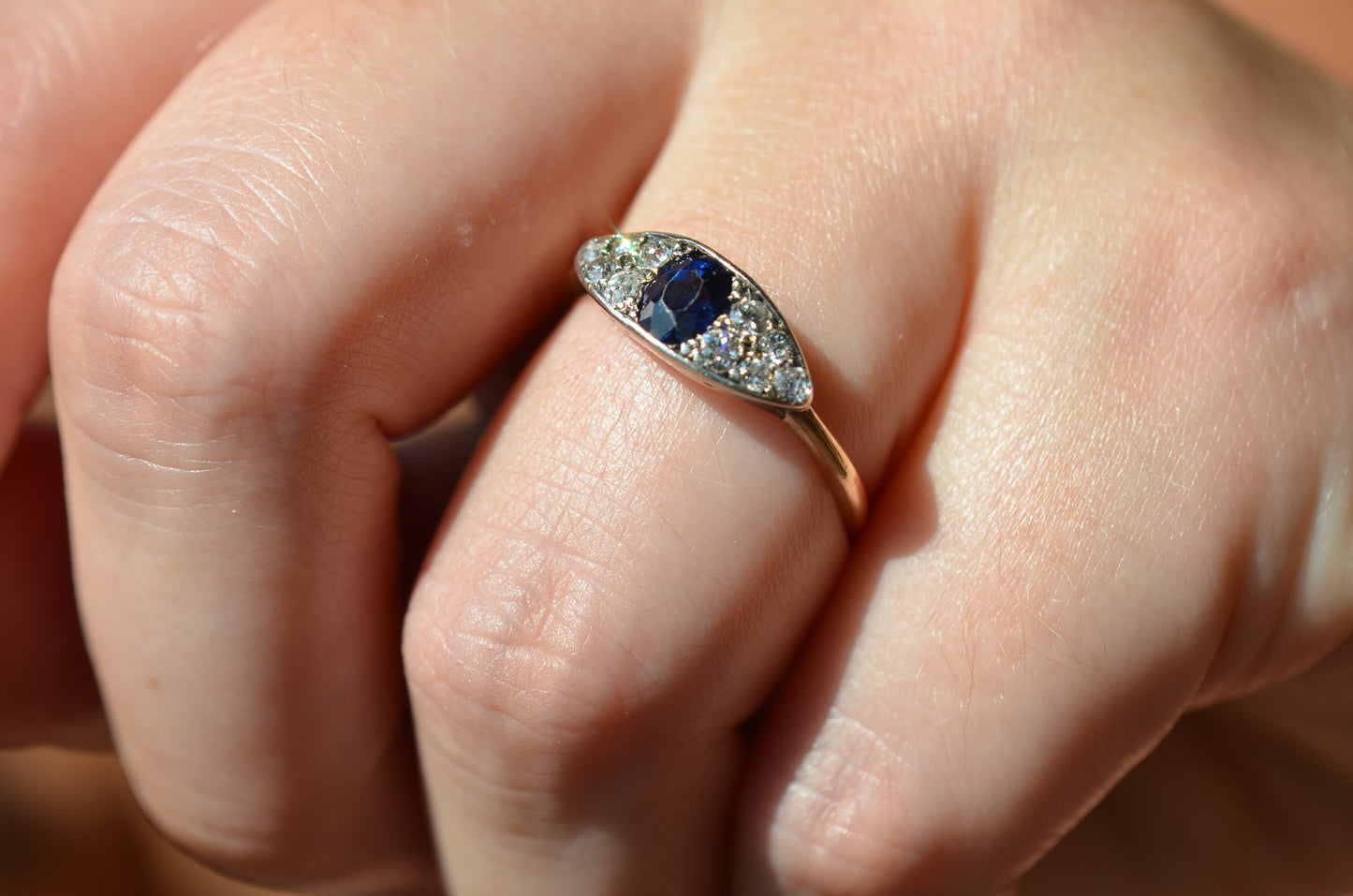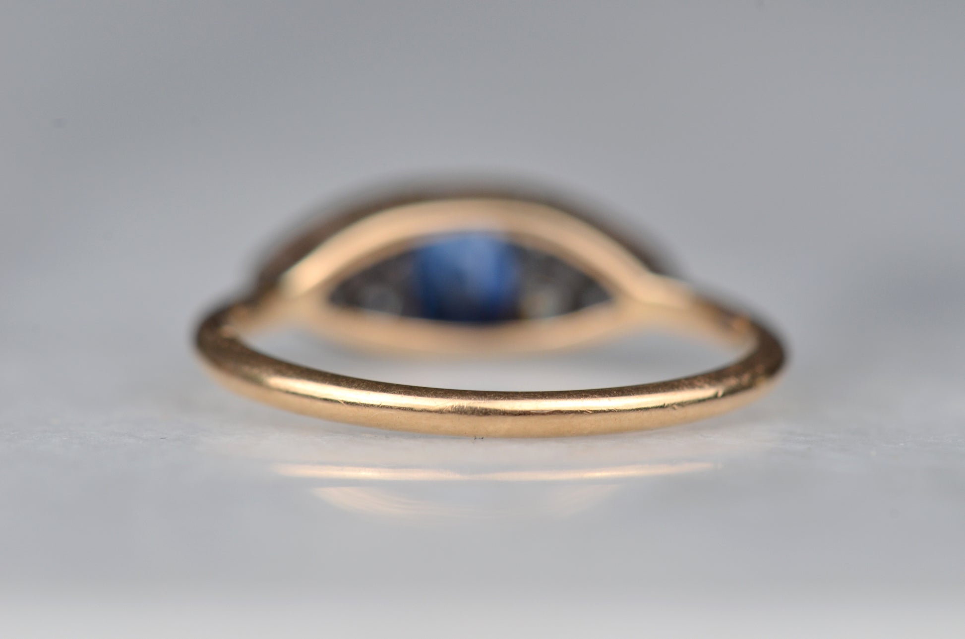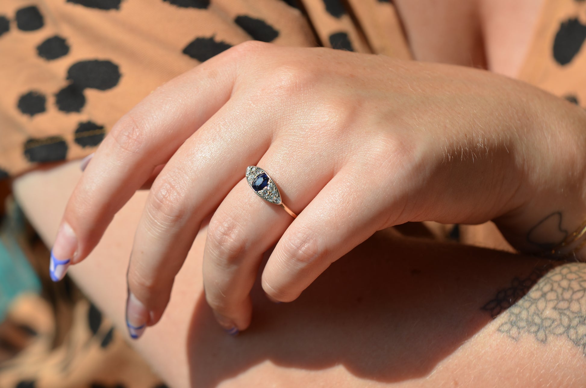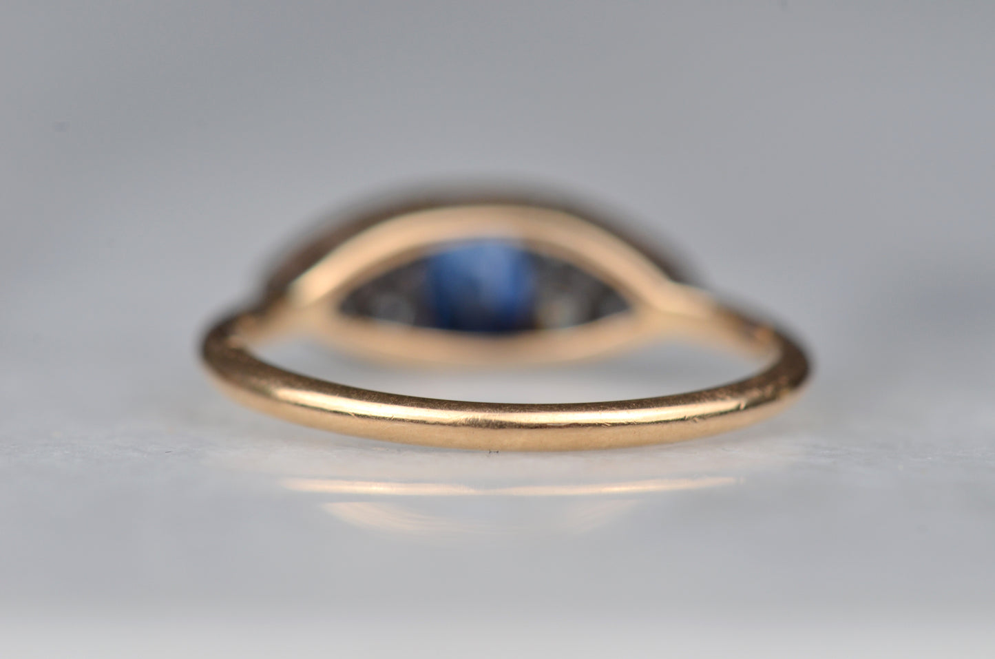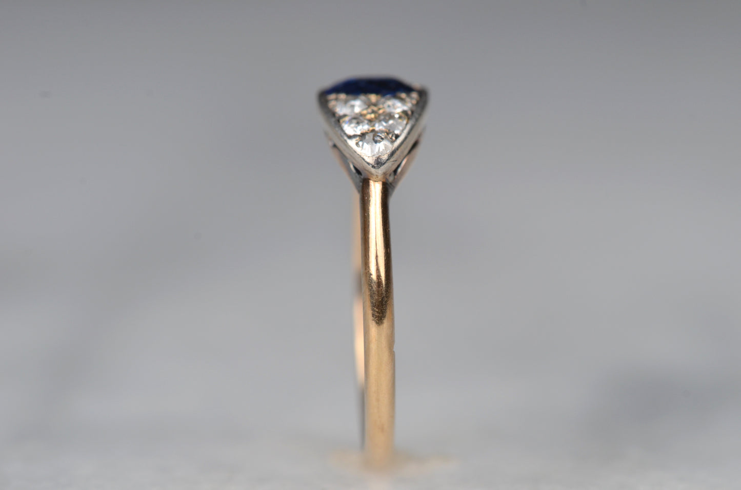Gorgeous and unique, this antique ring features a unique, east-west navette-shaped halo of diamonds around a single rich cushion-shaped sapphire, evocative of a protective eye. For centuries, white metals have been used to set diamonds to brighten their appearance - as of the 20th century, this has primarily been done in white gold and platinum, but before those options were available to jewellers it was silver that fit the bill and commonly topped yellow gold rings. We love these combinations of two-tone metals for the ease with which they blend into any jewelry collection and the way they tie together a mixed metal look.