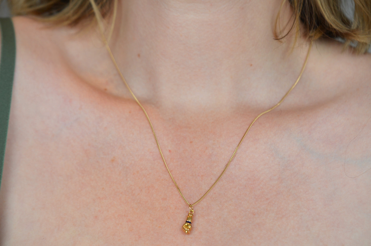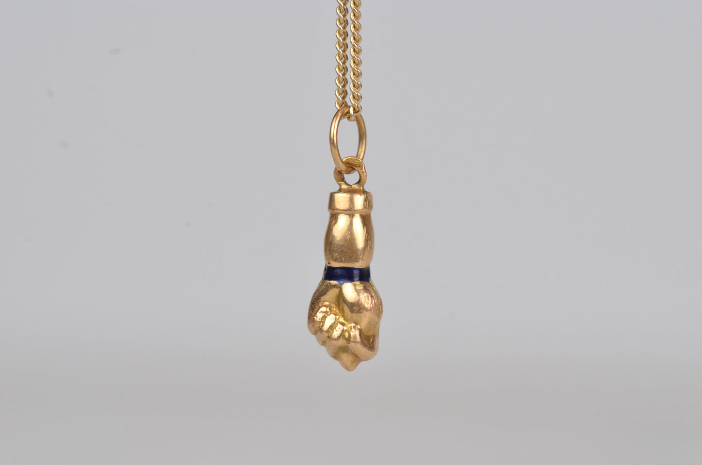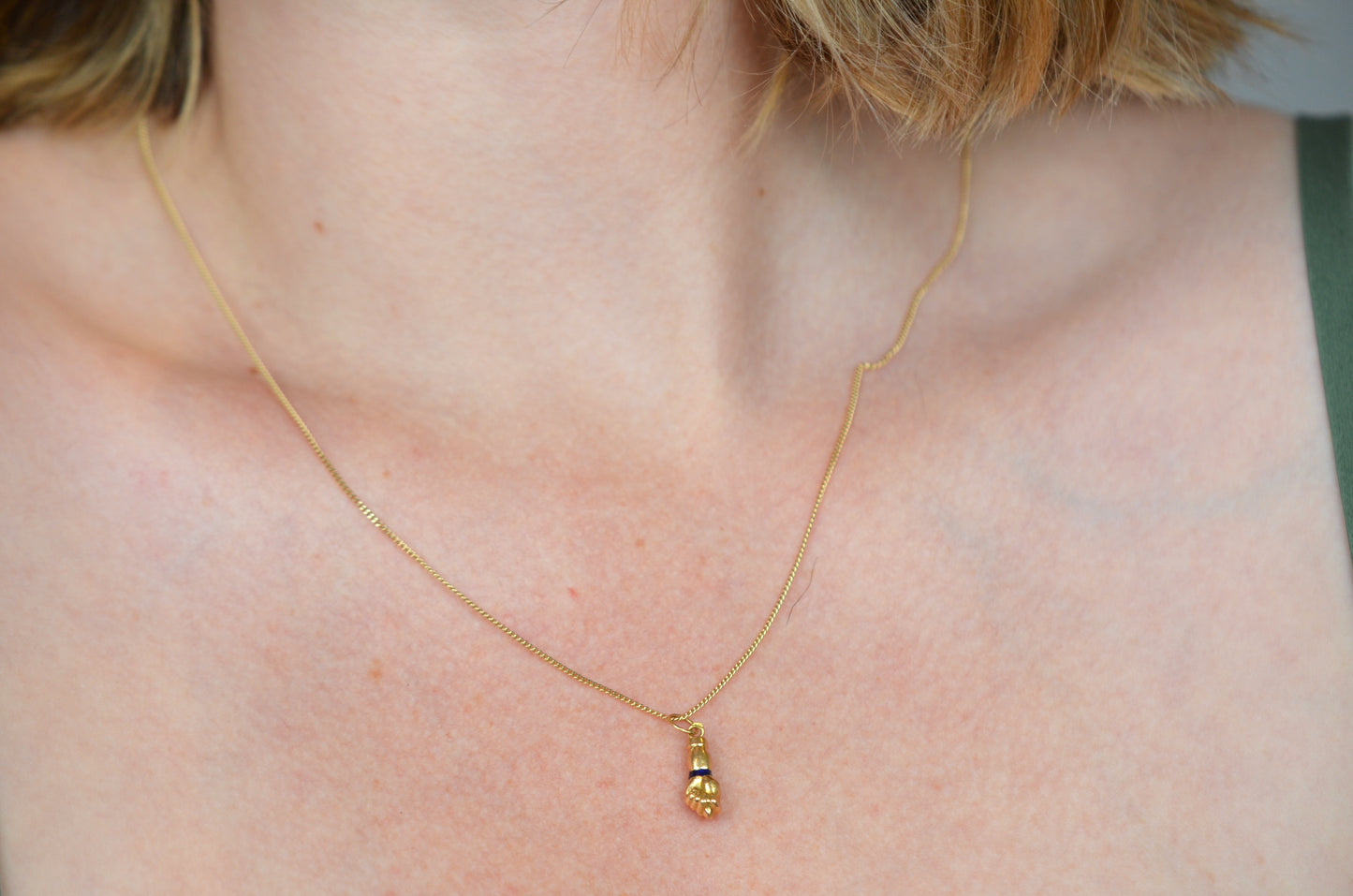 The mano figa (figa being Italian for fig, slang for female genitalia) comes to us as a talisman from Etruscan Italy, though the sign has been used as an obscene gesture throughout cultures for nearly 8,000 years. In ancient times, the amulet was worn as an invocation of fertility and virility, particularly through its reference to femininity. Around the 17th century, the talismans began to rise in popularity in South America - particularly Peru and Brazil - and the symbol is often worn to ward off the evil eye: the gesture is so obscene that it will even distract Satan.