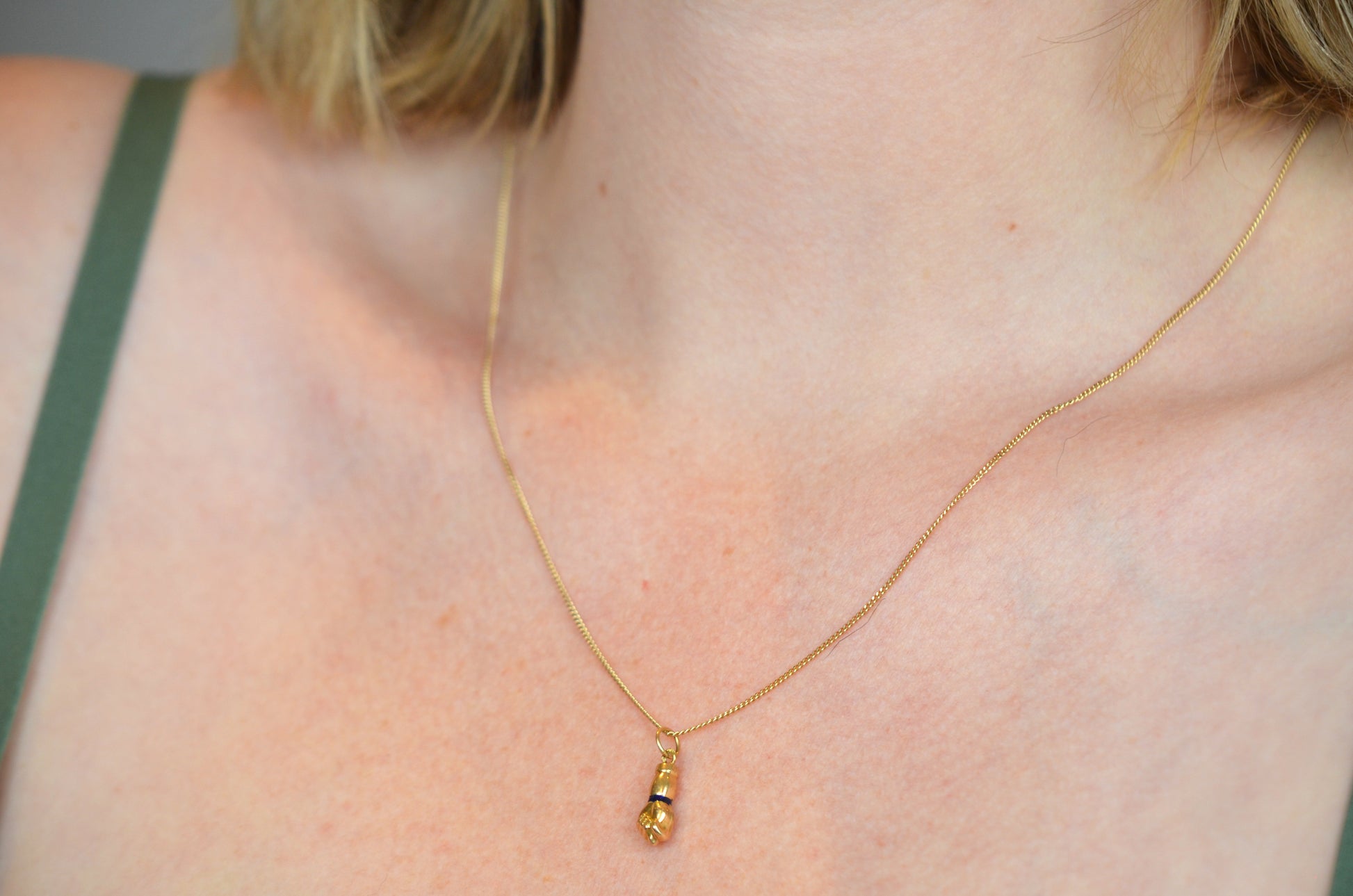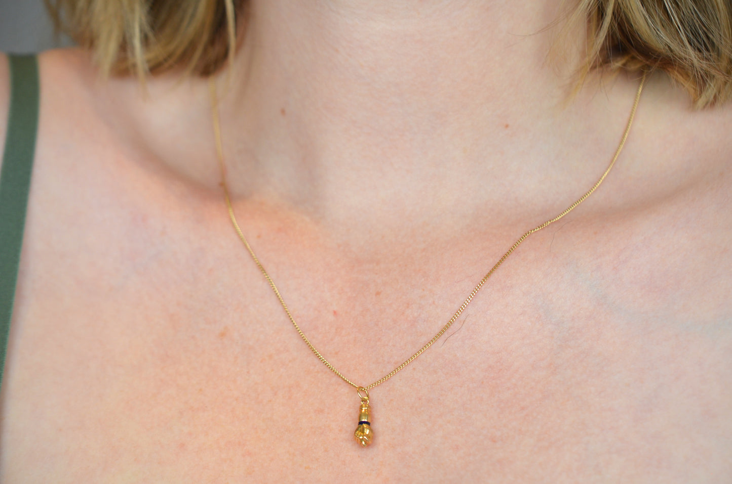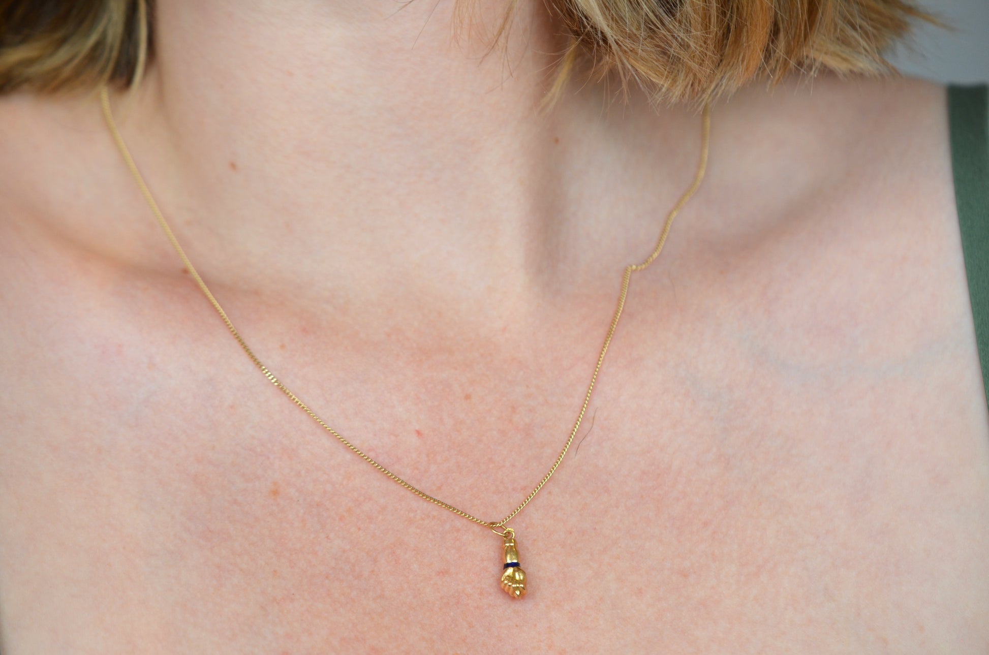 The mano figa (figa being Italian for fig, slang for female genitalia) comes to us as a talisman from Etruscan Italy, though the sign has been used as an obscene gesture throughout cultures for nearly 8,000 years. In ancient times, the amulet was worn as an invocation of fertility and virility, particularly through its reference to femininity. Around the 17th century, the talismans began to rise in popularity in South America - particularly Peru and Brazil - and the symbol is often worn to ward off the evil eye: the gesture is so obscene that it will even distract Satan.