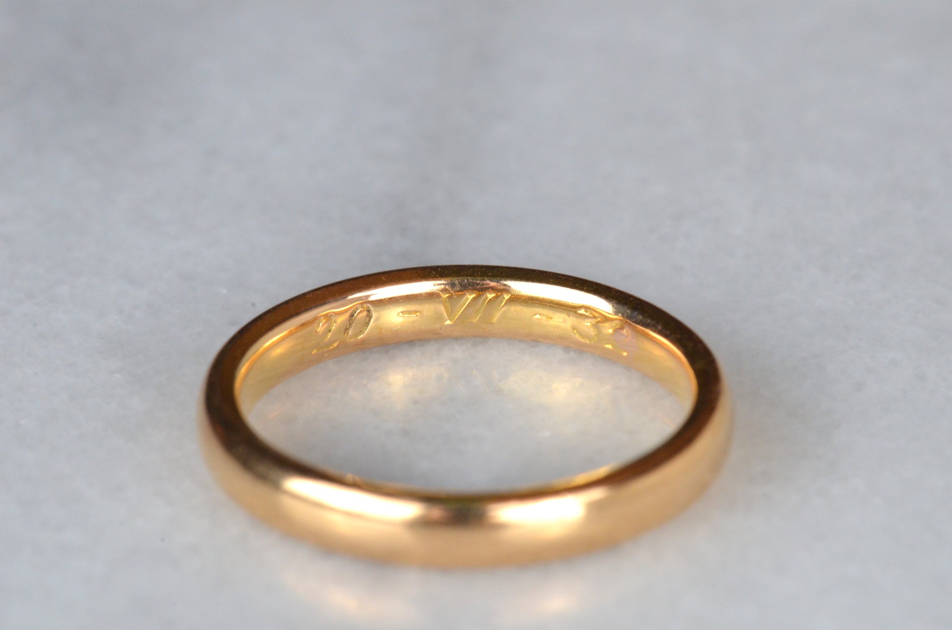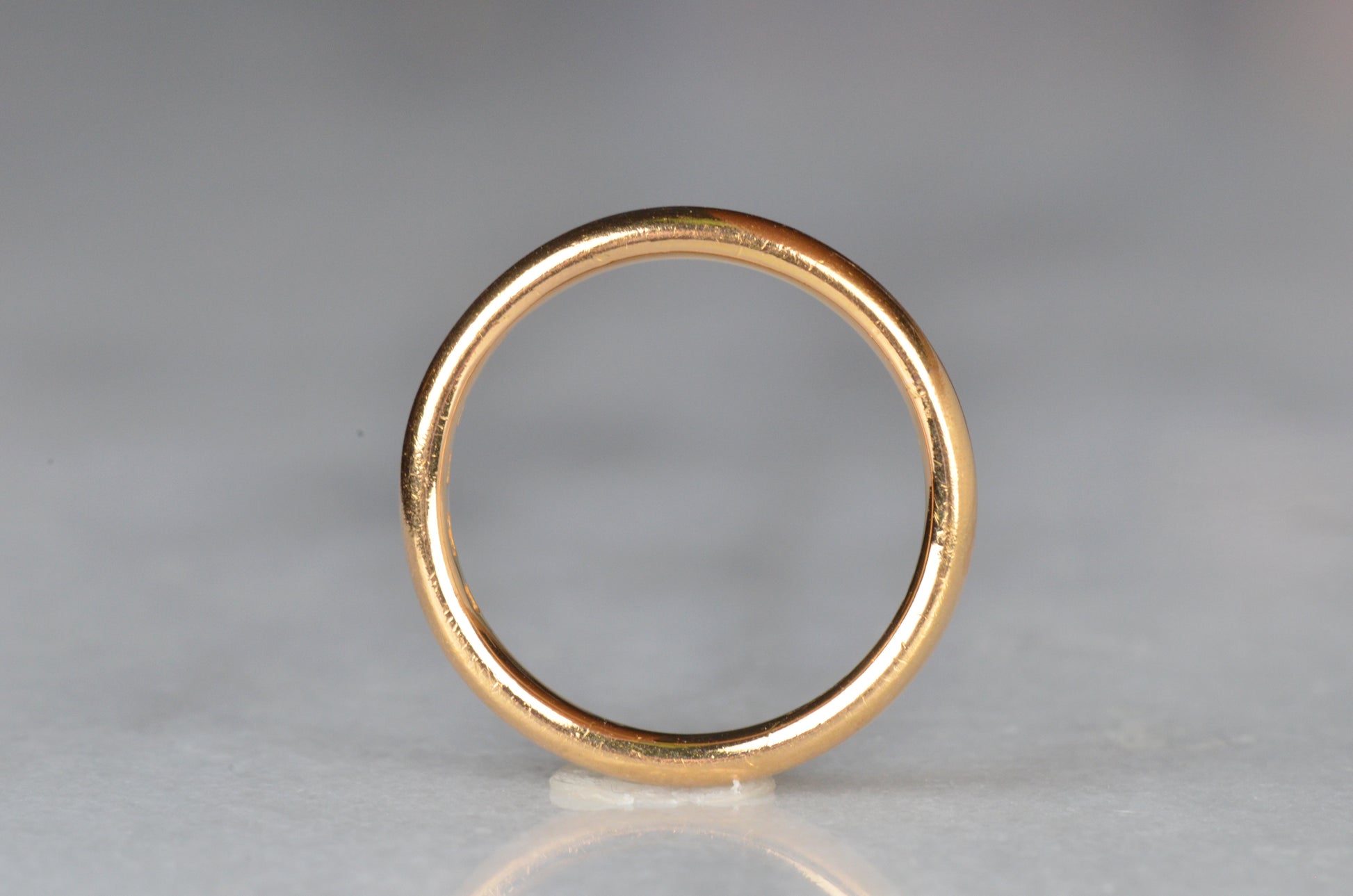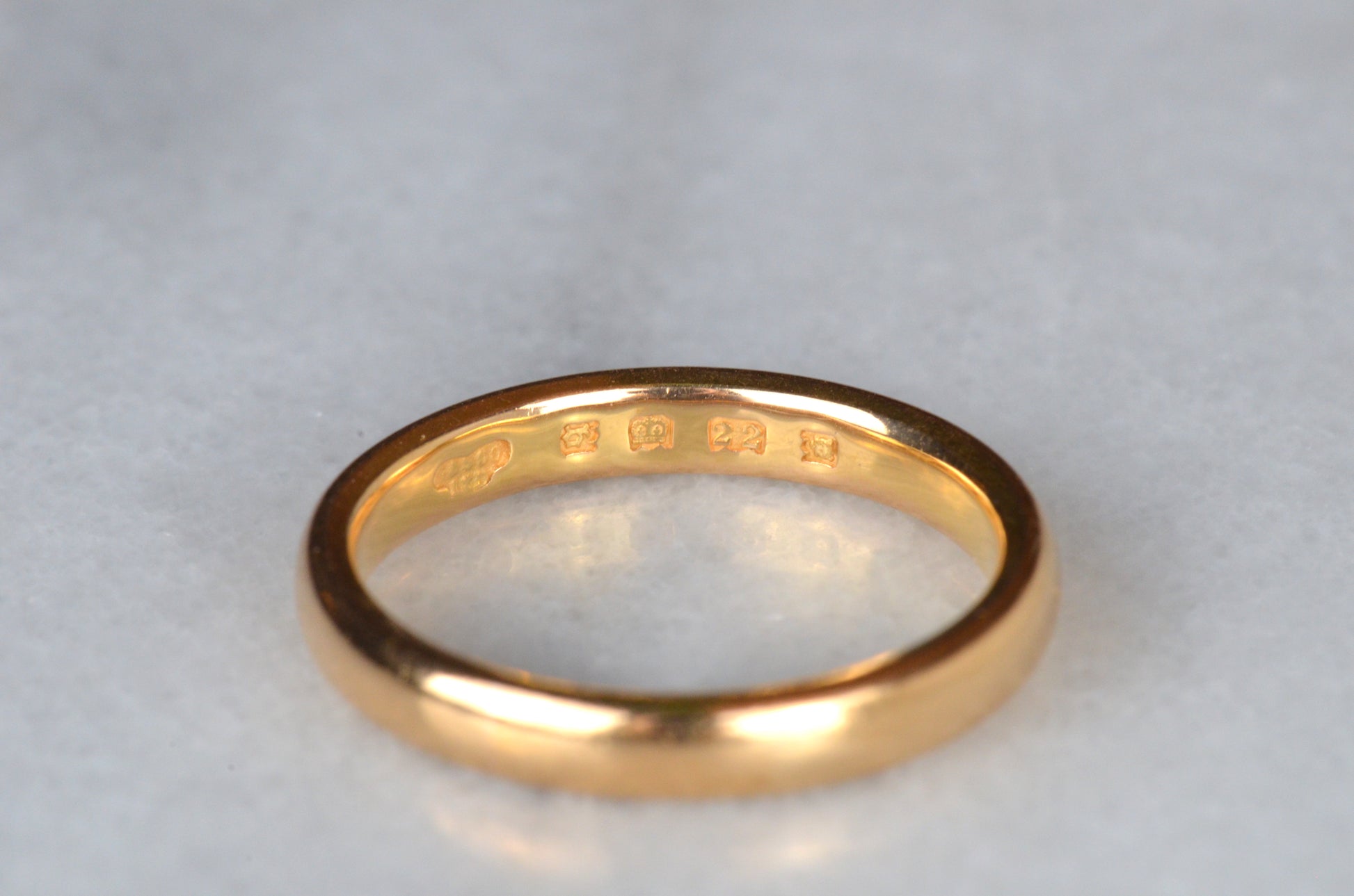 An utterly perfect and timeless 22k band with a little history to set it apart. The half round band and easy comfort fit make this ring a no-brainer as a wedding band or stacking ring, while the stamps and engravings inside tell a story. A hand engraving for July 20, 1932 marks a special occasion (likely a marriage), while the hallmarks for London 1931 tell us even more. The ring bears the stamp for Goldsmiths & Silversmiths Co., a respected London outfit founded in 1880. Crafting their own jewelry, silverware, and clocks as well as retailing other brands for decades, in 1952 they were purchased by and folded into Garrard & Co. Ltd. - known around the world for being the first official Crown Jeweller of the UK.