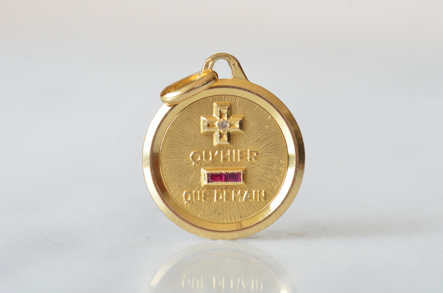 A beautiful vintage French love token, in a classic version. Originally created by Alphonse Augis c.1907, and inspired by a letter poet Rosemonde Gérard wrote to her husband, the writer Edmond Rostand, the pendant features a rebus reading "+ qu'hier - que demain" for the lines,
