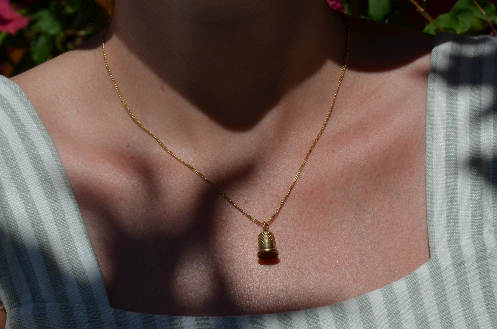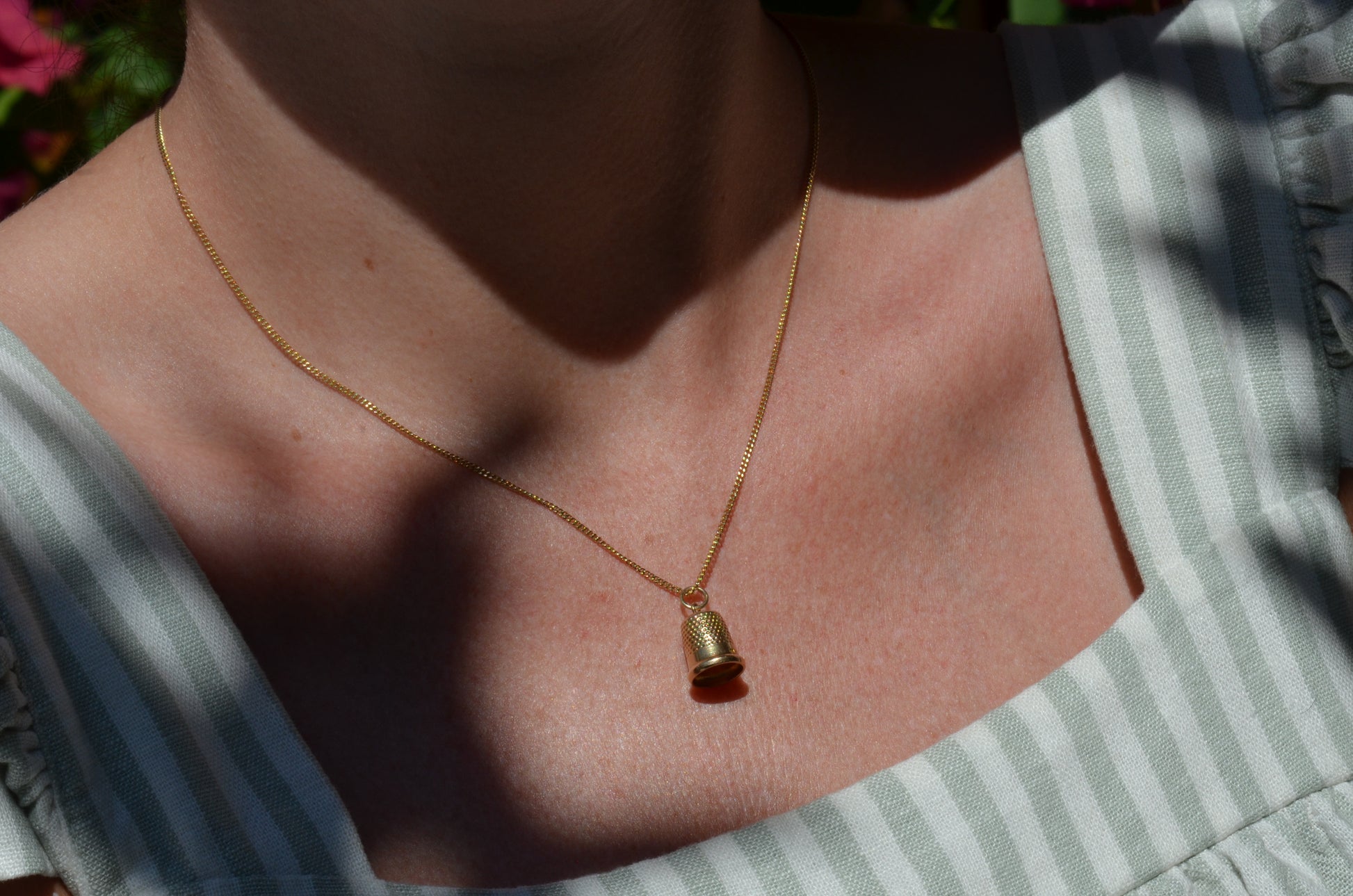 A sweet miniature pendant styled as a thimble, perfect for the designer, the maker, or the mender in your life! Made of solid gold, and a reminder to take care of yourself (as a protective piece of armour), and to respect the thoughtfulness and effort that goes into crafting a garment with care, and preserving the life of that piece.