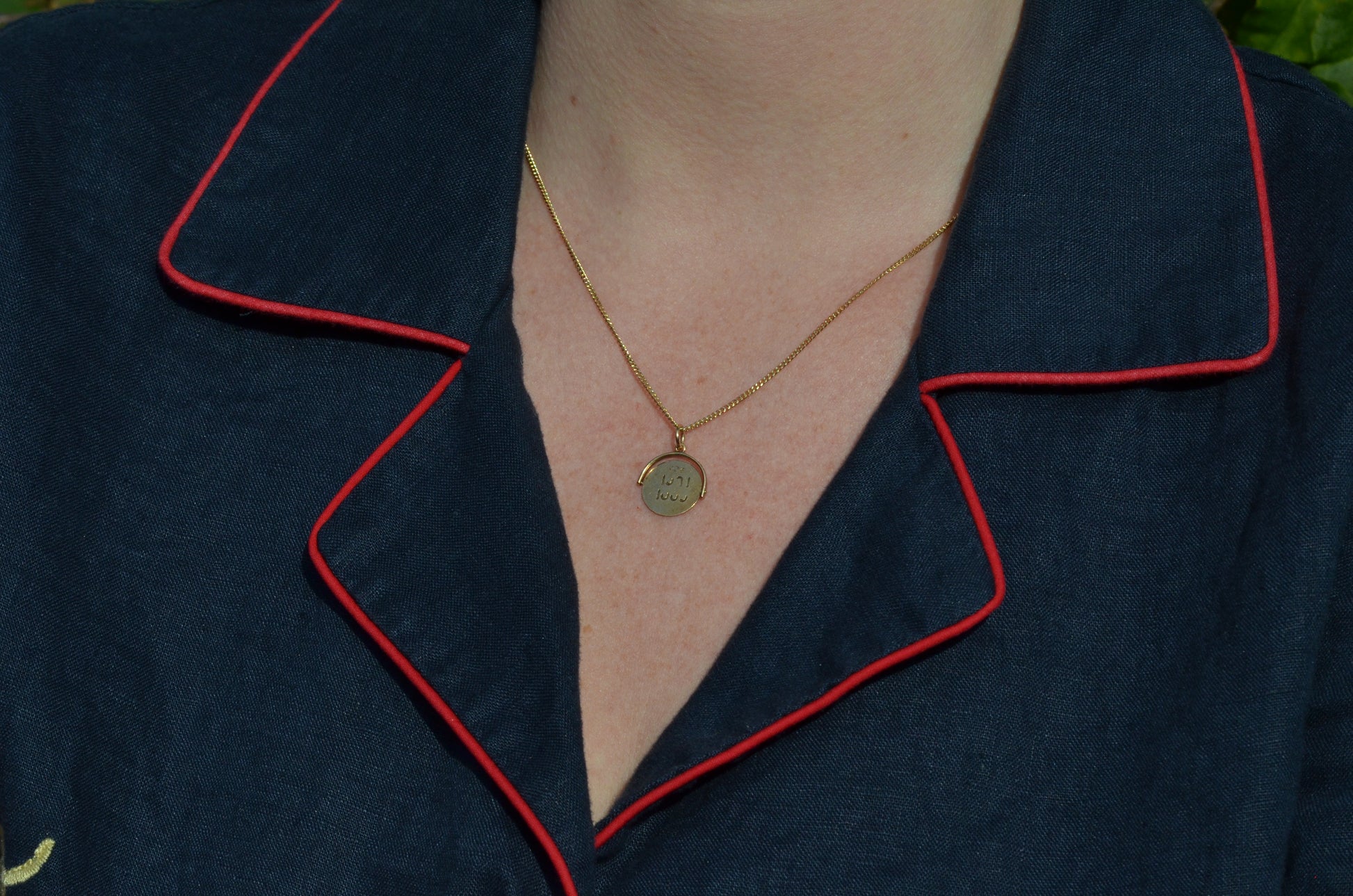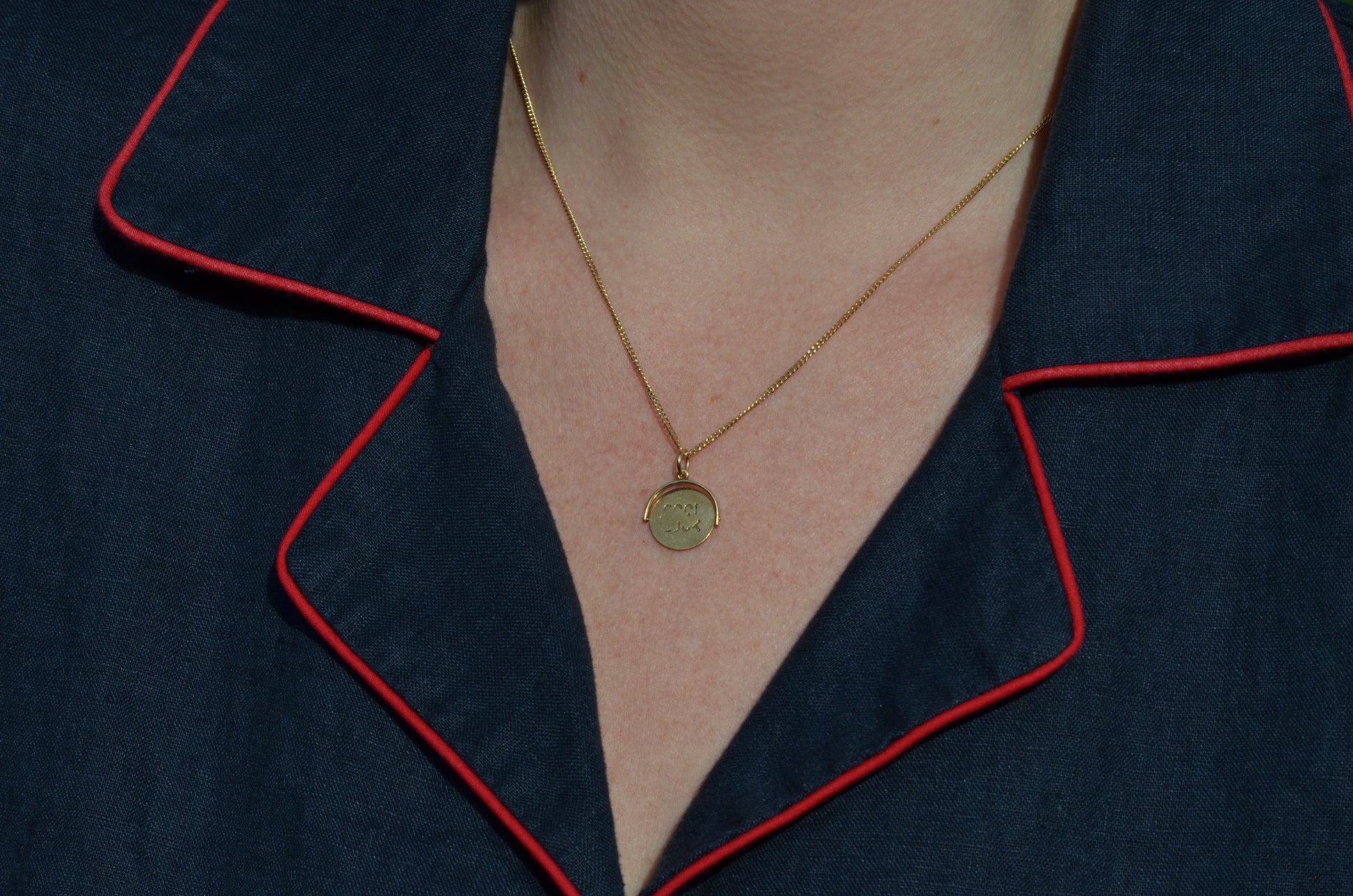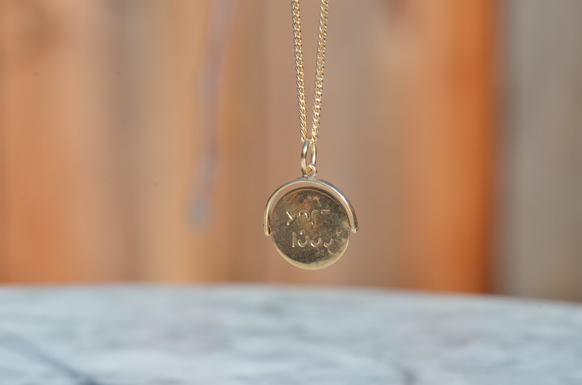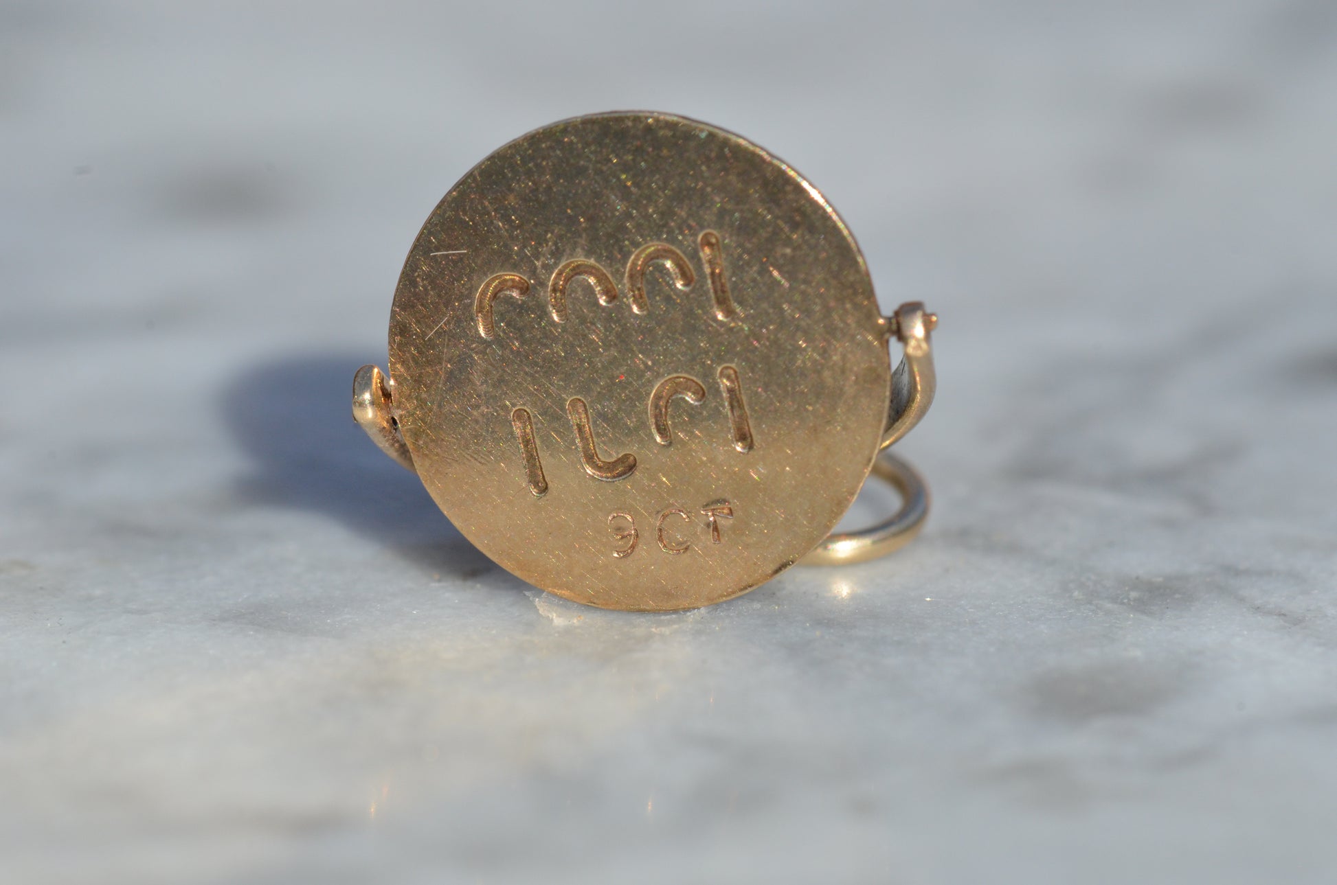 Swiiiiiiiiing and a miss! These spinners, usually so meticulously crafted to show just a portion of each letter on either side of the disc so that they can only be read in motion (a text-based thaumatrope) have always delighted us but this one arrived and proved itself to be a flop that struck a little too close to home to melt. Aptly an attempt at the phrase "Good Luck," some poor midcentury goldsmith mistakenly applied those portions the wrong way, so spin as you might it will never resolve into anything other than gibberish. How did it make it out of the workshop? How has it survived the melt pile for some 75 years? How am I taking chances sourcing items based on a single image that really doesn't communicate nuance? How does this charm feel like the encapsulation of trying to run a small business or surviving in the modern world, just trying to do our best with what we've got and hoping others will love us just as we are, significant flaws and all? Anyways, I thought there may be someone else out there who felt as tender towards this charm as I do.
