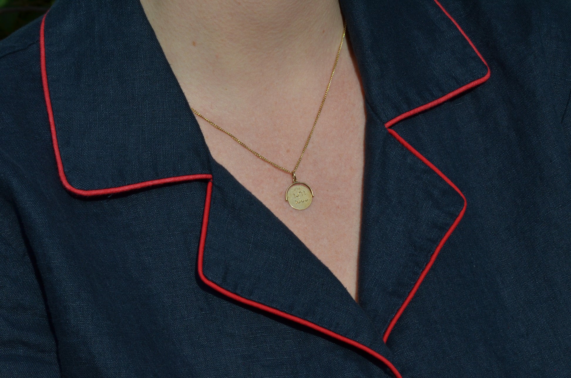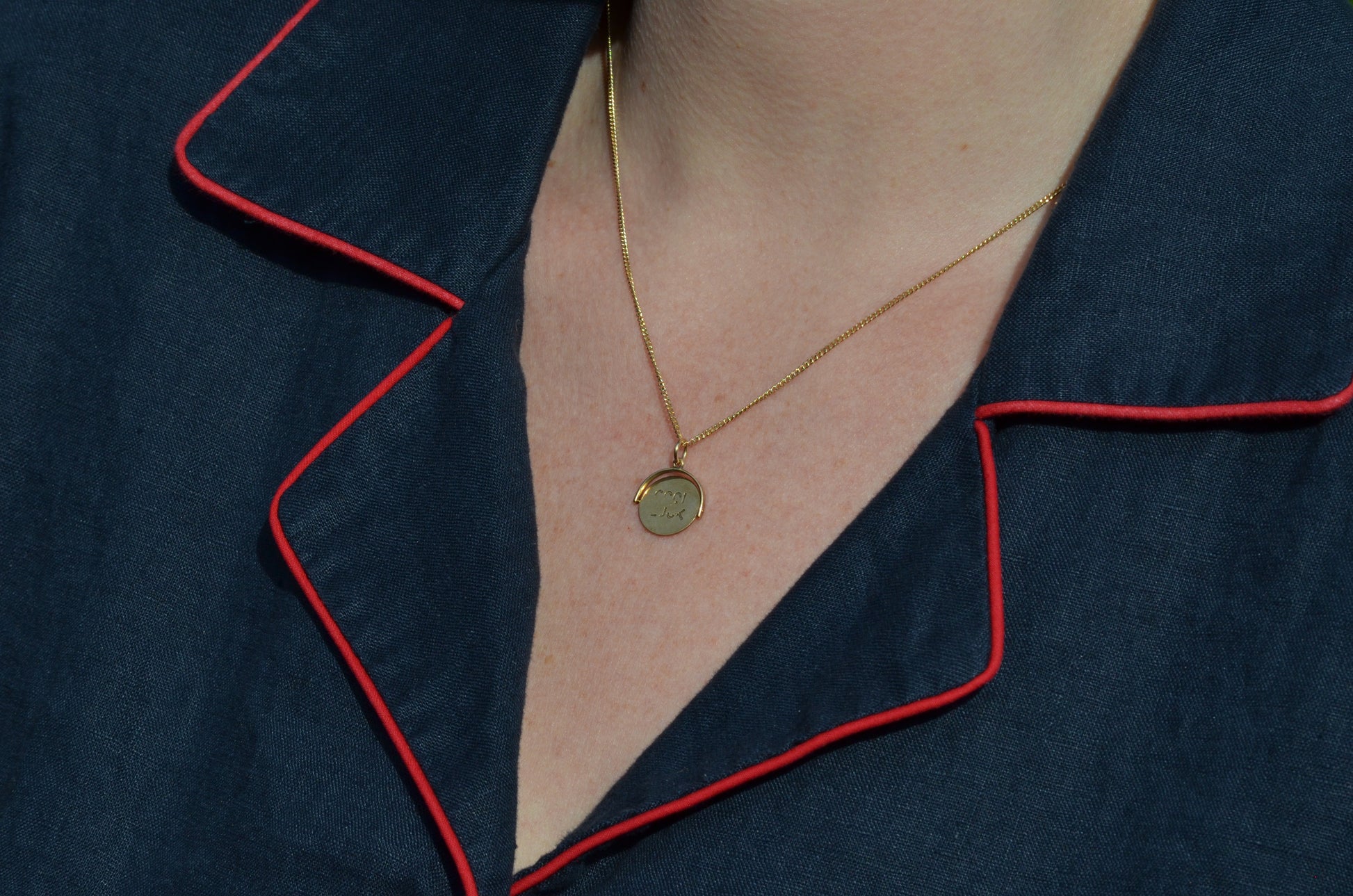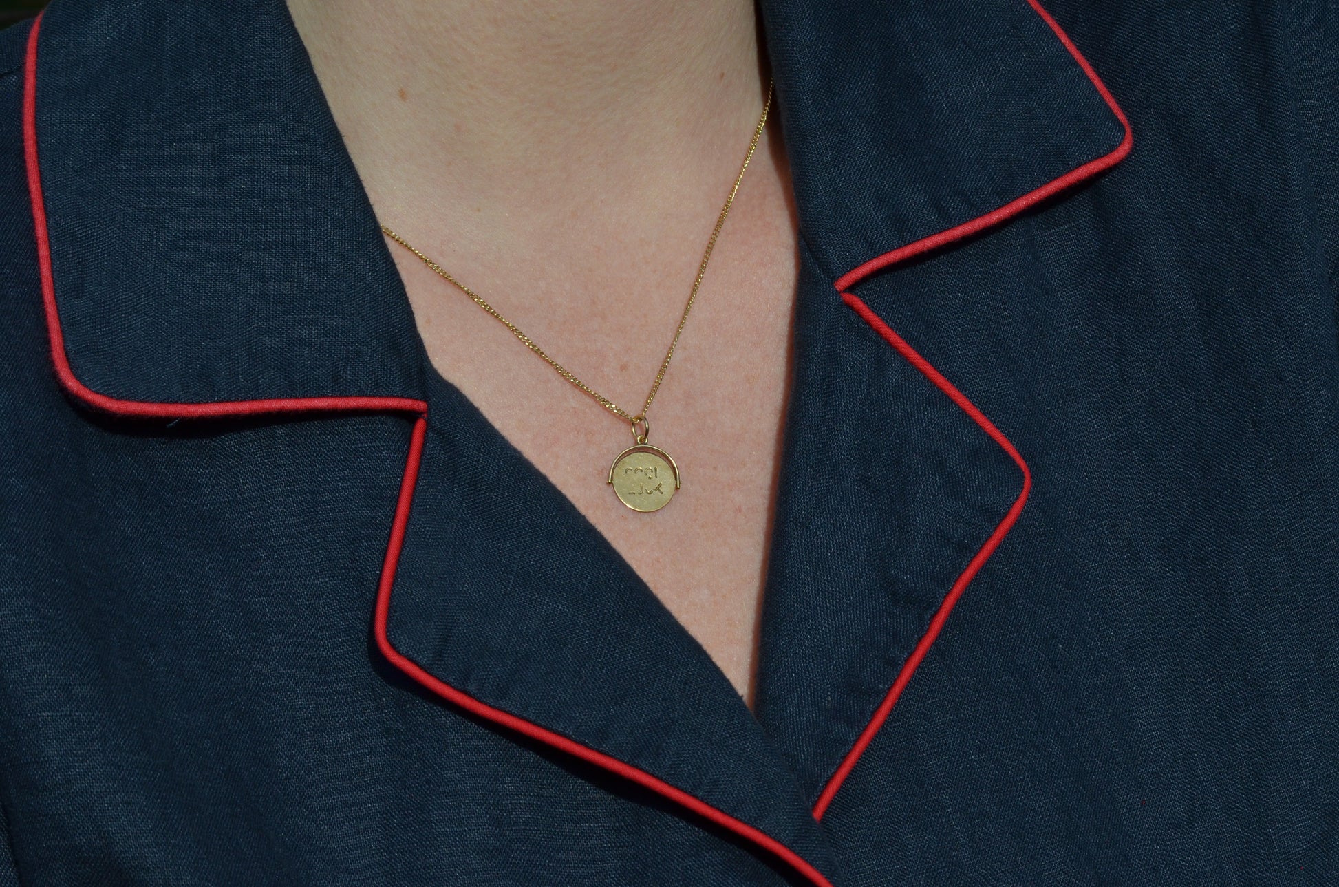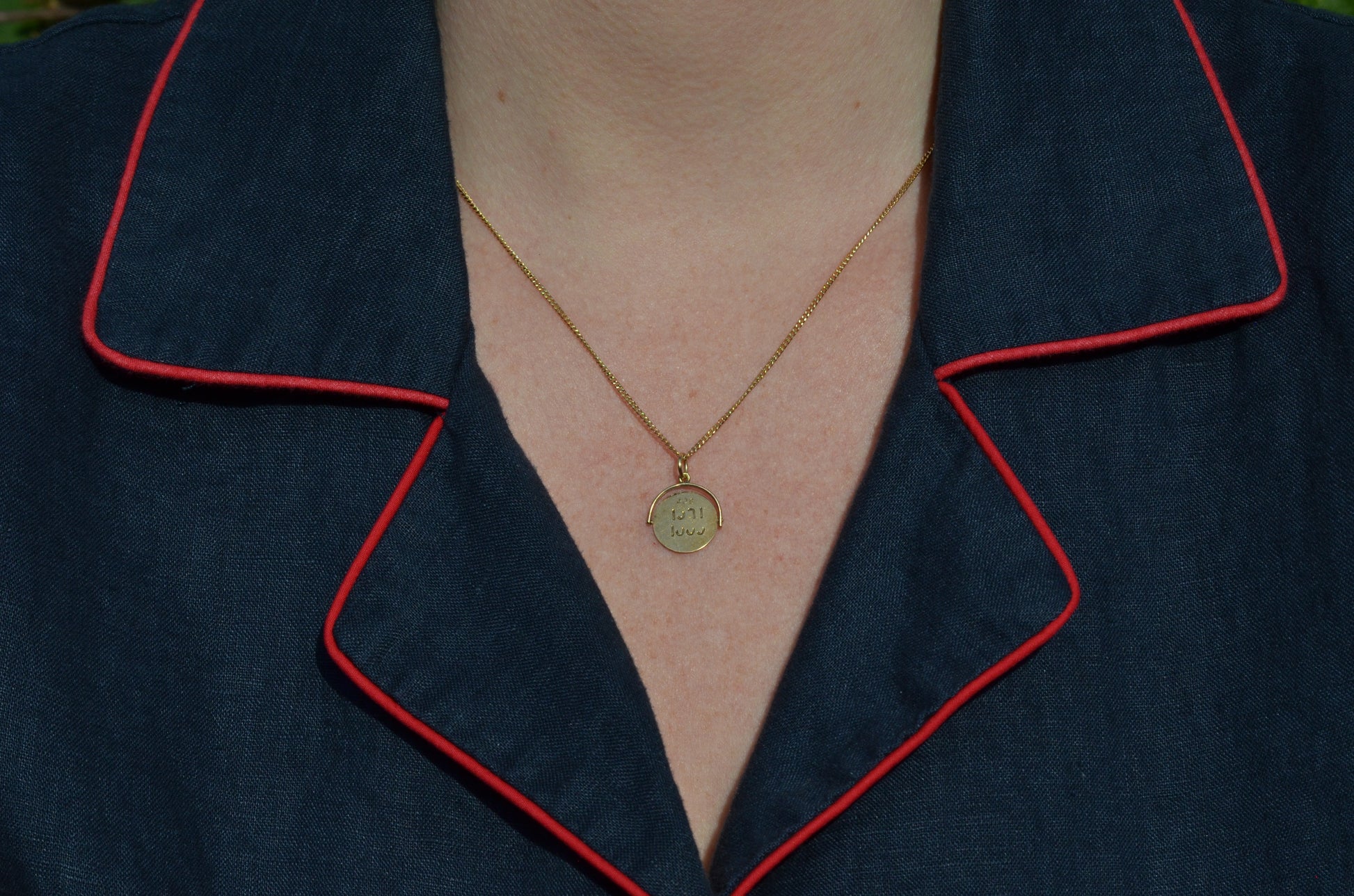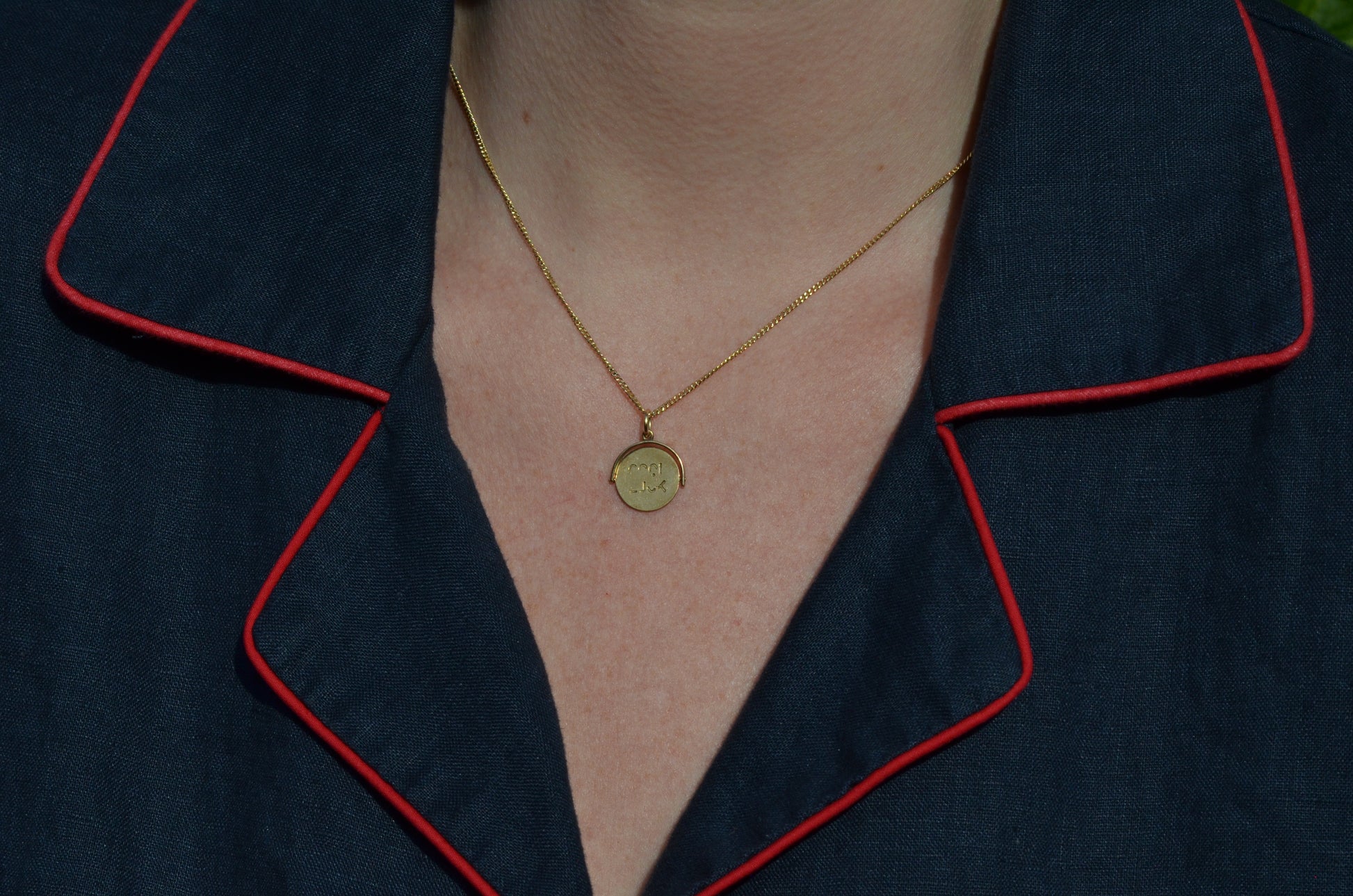 Swiiiiiiiiing and a miss! These spinners, usually so meticulously crafted to show just a portion of each letter on either side of the disc so that they can only be read in motion (a text-based thaumatrope) have always delighted us but this one arrived and proved itself to be a flop that struck a little too close to home to melt. Aptly an attempt at the phrase "Good Luck," some poor midcentury goldsmith mistakenly applied those portions the wrong way, so spin as you might it will never resolve into anything other than gibberish. How did it make it out of the workshop? How has it survived the melt pile for some 75 years? How am I taking chances sourcing items based on a single image that really doesn't communicate nuance? How does this charm feel like the encapsulation of trying to run a small business or surviving in the modern world, just trying to do our best with what we've got and hoping others will love us just as we are, significant flaws and all? Anyways, I thought there may be someone else out there who felt as tender towards this charm as I do.
