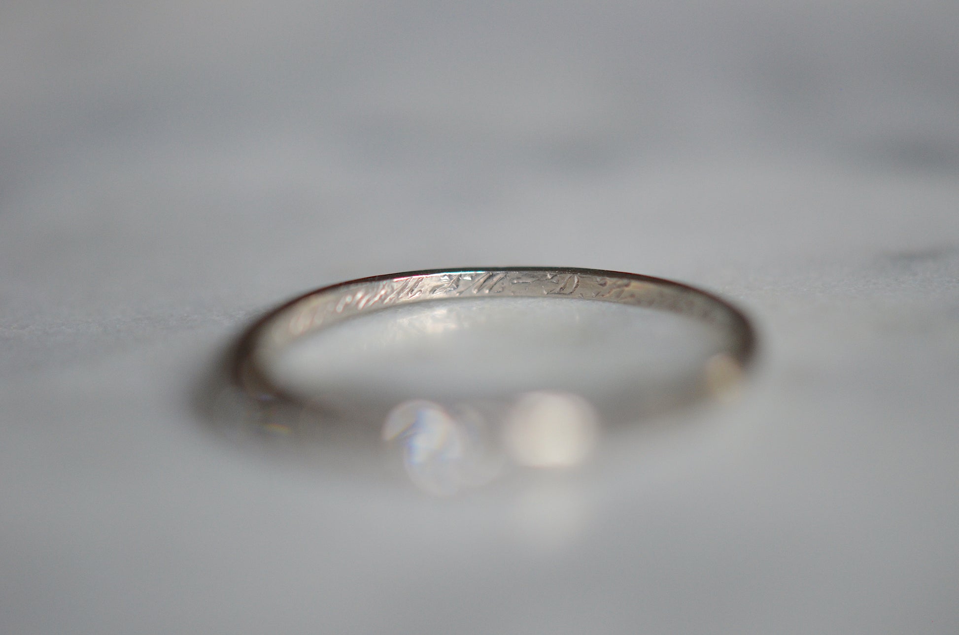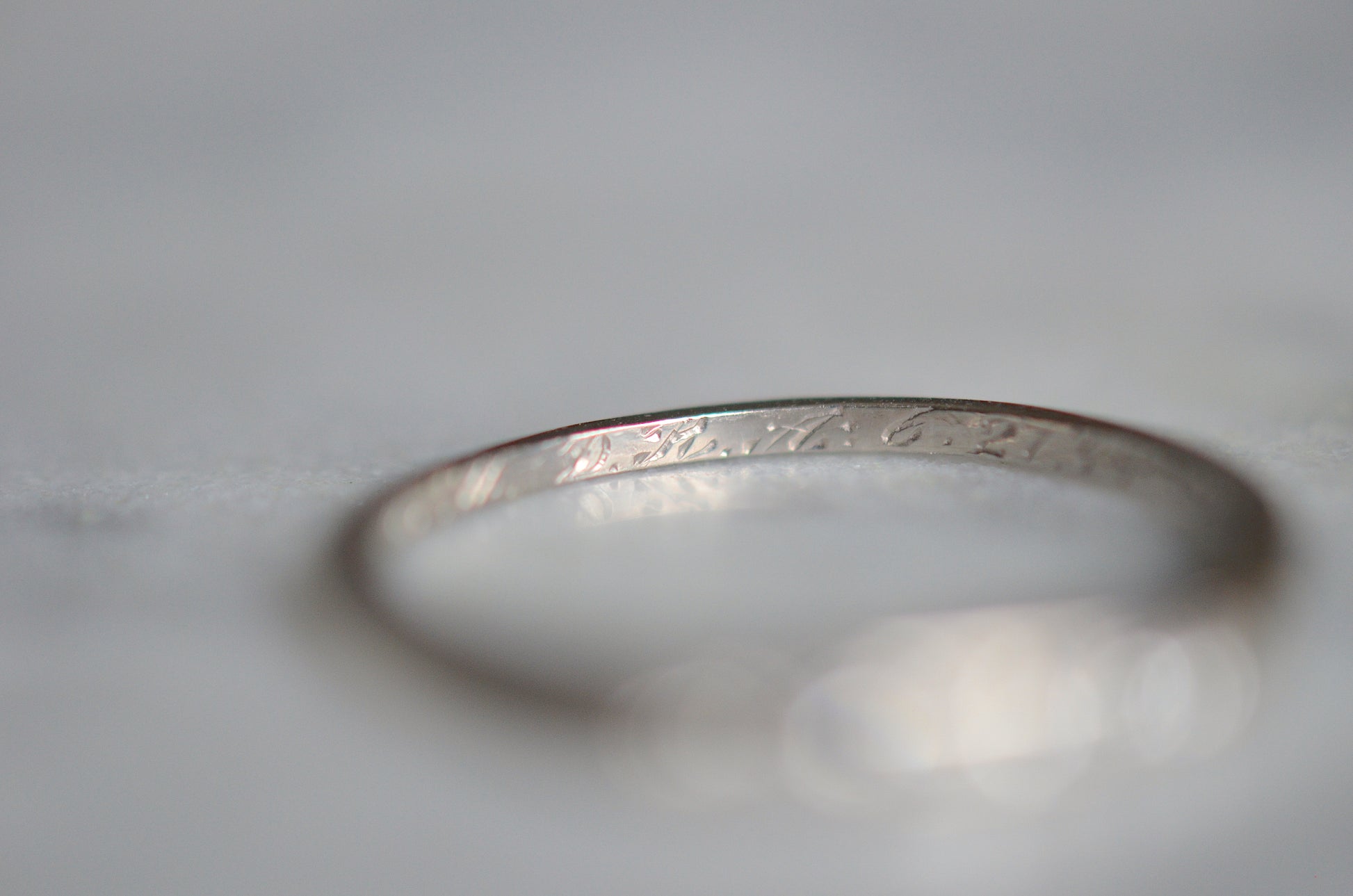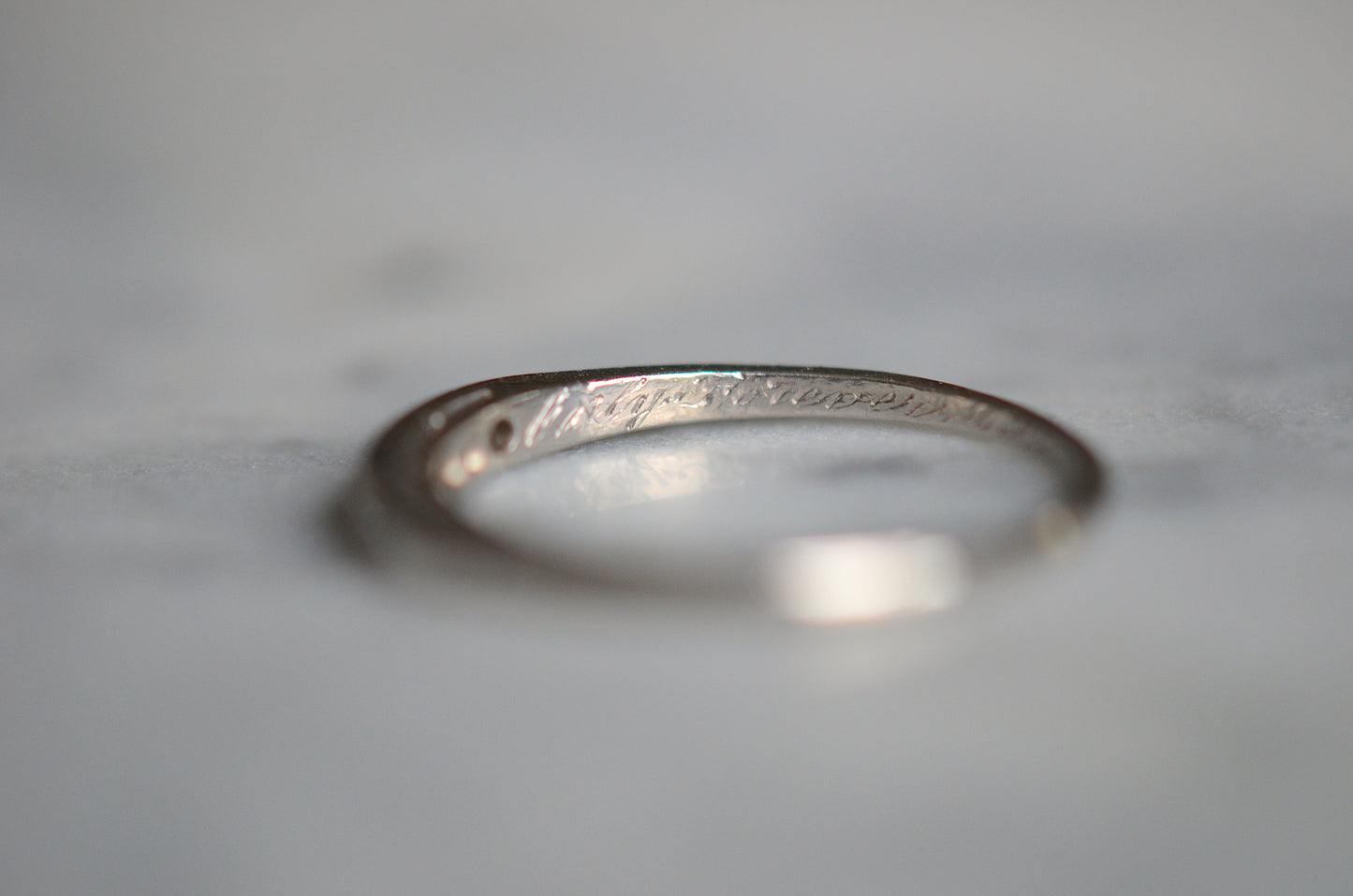 A sweet little piece of history, this band bears the stamps of its time both in medium and message. The wedding band is crafted in an alloy of ruthenium-palladium (both members of the platinum family), an alternative not often used but available at the time, as platinum and components of white gold were restricted in civilian use through the second World War. The inscription has well, though difficult to read (it appears that perhaps the ring was stretched after having been engraved), has the date June 27, 1944, along with a pair of initials and the phrase, "Only Forever."