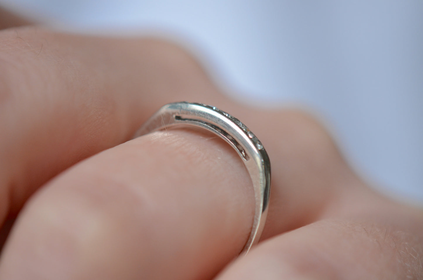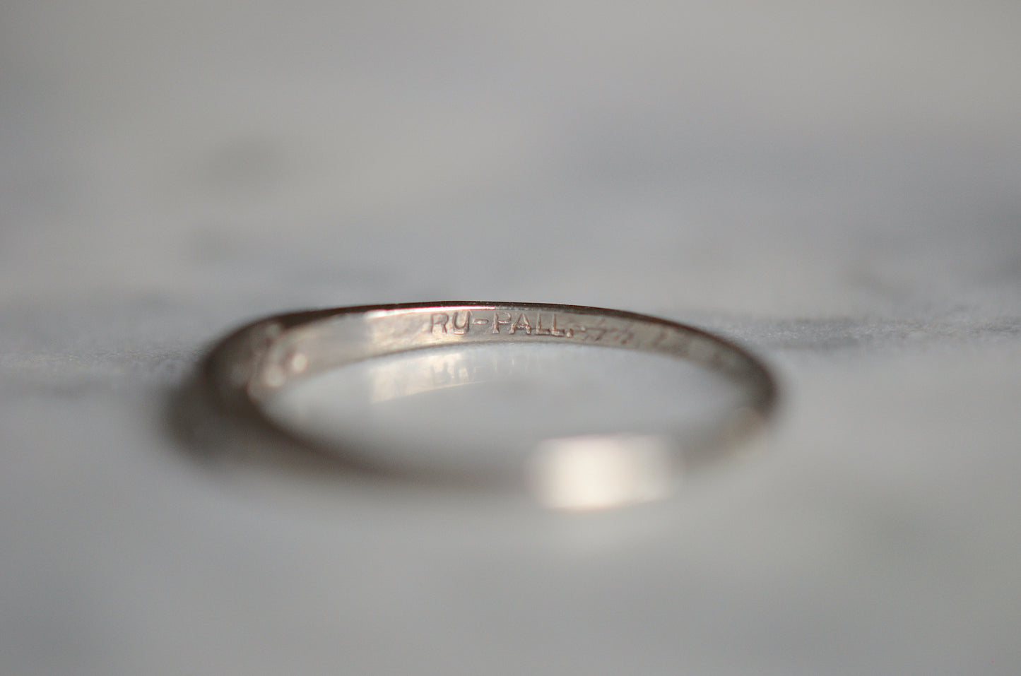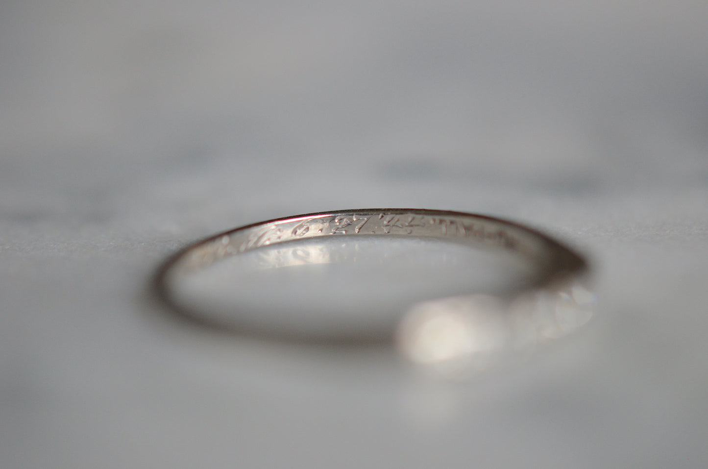 A sweet little piece of history, this band bears the stamps of its time both in medium and message. The wedding band is crafted in an alloy of ruthenium-palladium (both members of the platinum family), an alternative not often used but available at the time, as platinum and components of white gold were restricted in civilian use through the second World War. The inscription has well, though difficult to read (it appears that perhaps the ring was stretched after having been engraved), has the date June 27, 1944, along with a pair of initials and the phrase, "Only Forever."