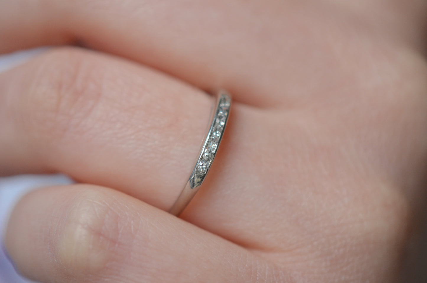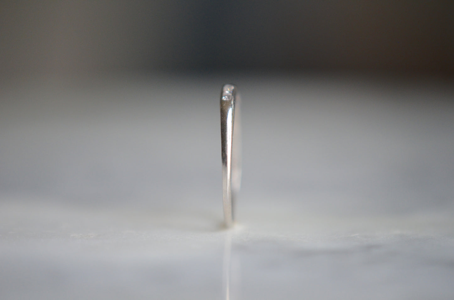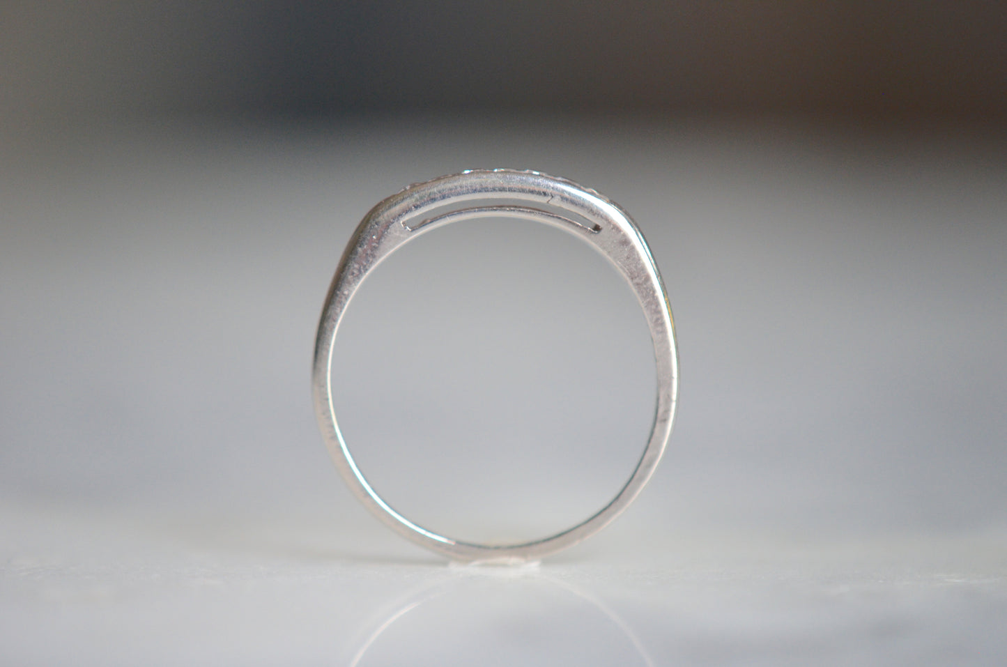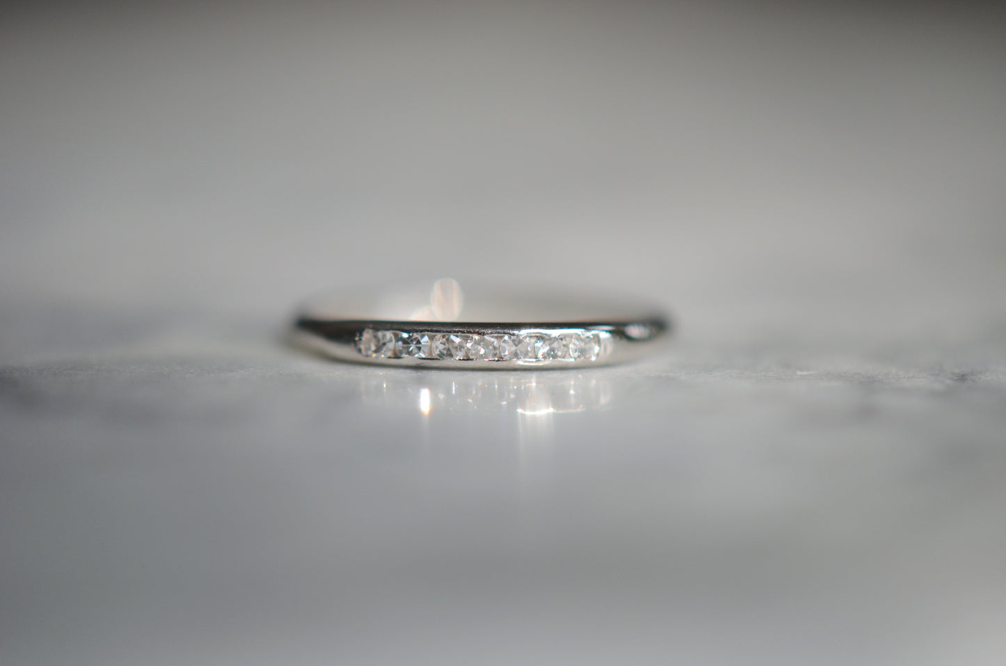 Minimalist yet romantic, this ring has a clean and modern look with an old-school secret tucked inside. Seven single cut diamonds provide just the right about of sparkle, nestled in a slim channel setting.