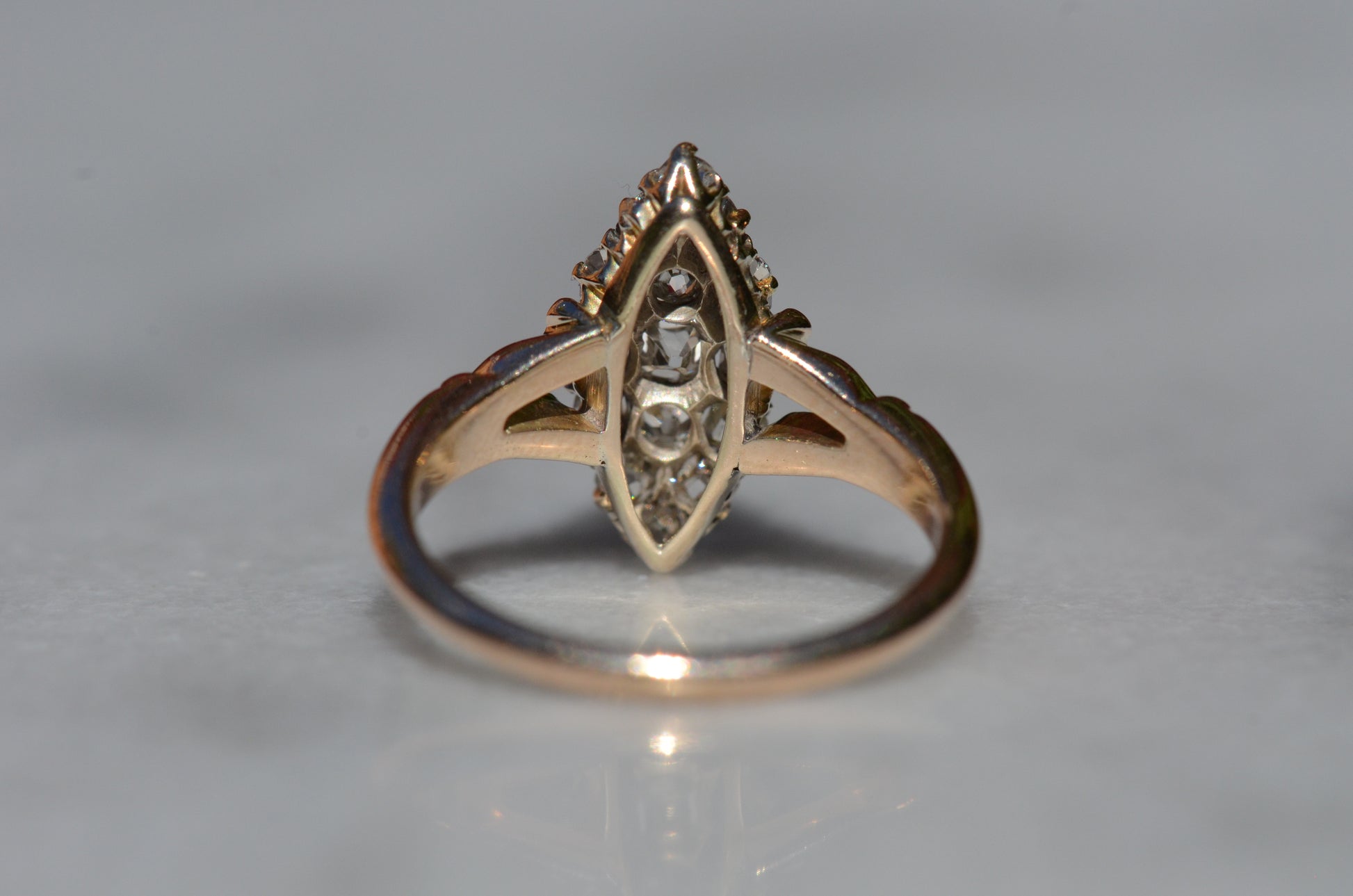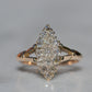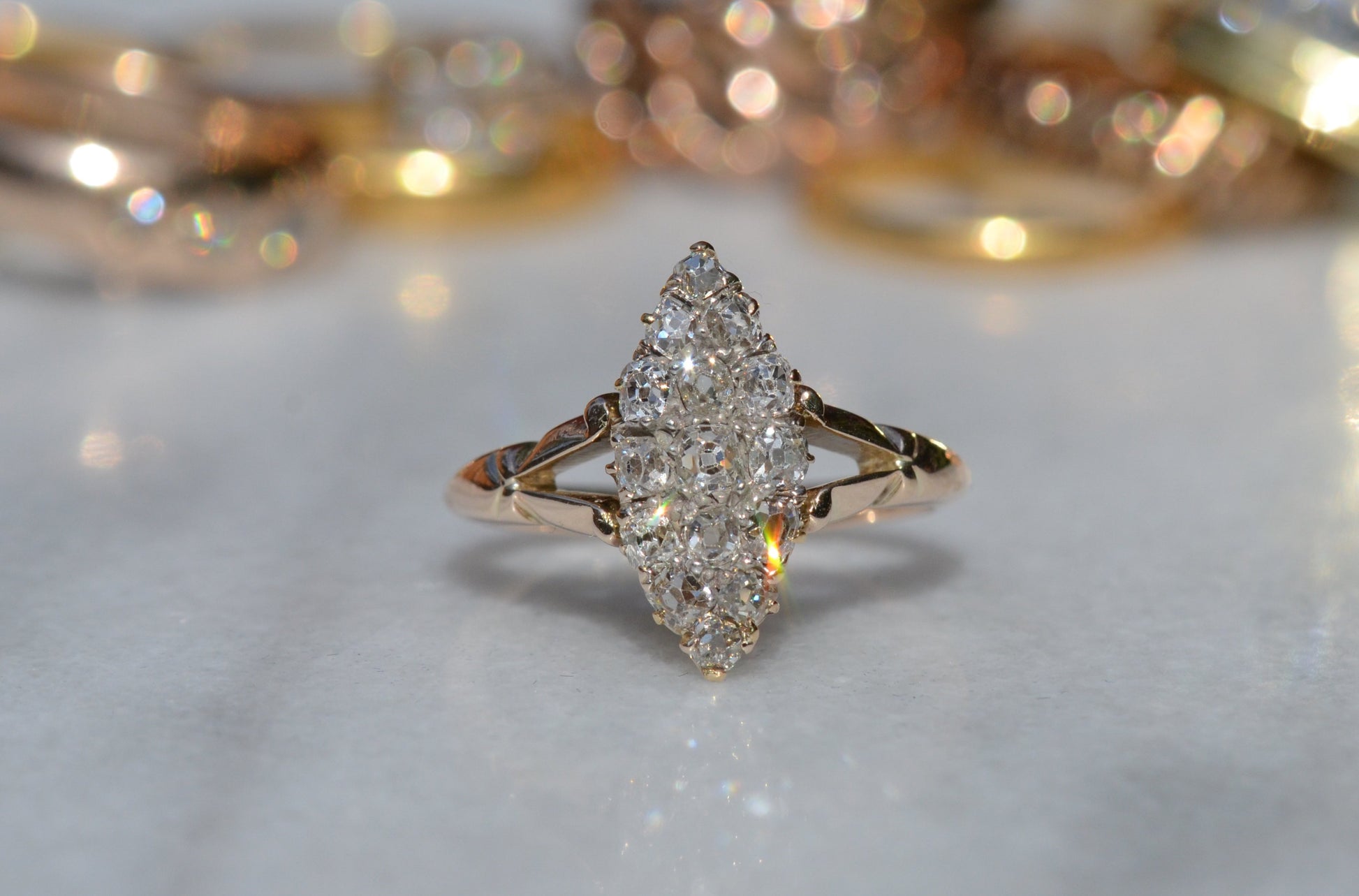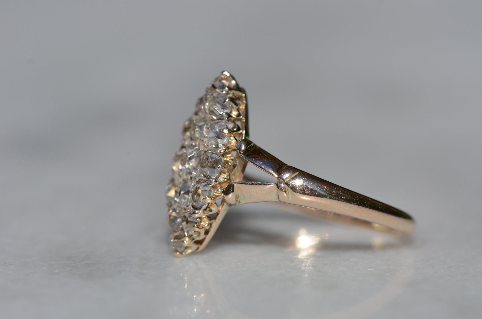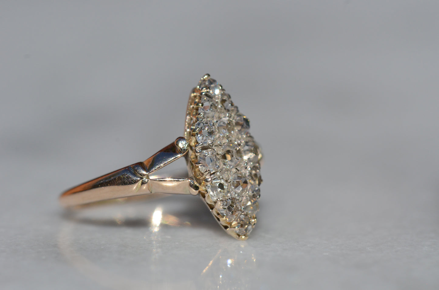 The navette - French for little boat - is a style of cluster ring with a distinct elongated shape tapered at both ends. Set north-south on a band like this, the design is beloved for the finger-lengthening effect and vivid sparkle of a cluster alike. The chunky old mine and Peruzzi cut diamonds, hand-facetted by master diamond cutters, were designed to maximize the yield of the rough diamond and to sparkle under the common lighting conditions of the time - certainly in sunlight, though a ring like this was meant to truly come alive in evening by candlelight and lamplight. Big broad facets on deep stones catch the light and return vividly refracted and dispersed rainbows that will completely captivate you. While the silver face of the ring - commonly paired with yellow gold for centuries before the early 1900s introduction of platinum and white gold - brightens the diamonds, warmth is brought back in with a soft yellow gold band with charming split shoulders.