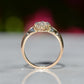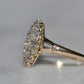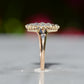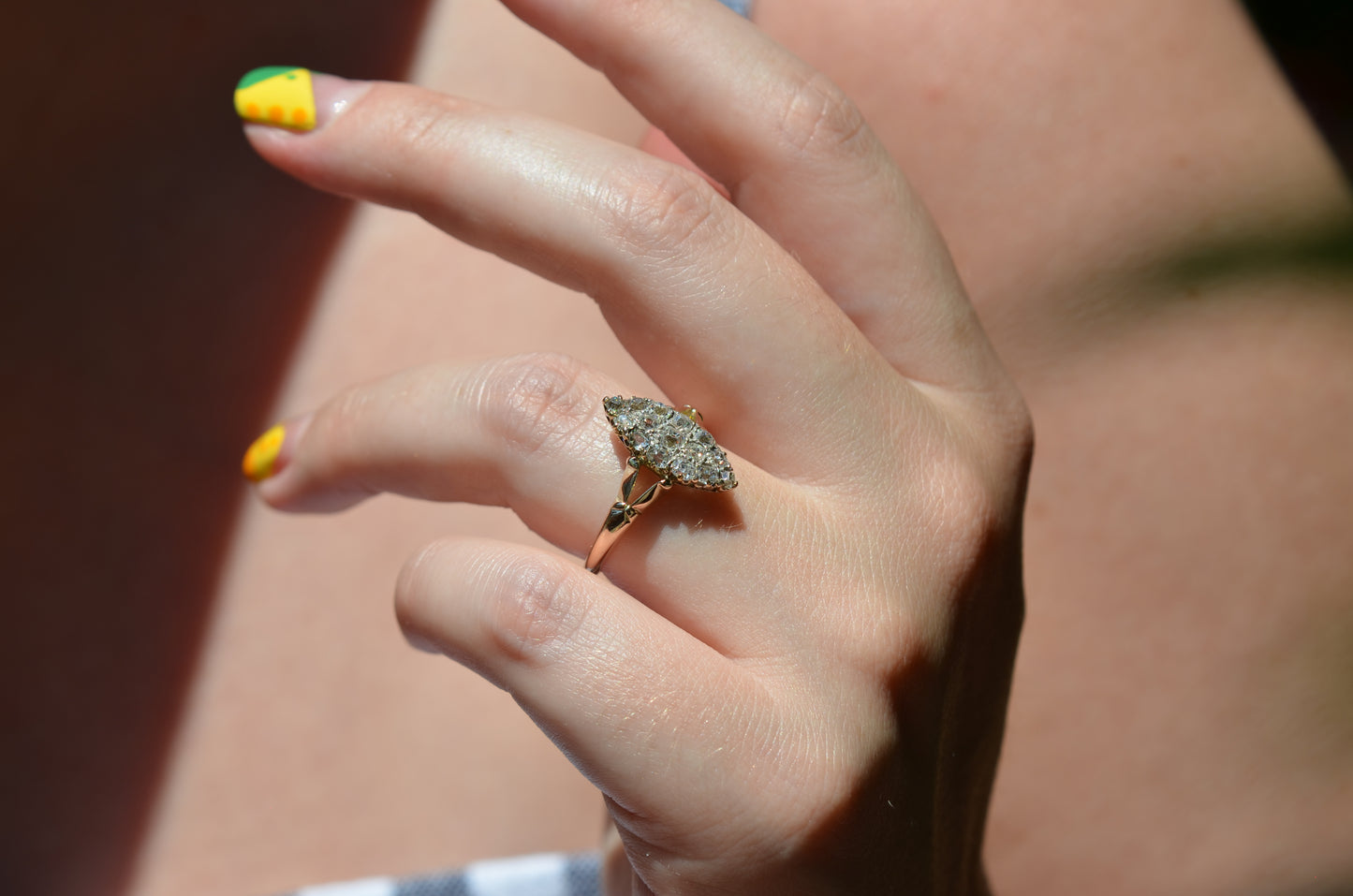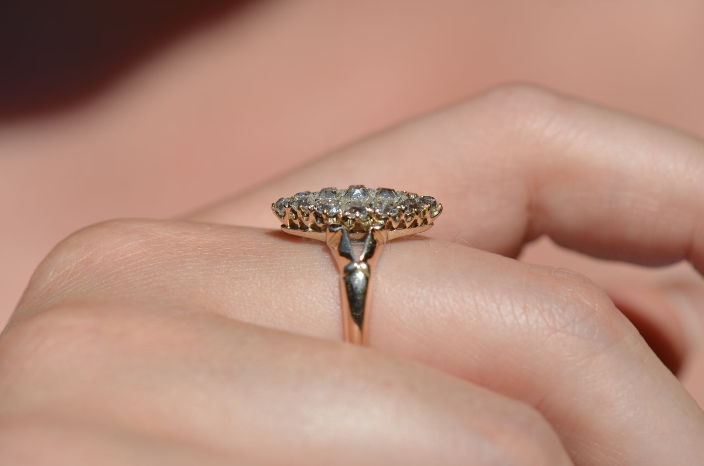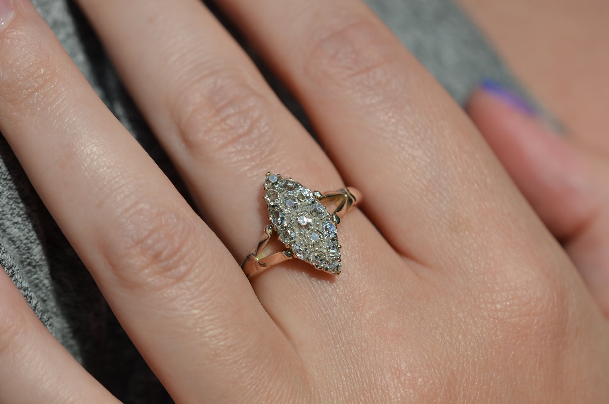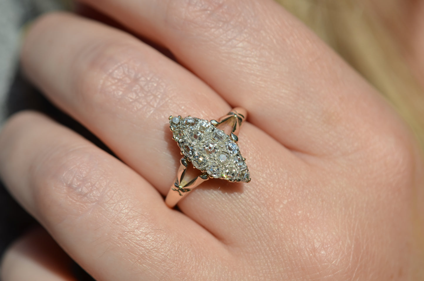 The navette - French for little boat - is a style of cluster ring with a distinct elongated shape tapered at both ends. Set north-south on a band like this, the design is beloved for the finger-lengthening effect and vivid sparkle of a cluster alike. The chunky old mine and Peruzzi cut diamonds, hand-facetted by master diamond cutters, were designed to maximize the yield of the rough diamond and to sparkle under the common lighting conditions of the time - certainly in sunlight, though a ring like this was meant to truly come alive in evening by candlelight and lamplight. Big broad facets on deep stones catch the light and return vividly refracted and dispersed rainbows that will completely captivate you. While the silver face of the ring - commonly paired with yellow gold for centuries before the early 1900s introduction of platinum and white gold - brightens the diamonds, warmth is brought back in with a soft yellow gold band with charming split shoulders.