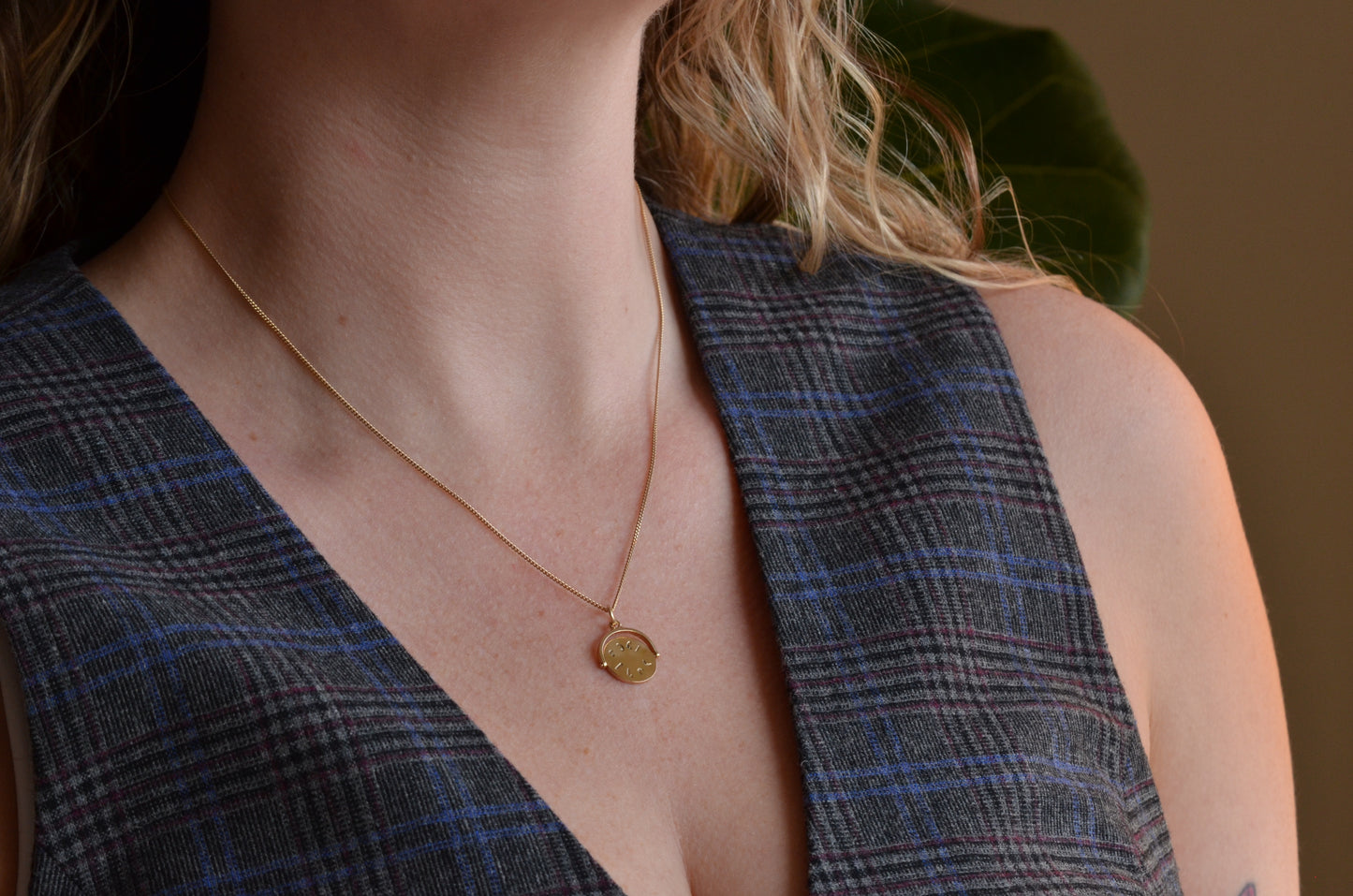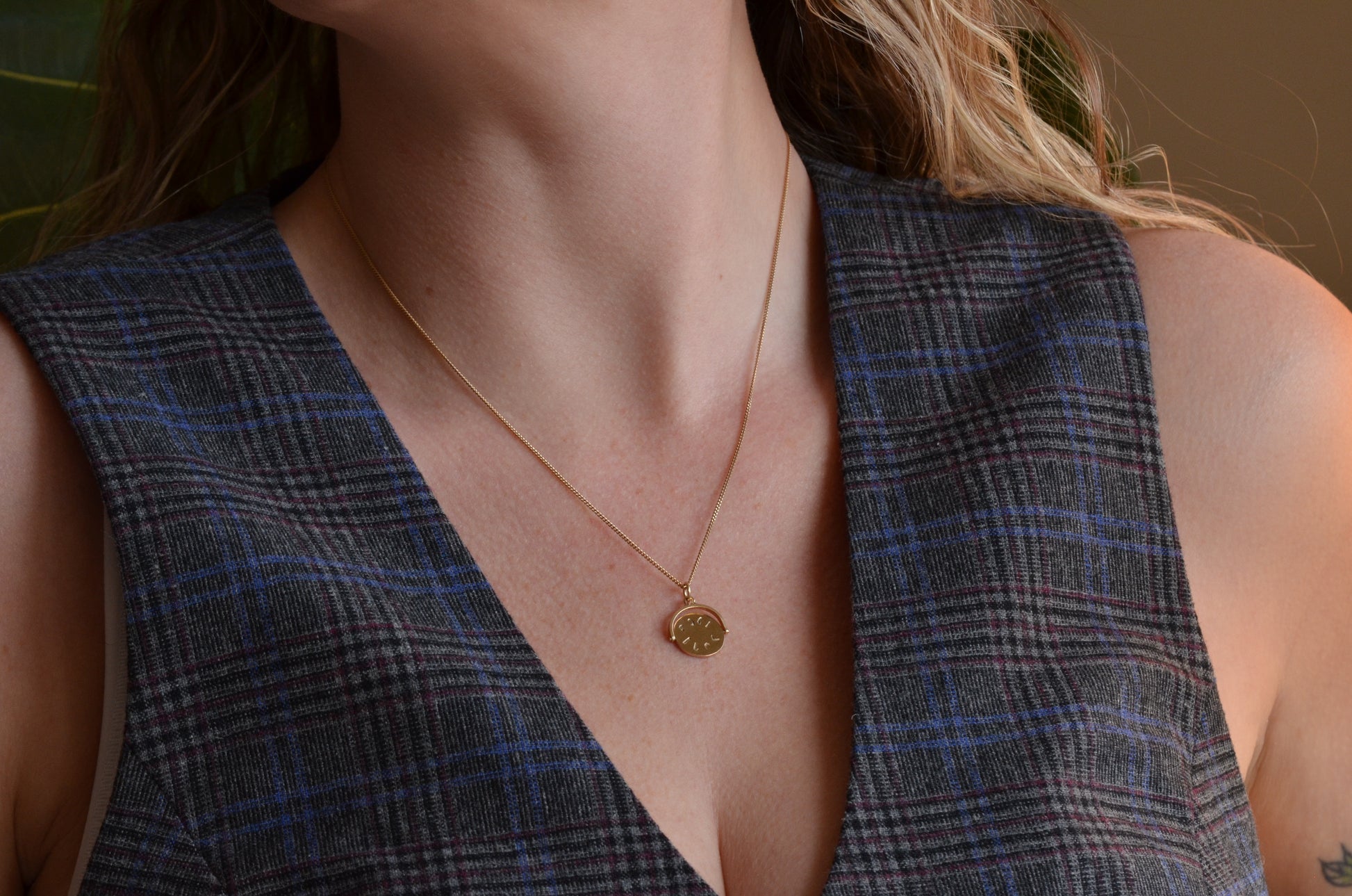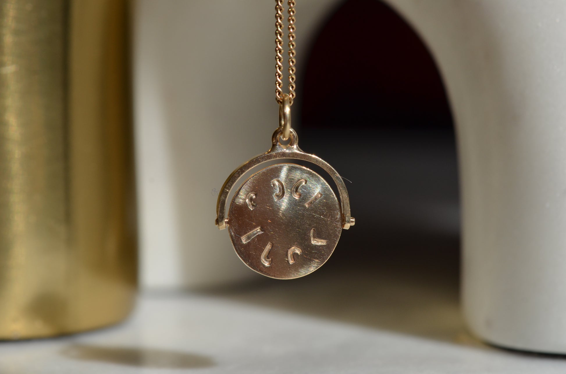 Straight from the mid-century charm craze, these delightful pieces can be added to your own charm bracelet or necklace, or worn alone on a chain to give them all the focus. Each side of the disc bears only a portion of each letter, creating a secret message that is only revealed when the disc is spun and in motion.