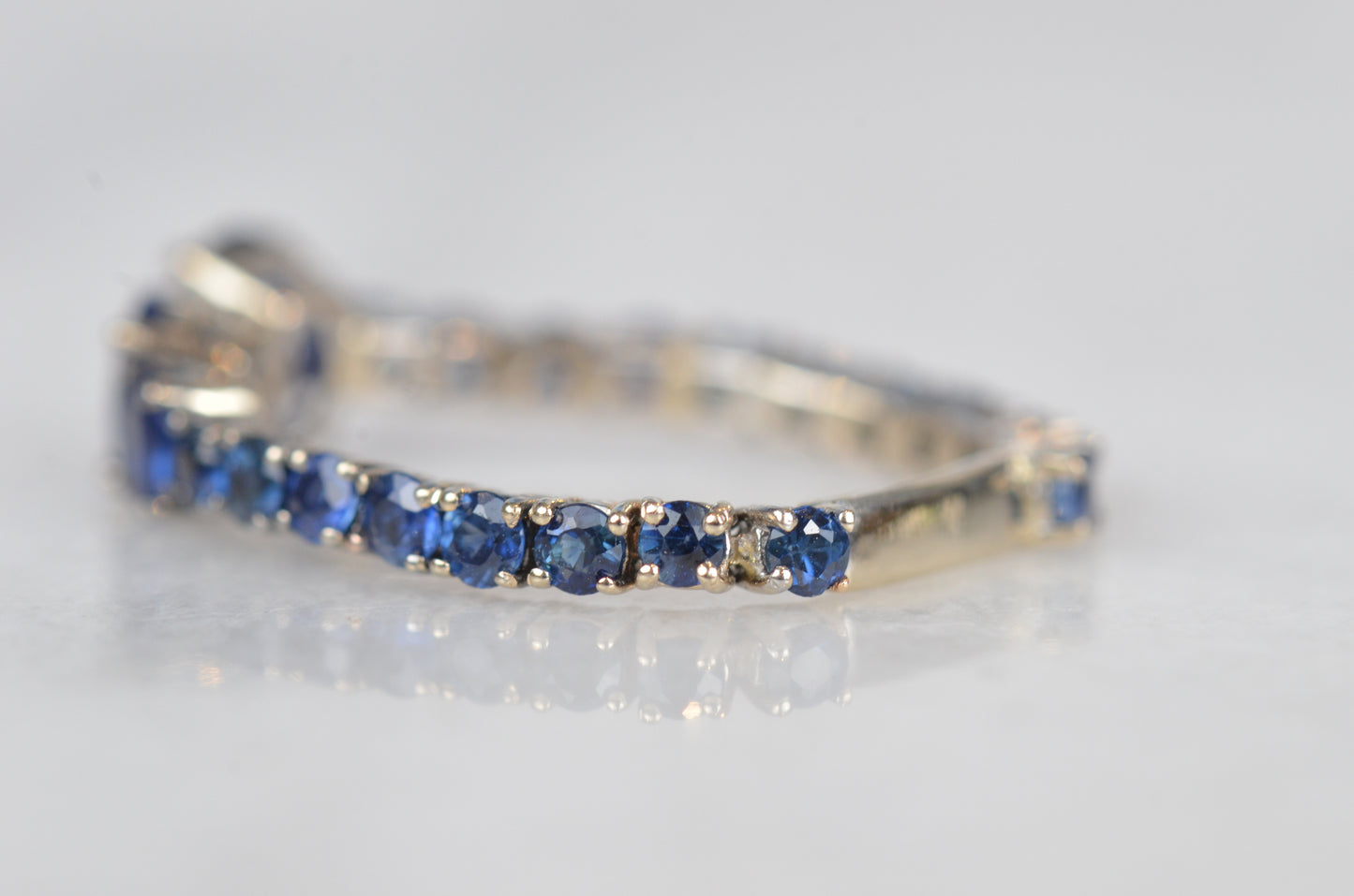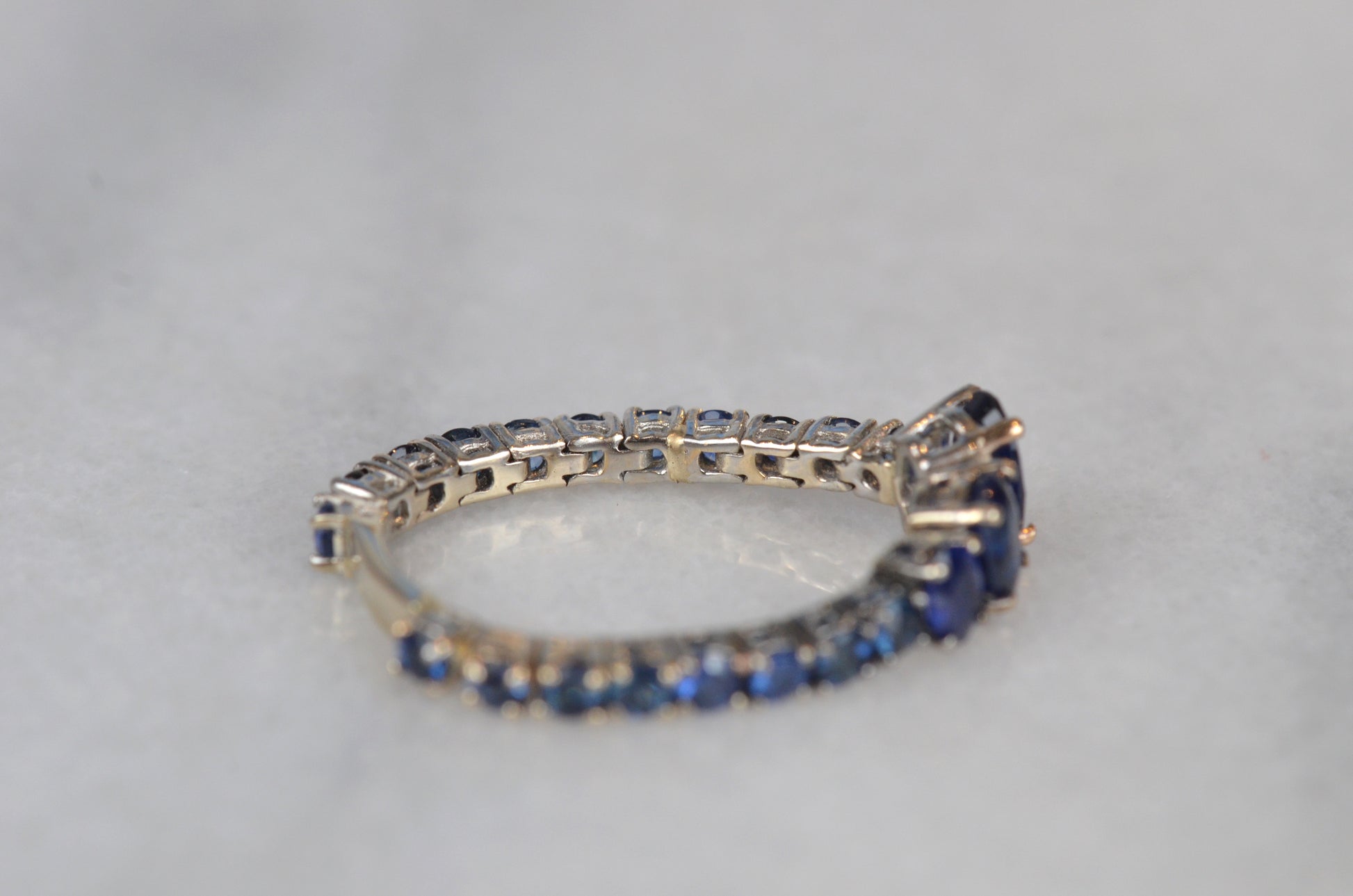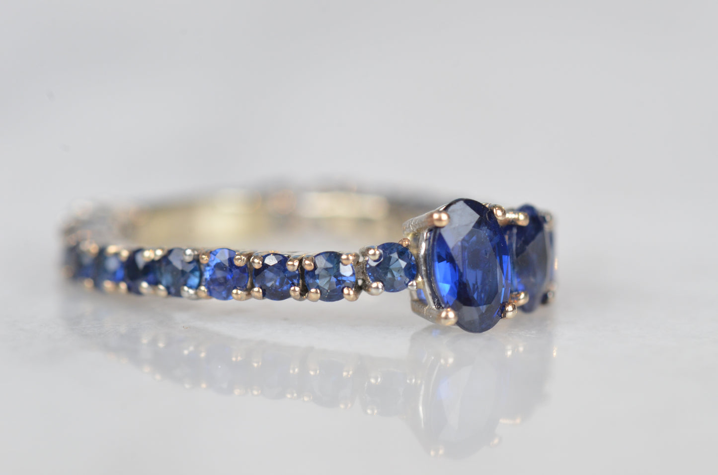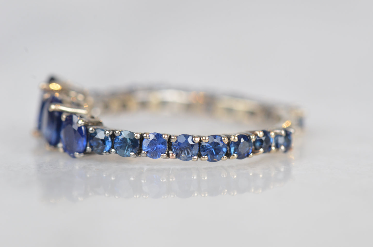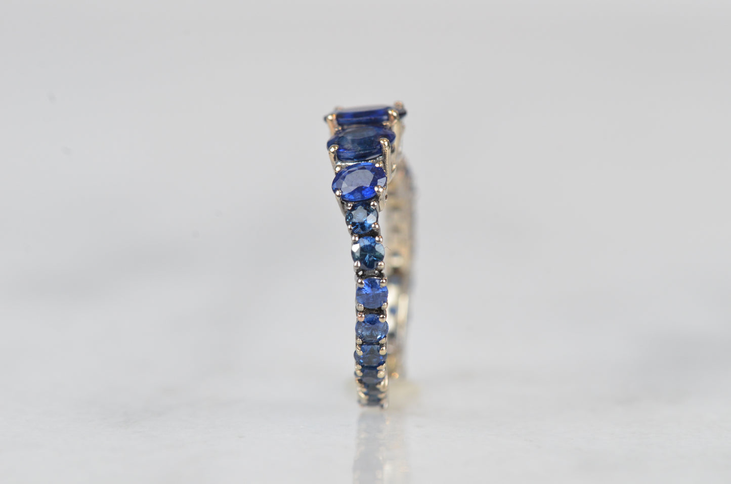 Deep pools of blue slink around in this gorgeous and unique near-eternity band. Three ovals gradually taper in size down to a series of round stones encircling your finger. The construction emulates the links of a tennis bracelet, hinging at each base, providing movement and interest while the sapphires offer depth with their rich colours. While the three ovals are a well matched trio of medium deep blue, the round stones have a little more variety and personality, with paler stones and deeper stones alongside indigo blues and greeny-blues.