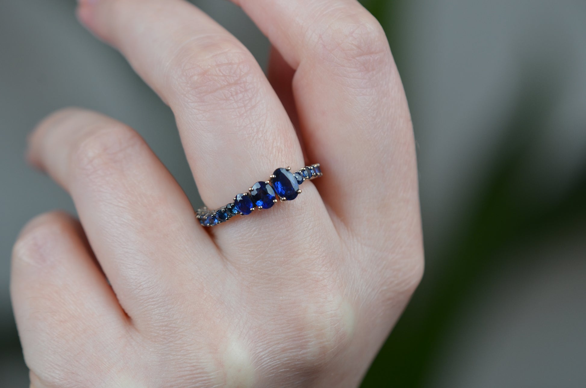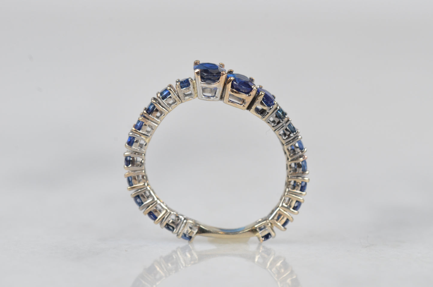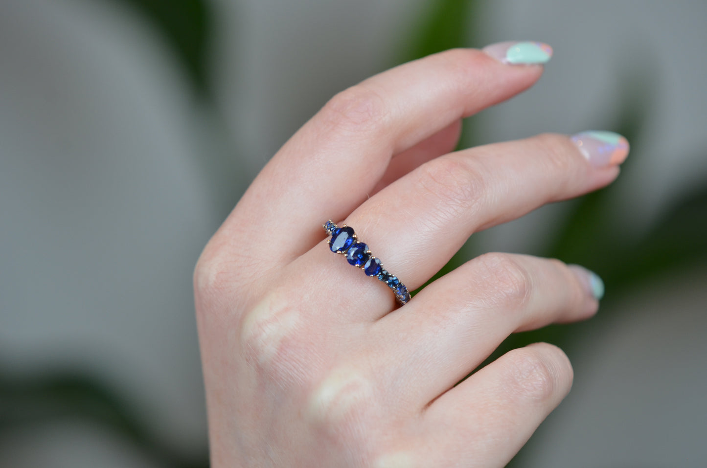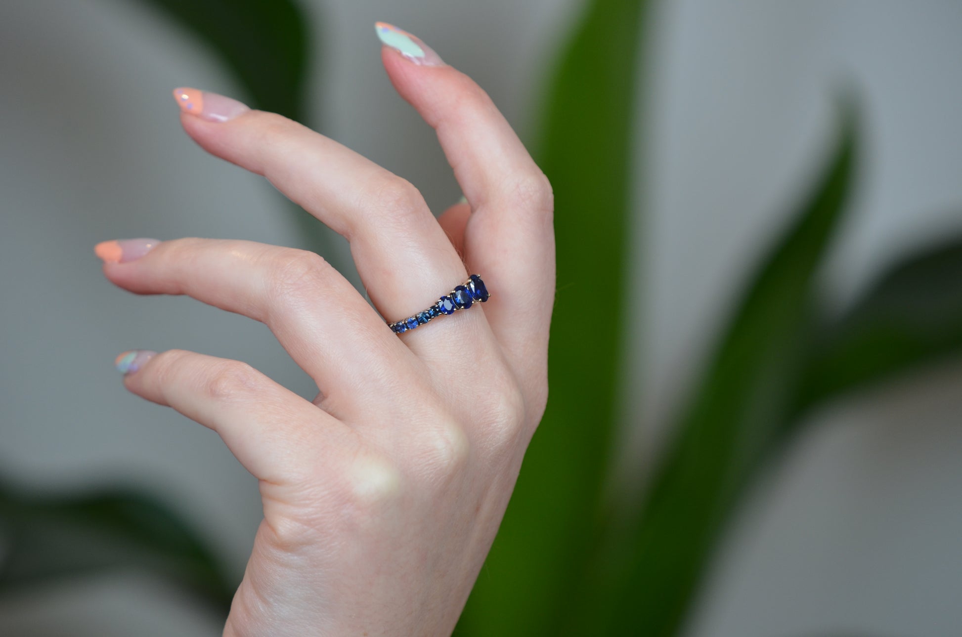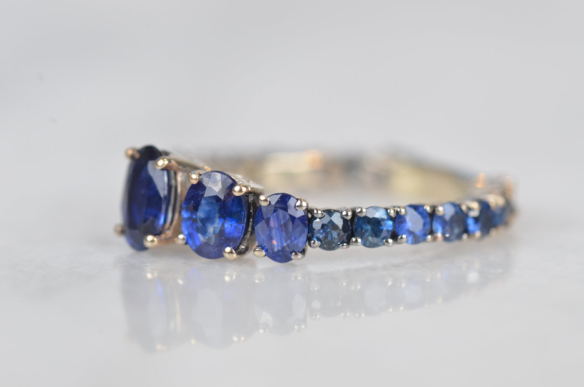 Deep pools of blue slink around in this gorgeous and unique near-eternity band. Three ovals gradually taper in size down to a series of round stones encircling your finger. The construction emulates the links of a tennis bracelet, hinging at each base, providing movement and interest while the sapphires offer depth with their rich colours. While the three ovals are a well matched trio of medium deep blue, the round stones have a little more variety and personality, with paler stones and deeper stones alongside indigo blues and greeny-blues.