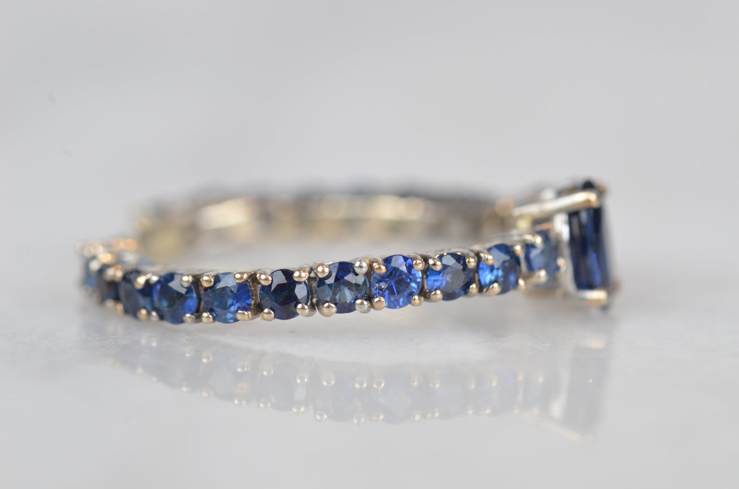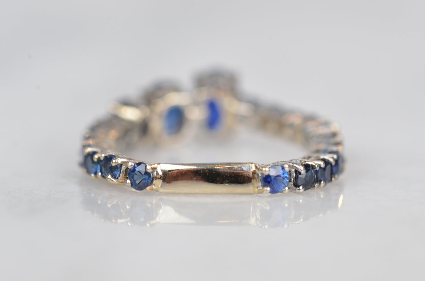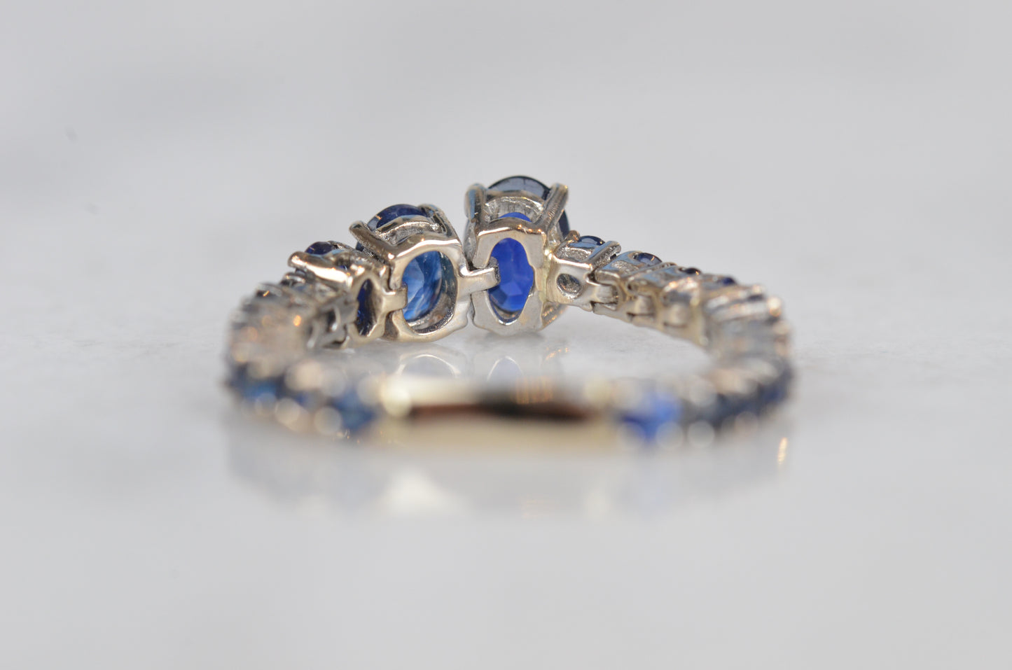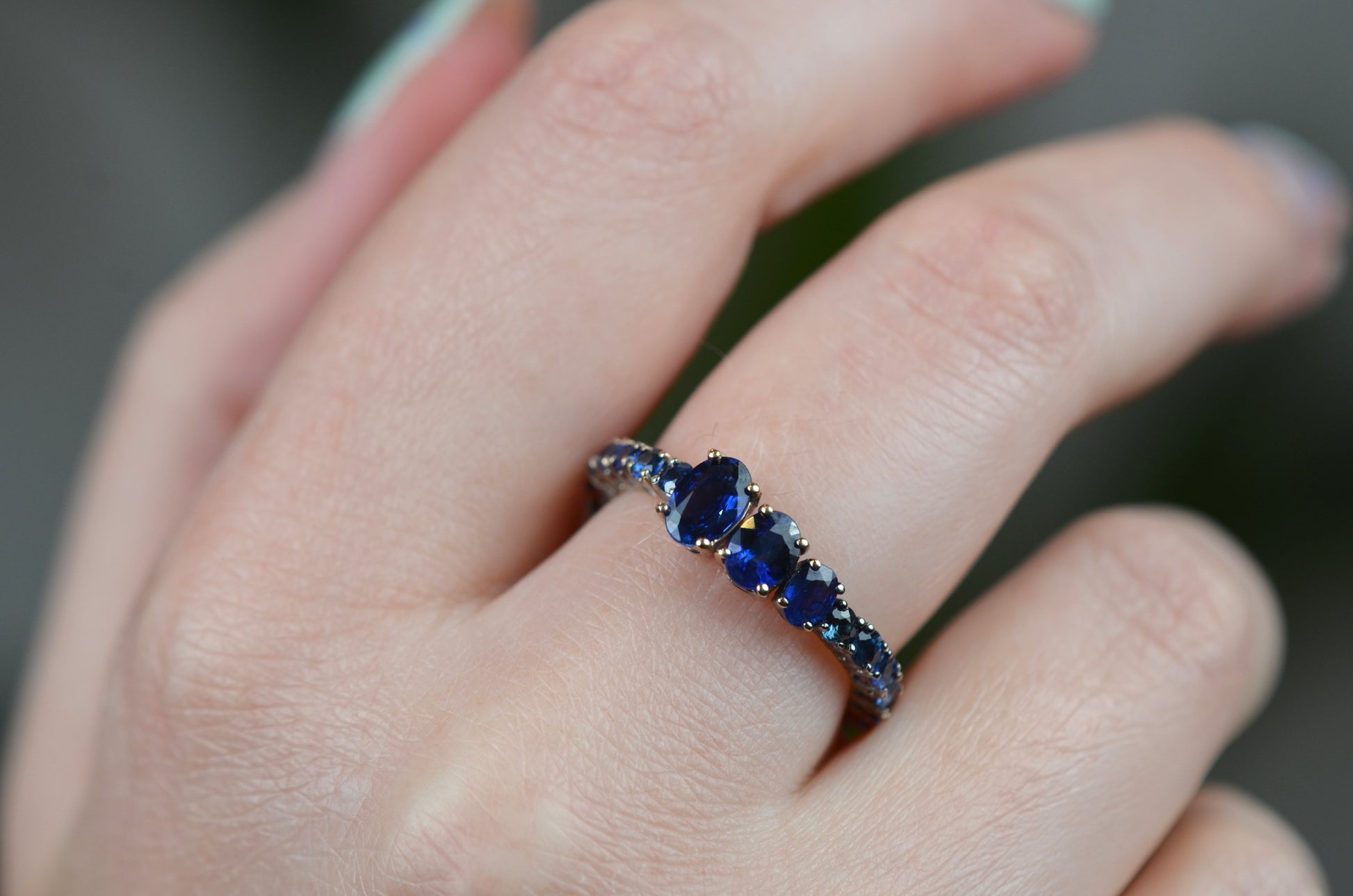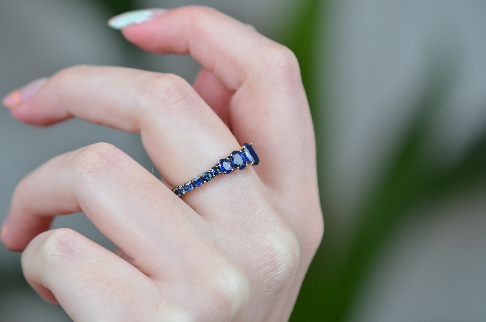 Deep pools of blue slink around in this gorgeous and unique near-eternity band. Three ovals gradually taper in size down to a series of round stones encircling your finger. The construction emulates the links of a tennis bracelet, hinging at each base, providing movement and interest while the sapphires offer depth with their rich colours. While the three ovals are a well matched trio of medium deep blue, the round stones have a little more variety and personality, with paler stones and deeper stones alongside indigo blues and greeny-blues.