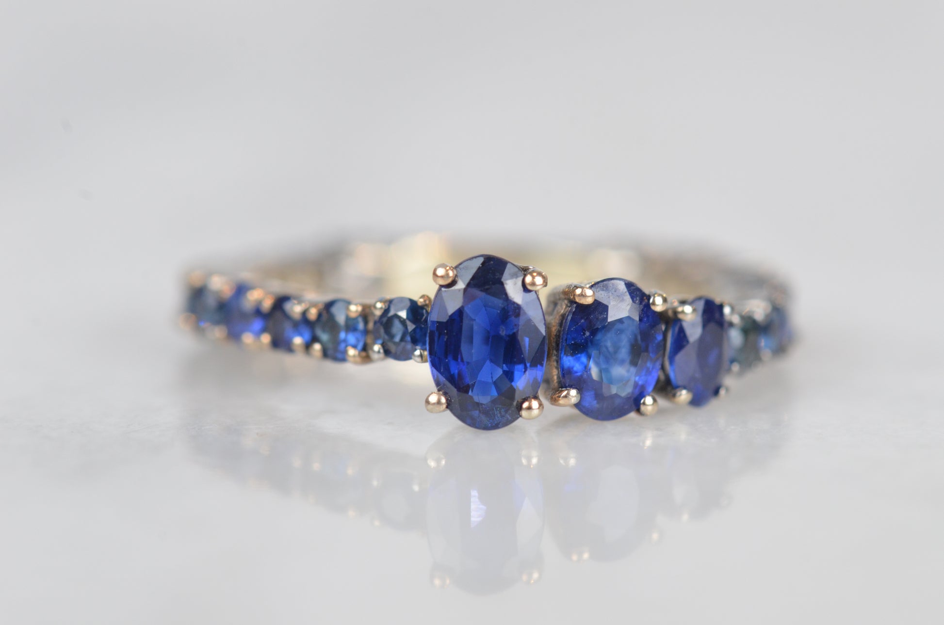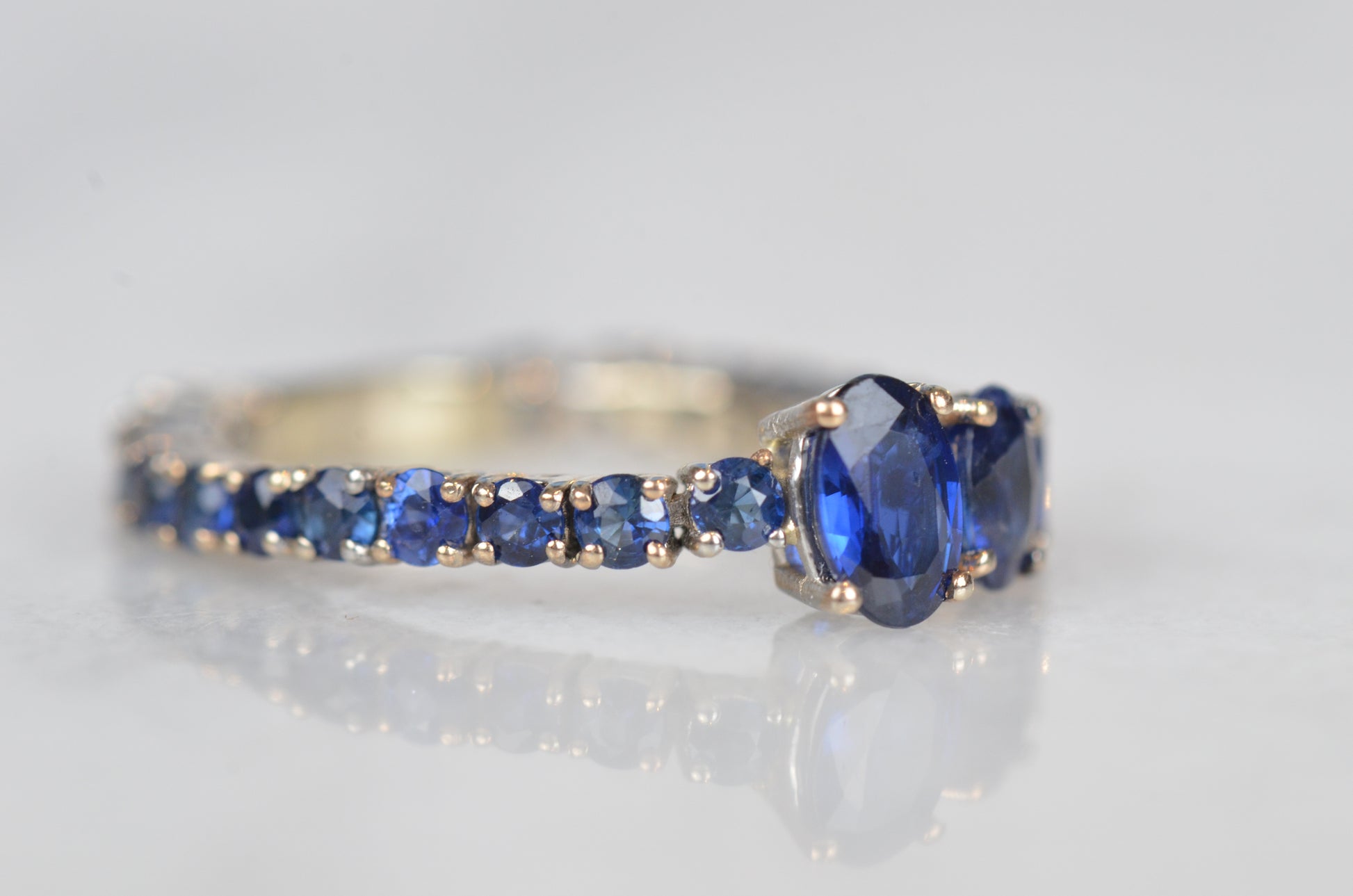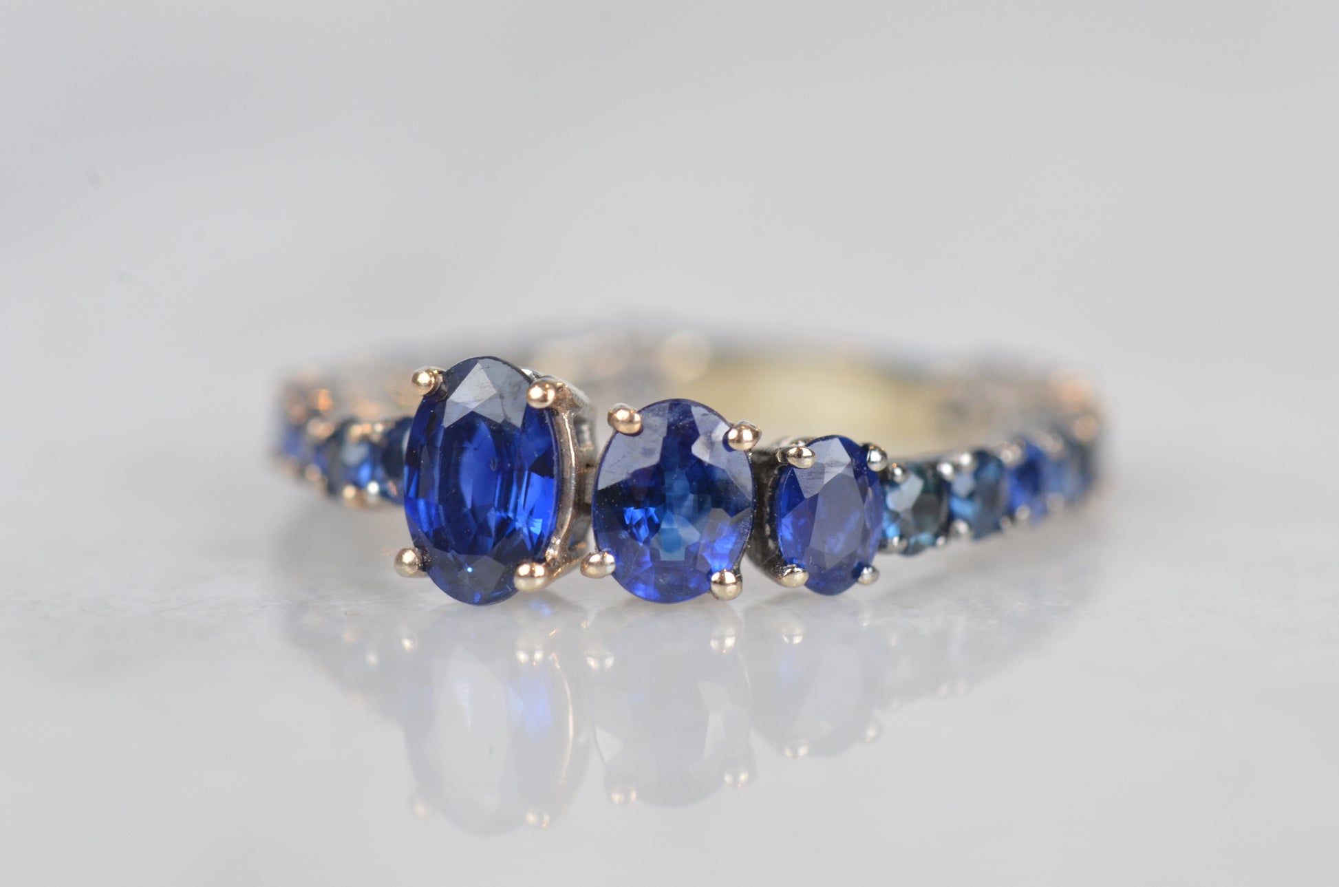 • 3 oval sapphires of tapered sized approximately 0.75 carats combined weight, and 19 round sapphires approximately 1.14 carats combined weight; approximately 1.89 carats total weight