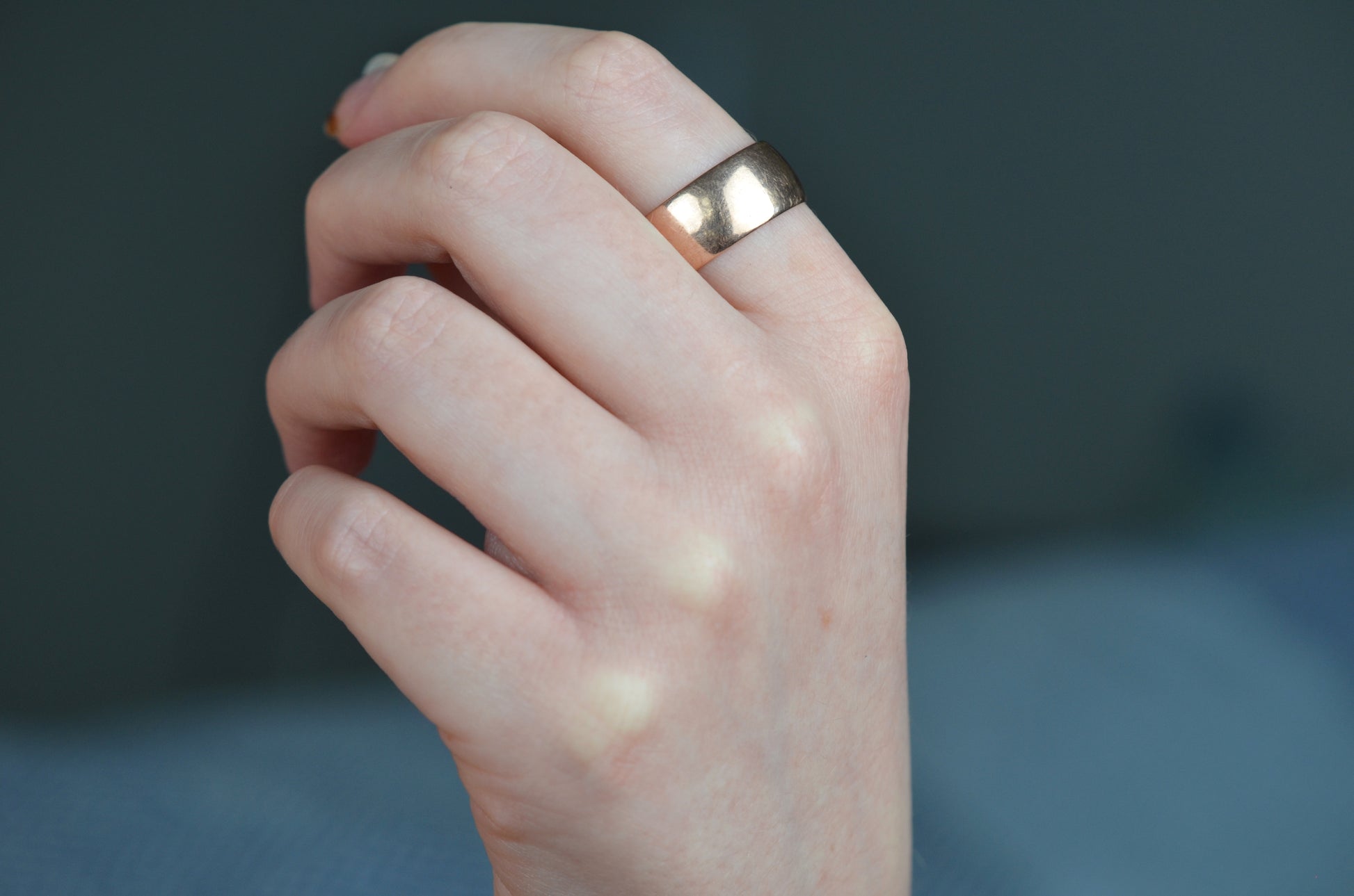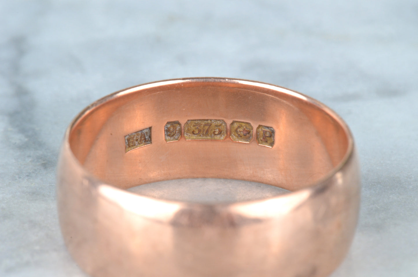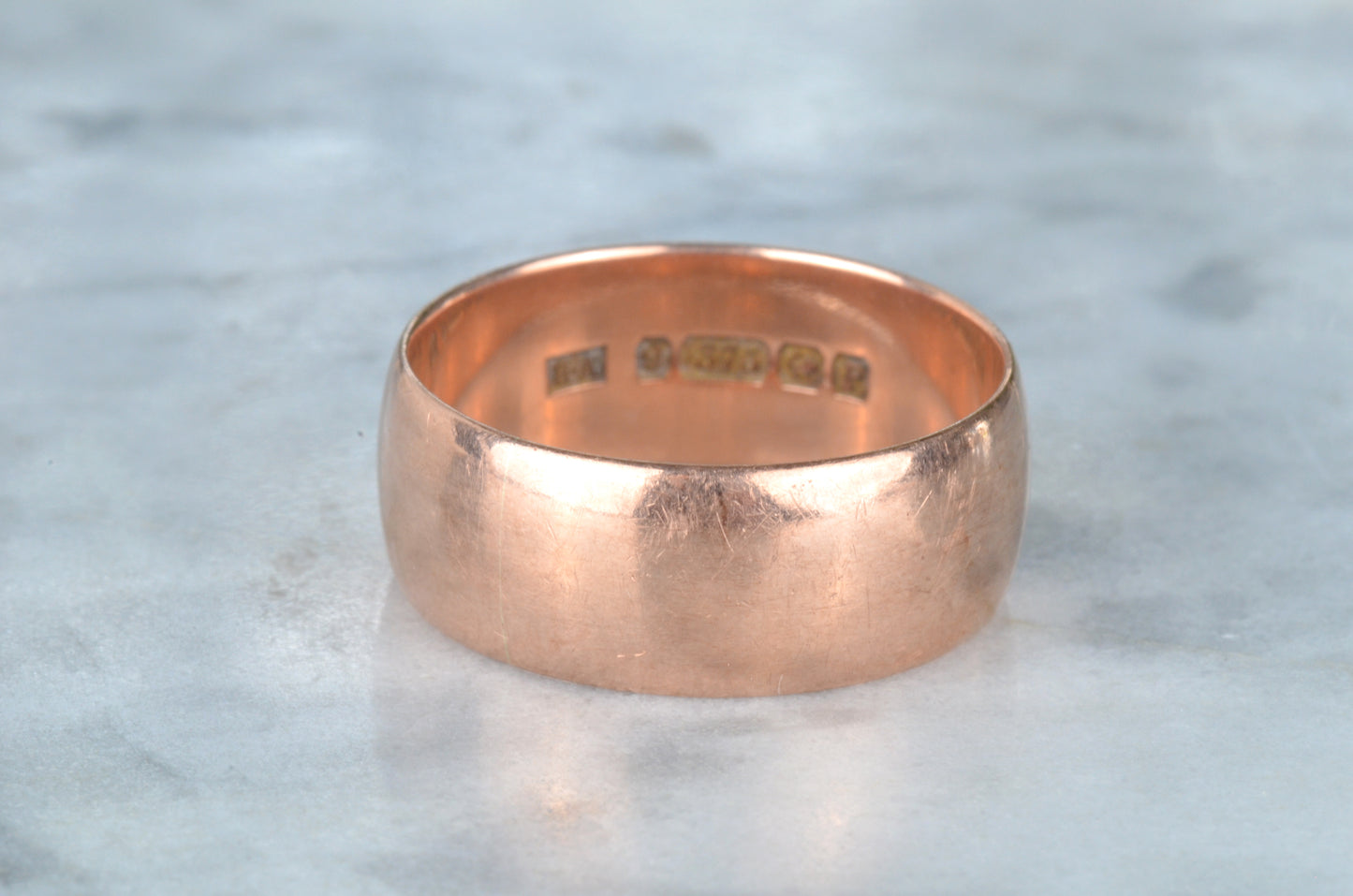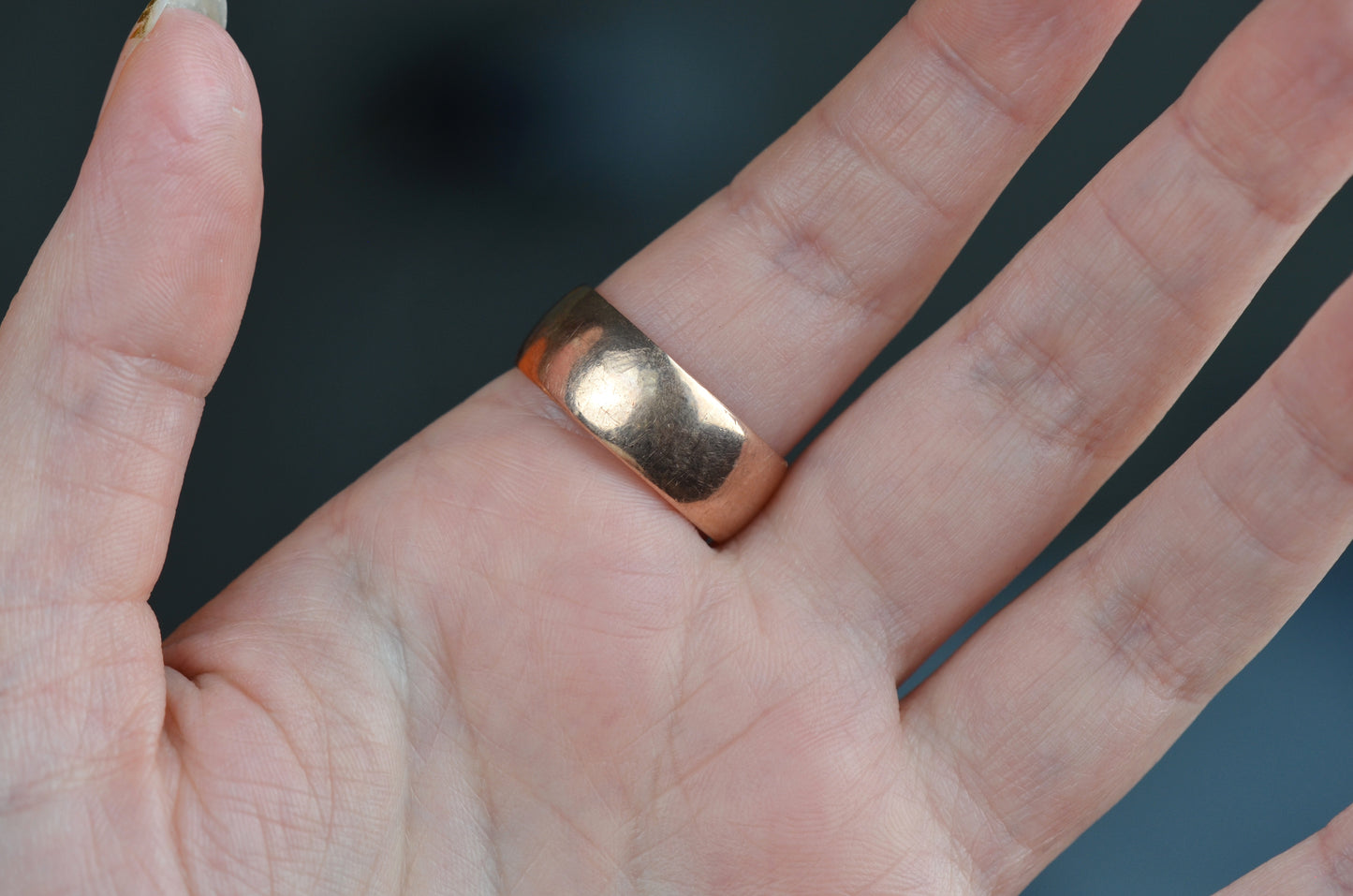 This ring! Radiating warmth and softness from the colour and wear of the gold, but with a powerful presence from its sheer size - we're smitten. British hallmarks date the ring to 1939, the year the UK declared war on Germany, and yet the style of the ring draws on generations before and sets the tone for generations to come. A flat interior and very gentle doming to the exterior mean that the ring has a slim fit between the fingers and doesn't feel bulky despite its broad width. We adore this ring as a wedding band, statement ring, or stacking ring.