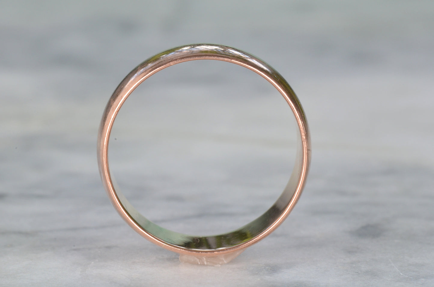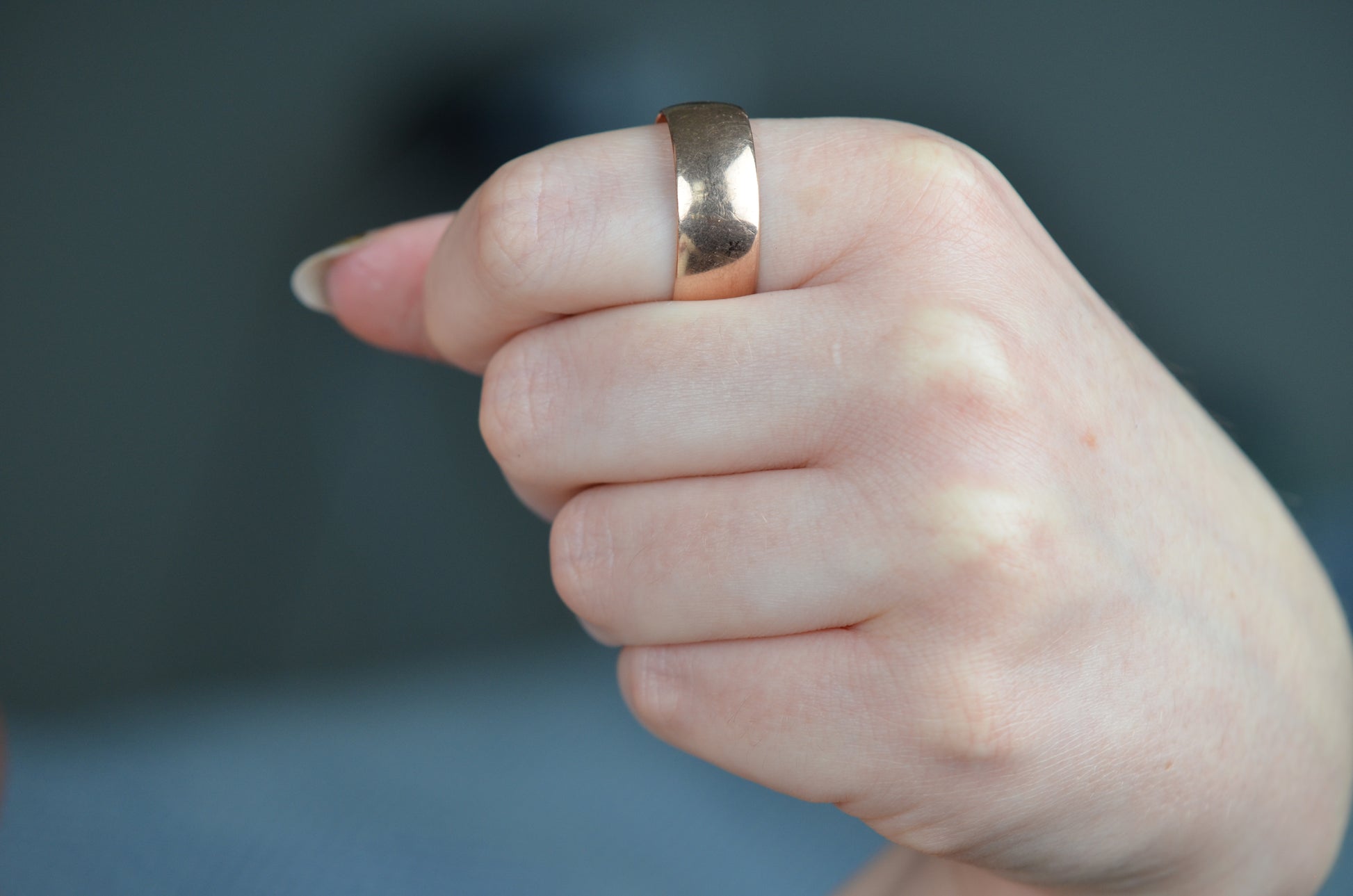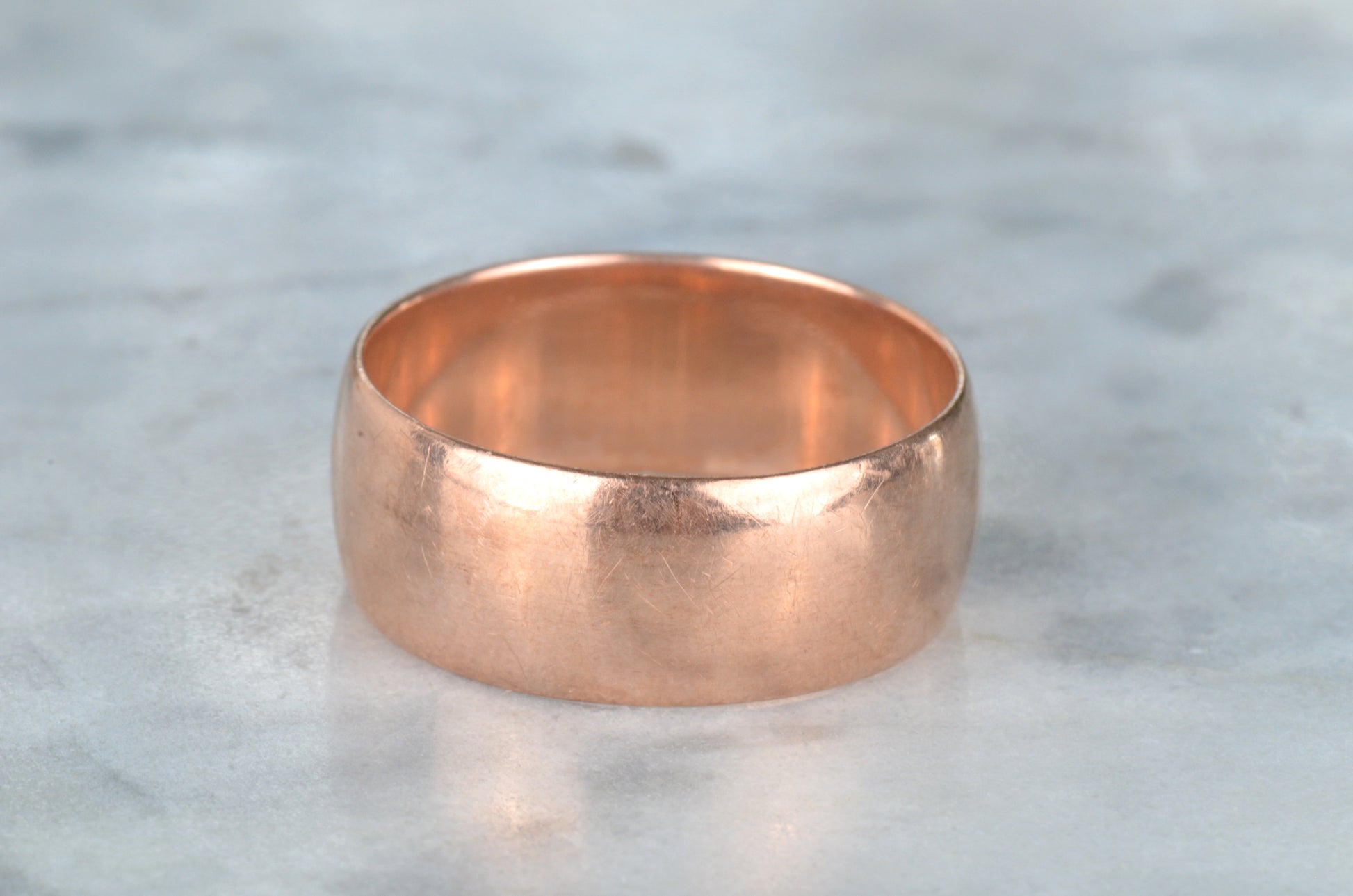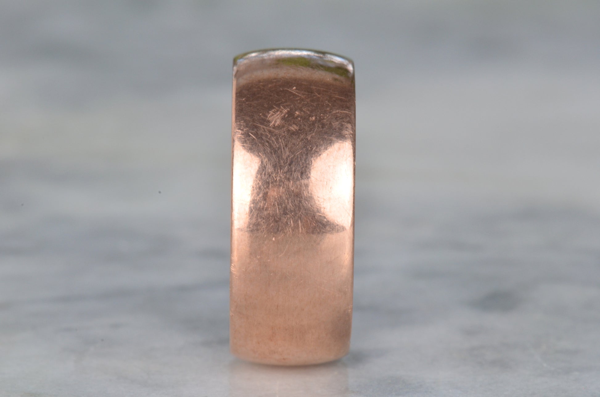 This ring! Radiating warmth and softness from the colour and wear of the gold, but with a powerful presence from its sheer size - we're smitten. British hallmarks date the ring to 1939, the year the UK declared war on Germany, and yet the style of the ring draws on generations before and sets the tone for generations to come. A flat interior and very gentle doming to the exterior mean that the ring has a slim fit between the fingers and doesn't feel bulky despite its broad width. We adore this ring as a wedding band, statement ring, or stacking ring.