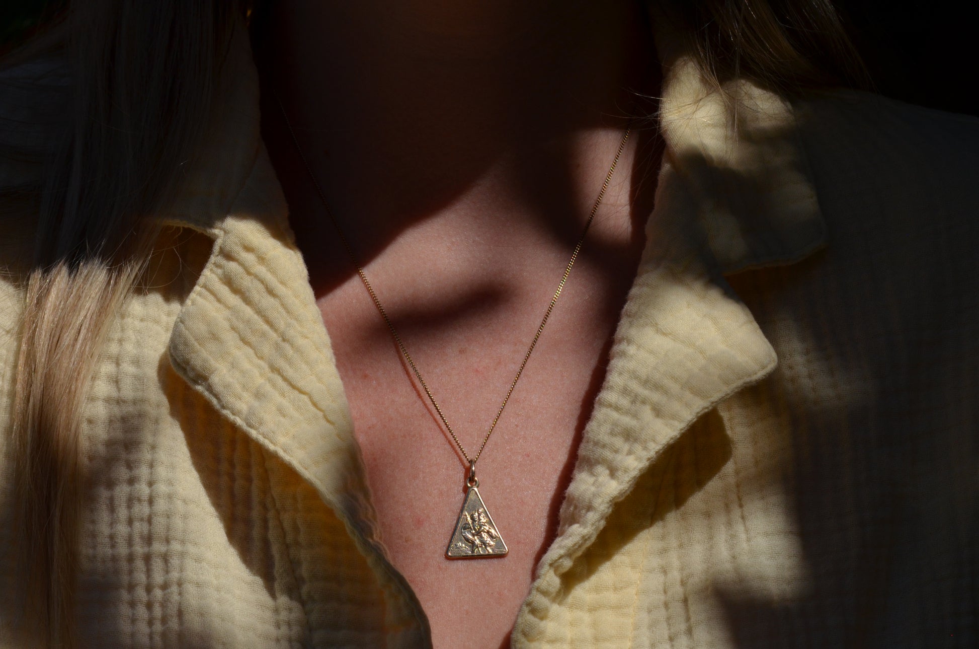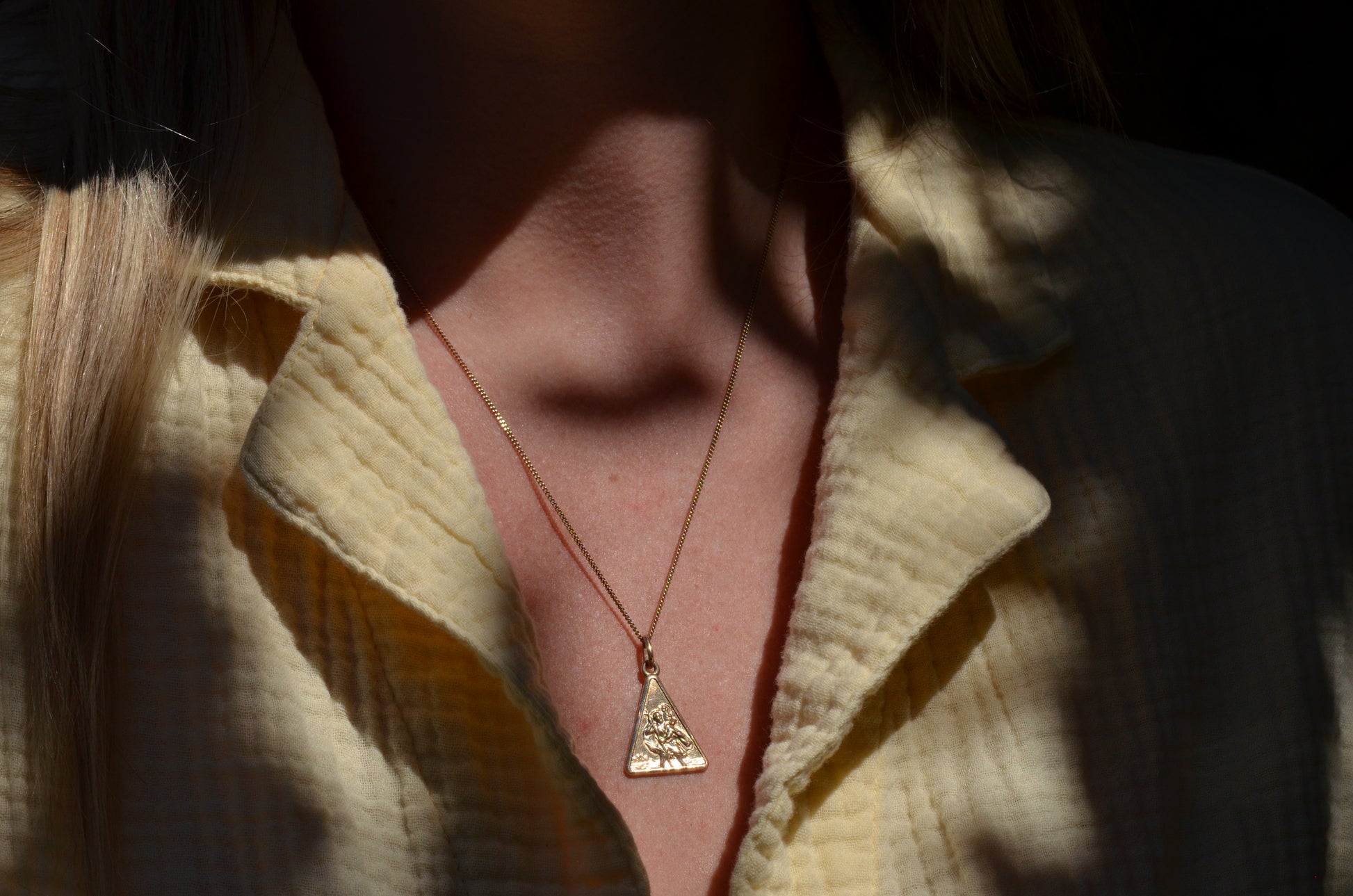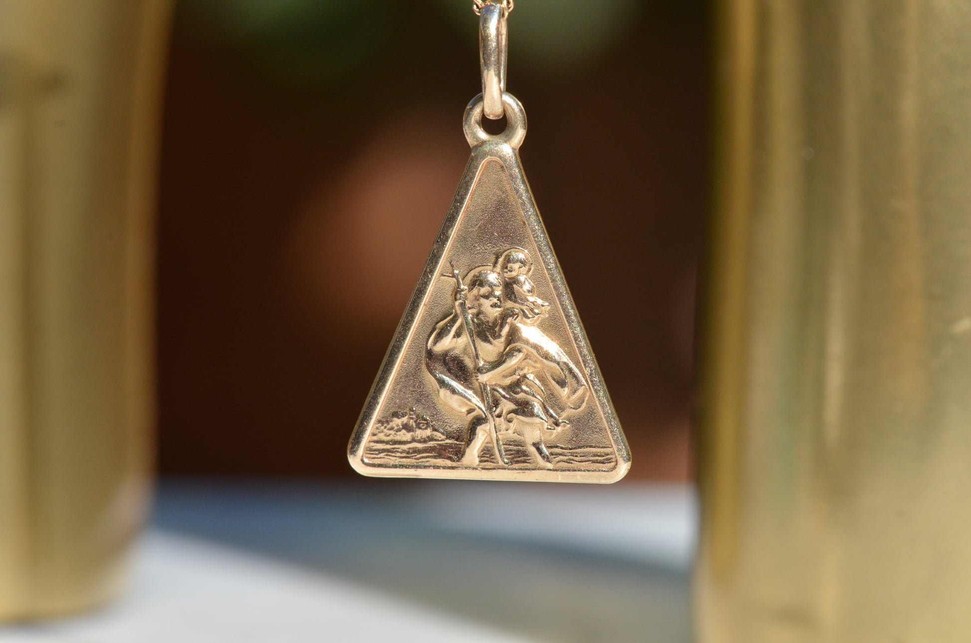 Beautifully designed in a unique triangular medallion, this classic piece is a daily staple, whether you're globe trotting or just traveling through your own daily world. Recognizable and appreciated even amongst us heathens, St. Christopher is the patron saint of travellers - may he protect and guide you wherever you go.