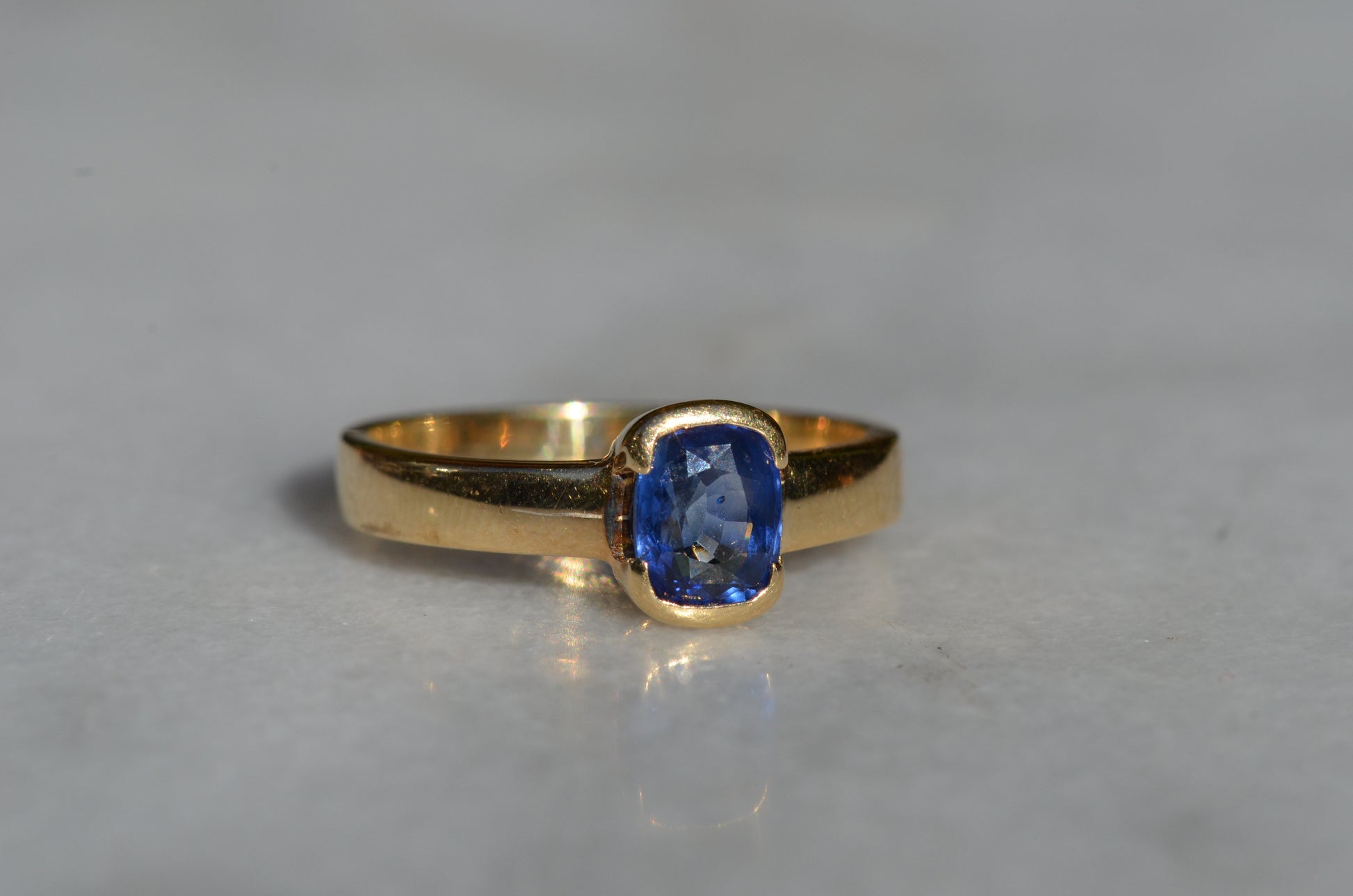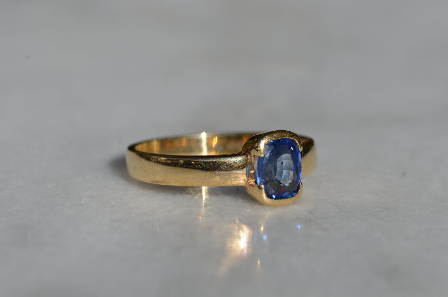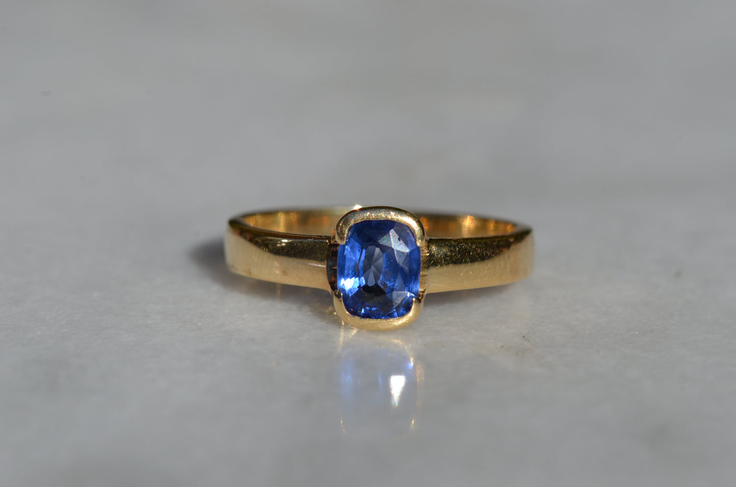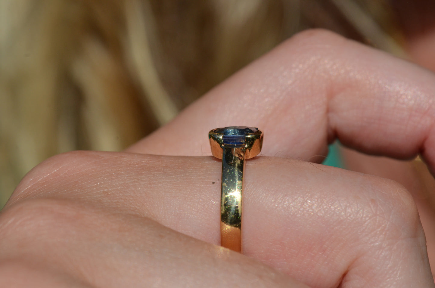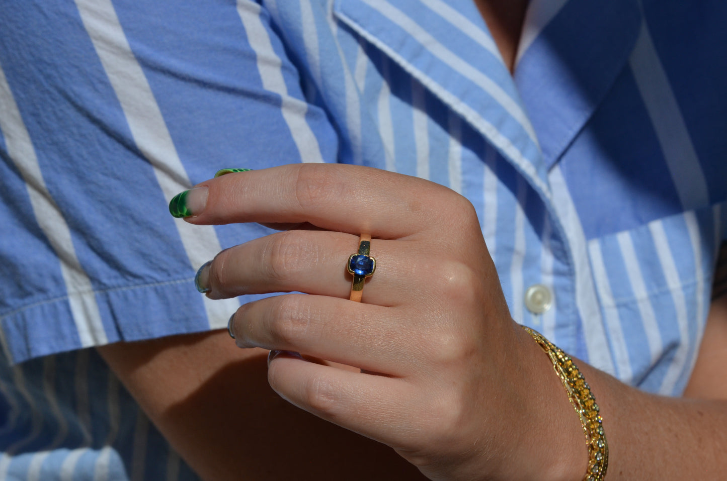 In this stunning solitaire, the broad and smooth band of rich yellow gold is the perfect foil for the star of the show: a velvety blue sapphire. The beloved September birthstone features natural colour zoning that presents as an almost alchemical shifting of different shades and saturations of blue throughout. A demi-bezel setting complements the cushion shape and wide band to great effect, with a result that is both beautiful and unfussy in its practicality.