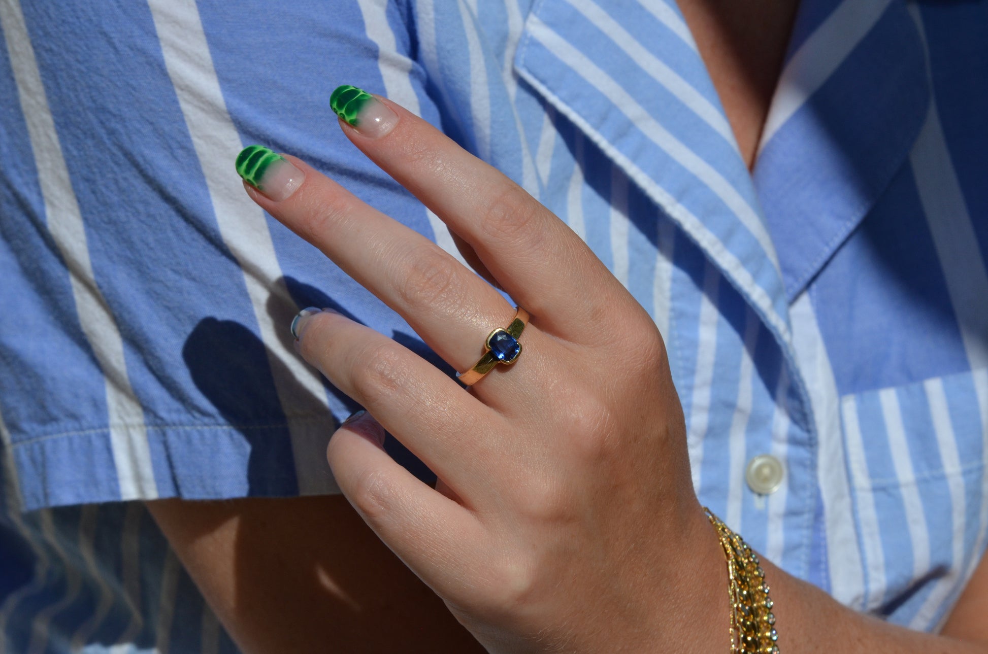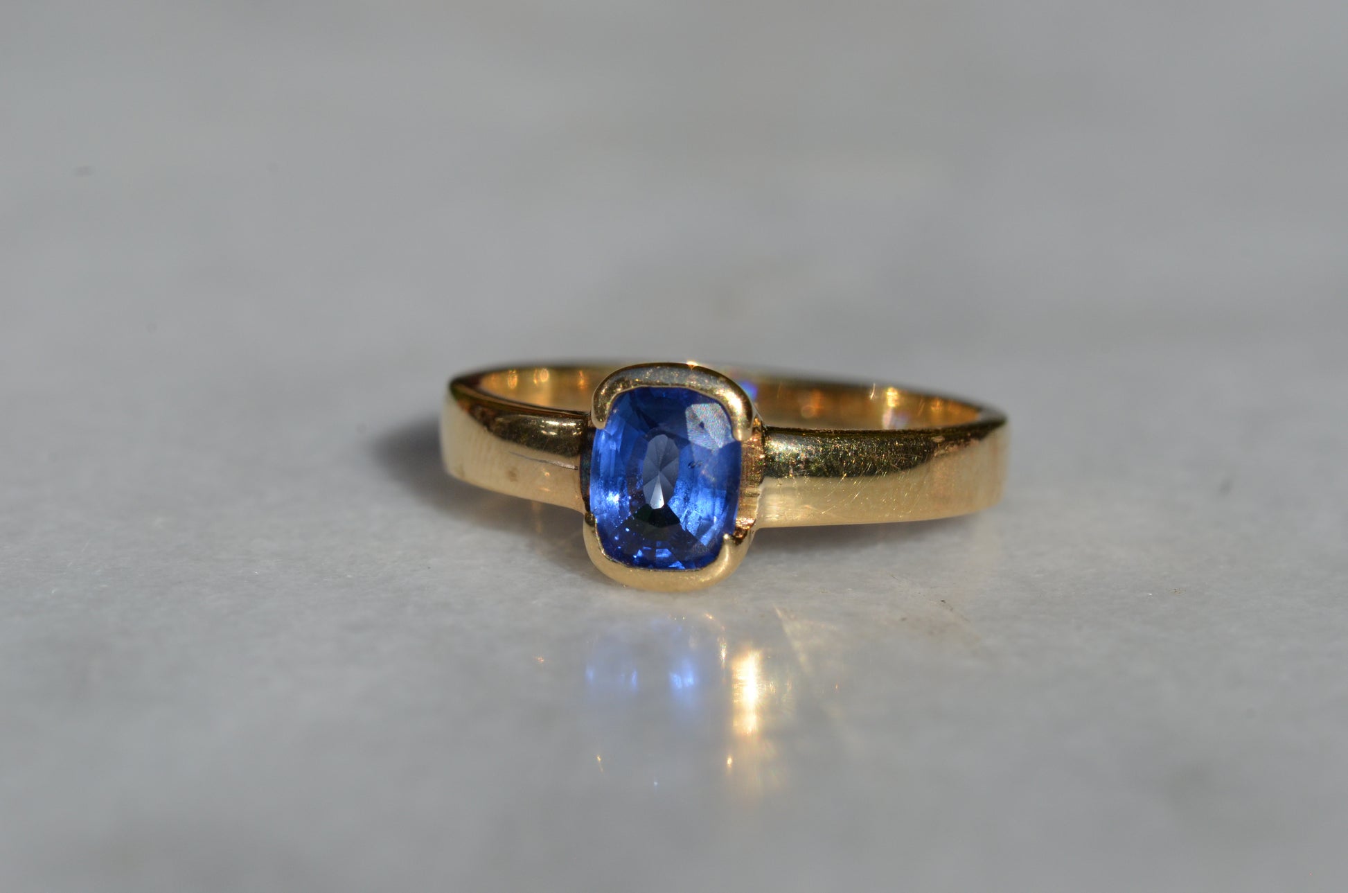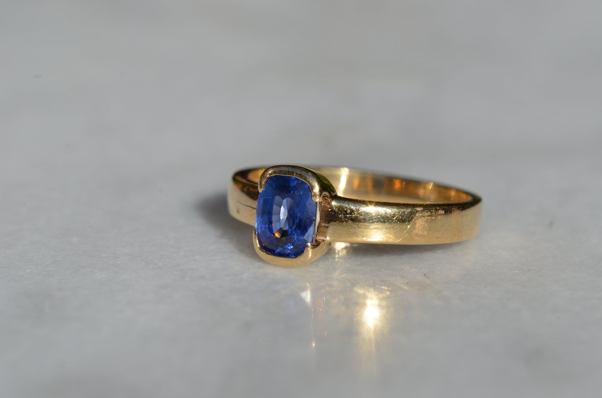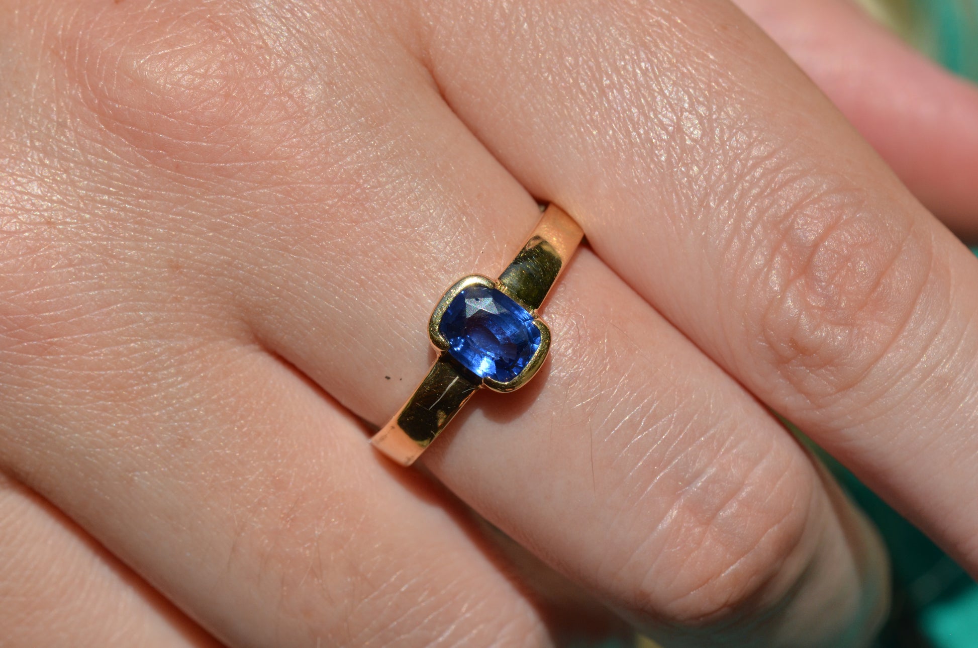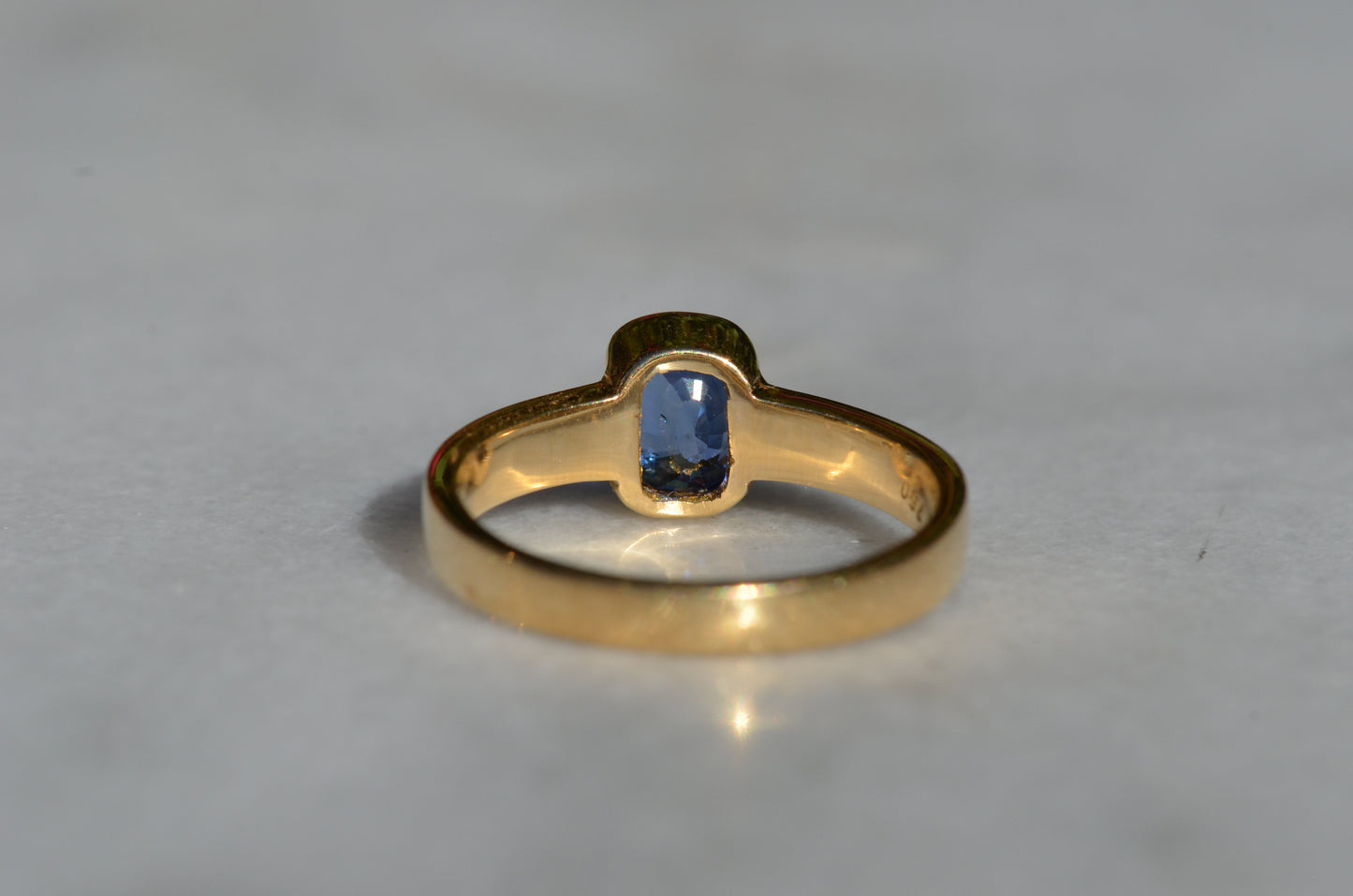 In this stunning solitaire, the broad and smooth band of rich yellow gold is the perfect foil for the star of the show: a velvety blue sapphire. The beloved September birthstone features natural colour zoning that presents as an almost alchemical shifting of different shades and saturations of blue throughout. A demi-bezel setting complements the cushion shape and wide band to great effect, with a result that is both beautiful and unfussy in its practicality.