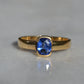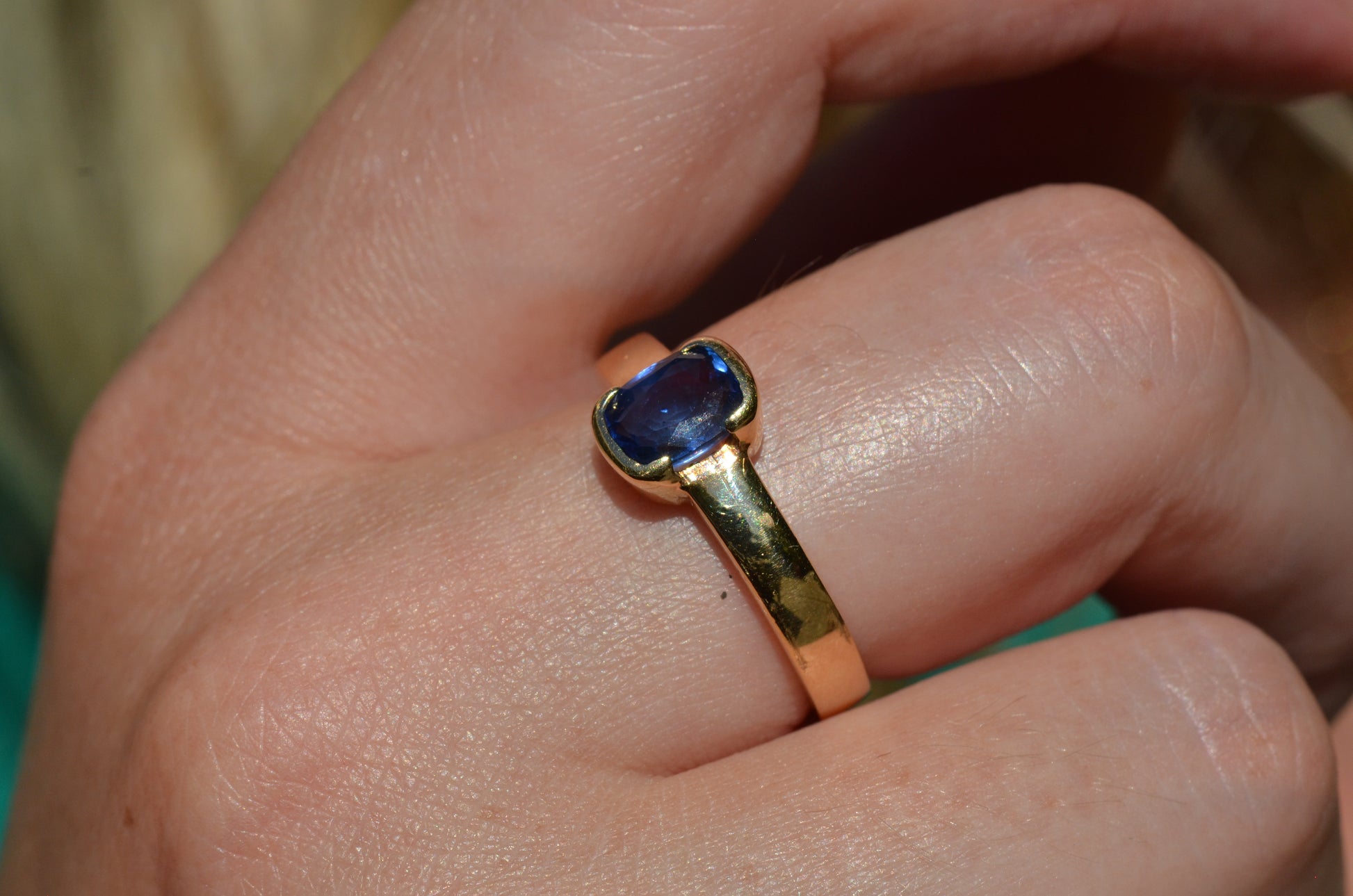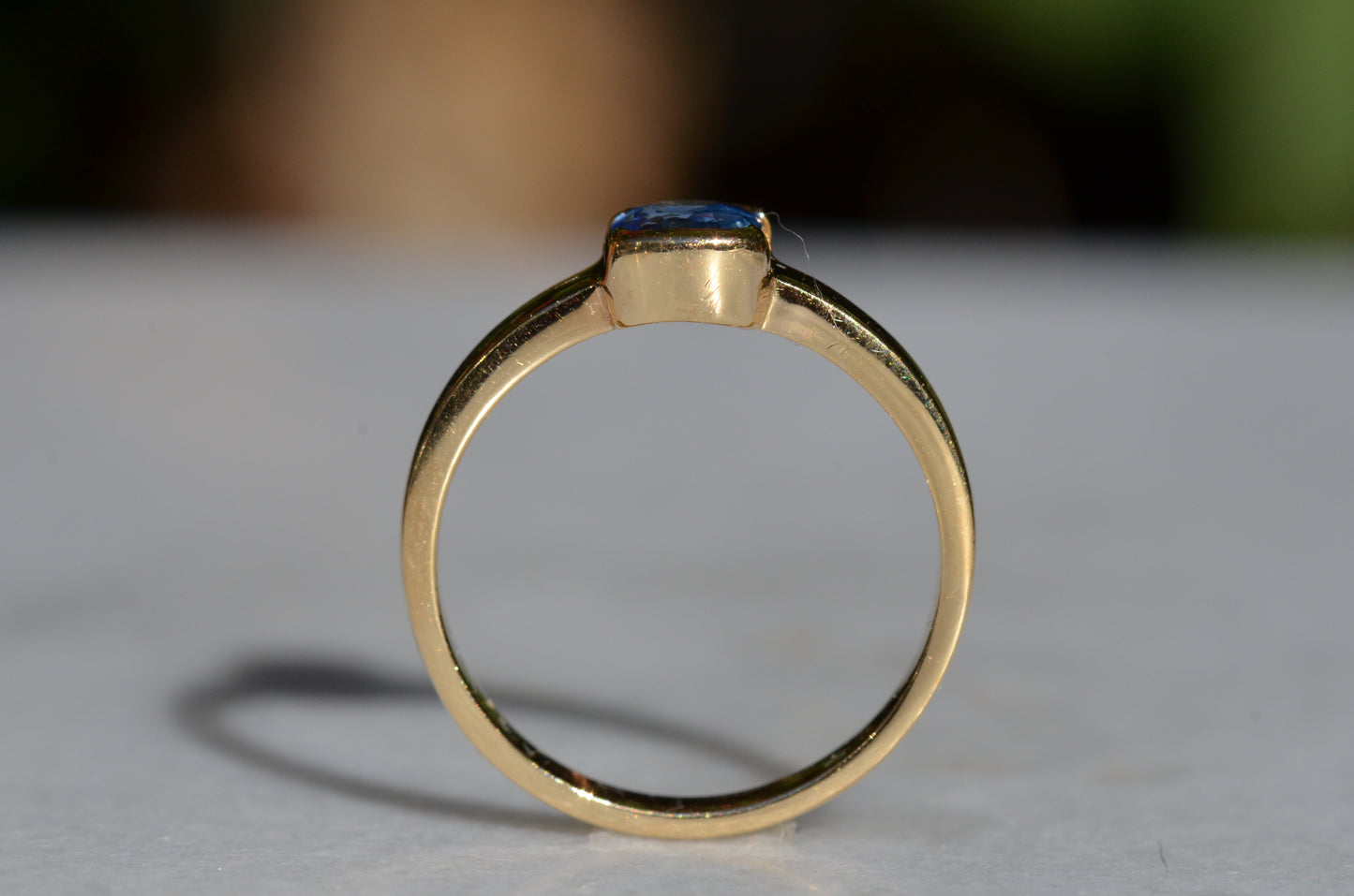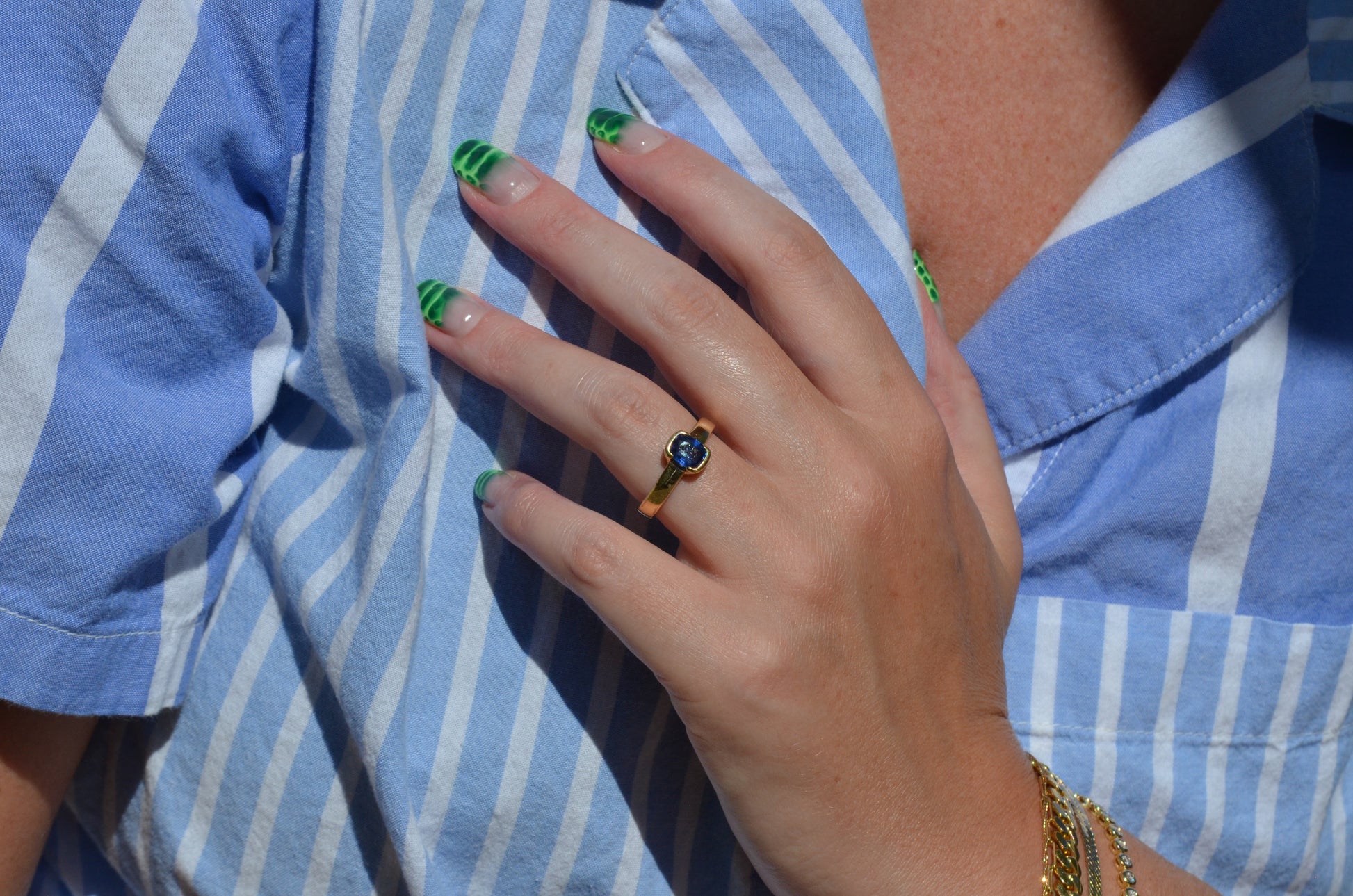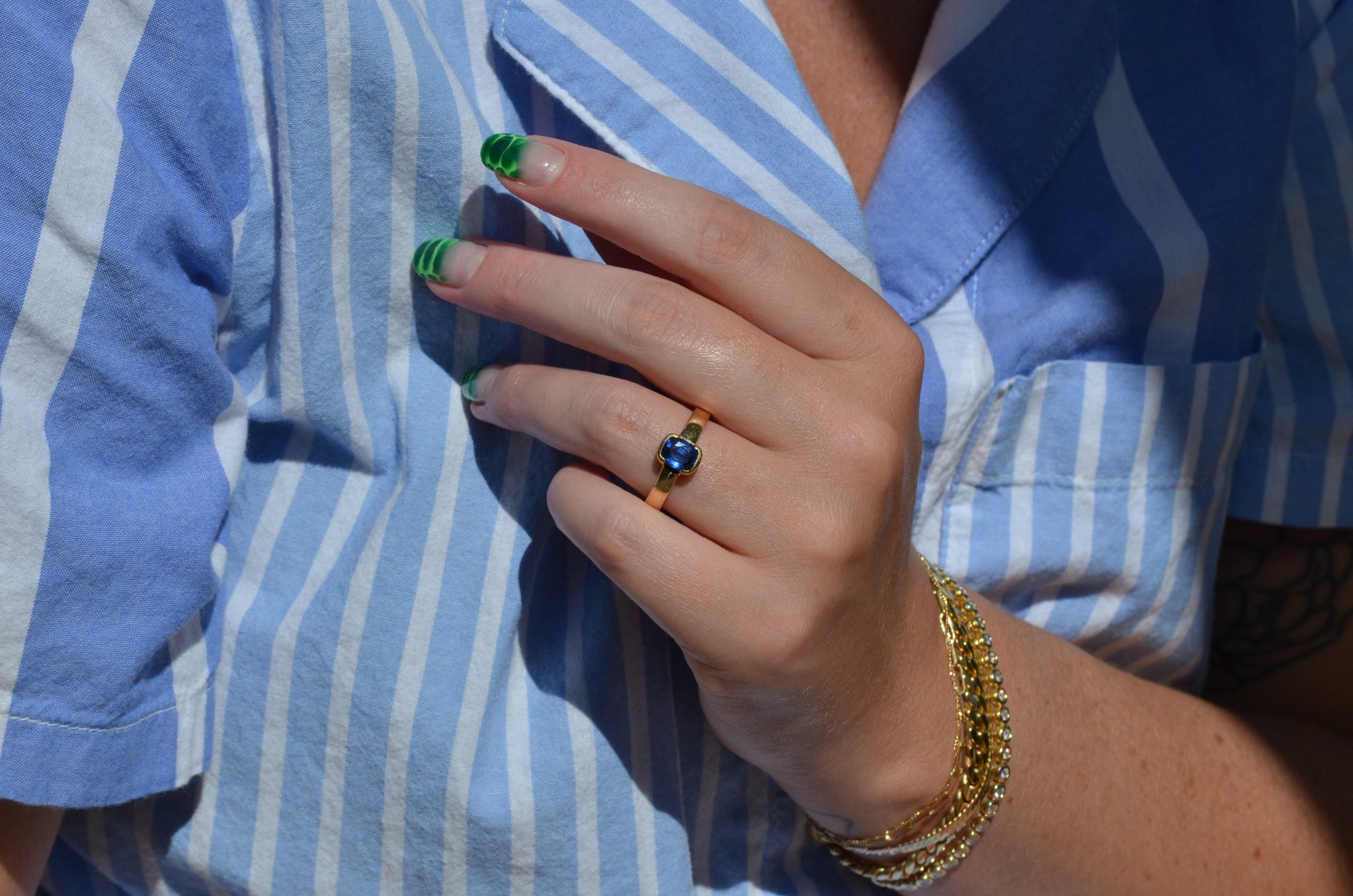 In this stunning solitaire, the broad and smooth band of rich yellow gold is the perfect foil for the star of the show: a velvety blue sapphire. The beloved September birthstone features natural colour zoning that presents as an almost alchemical shifting of different shades and saturations of blue throughout. A demi-bezel setting complements the cushion shape and wide band to great effect, with a result that is both beautiful and unfussy in its practicality.
