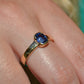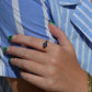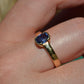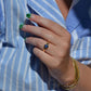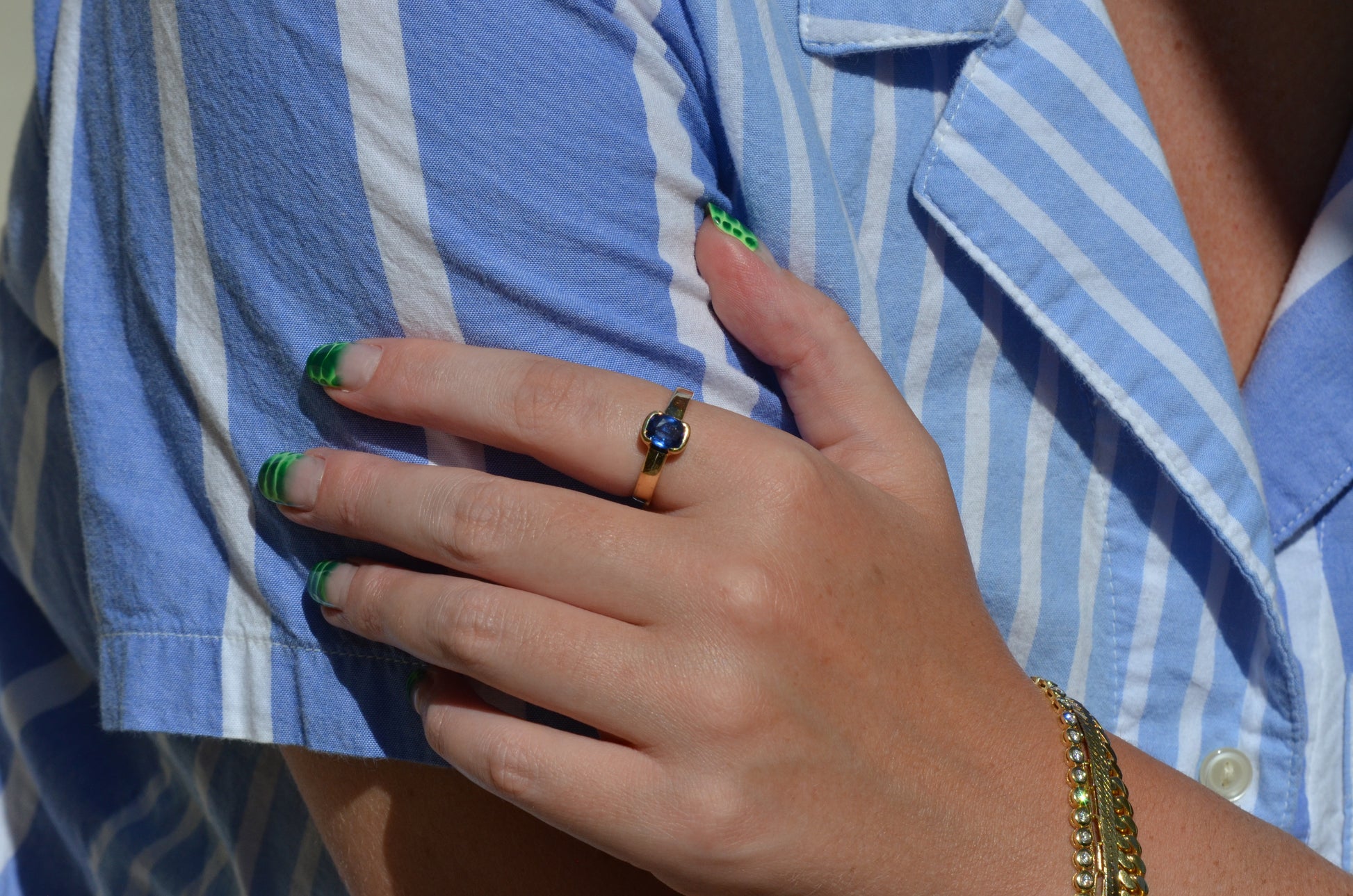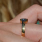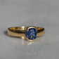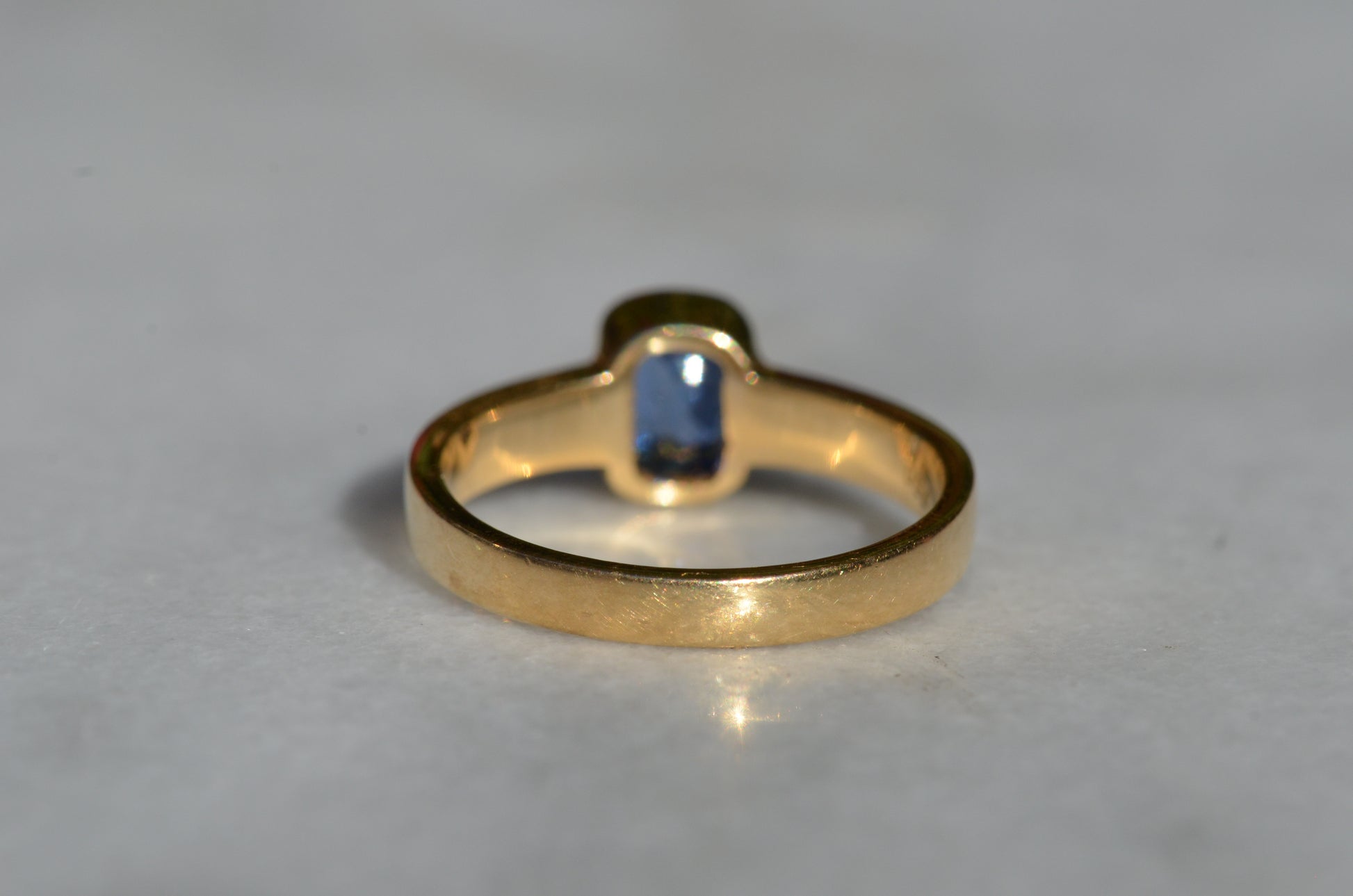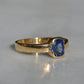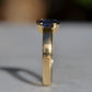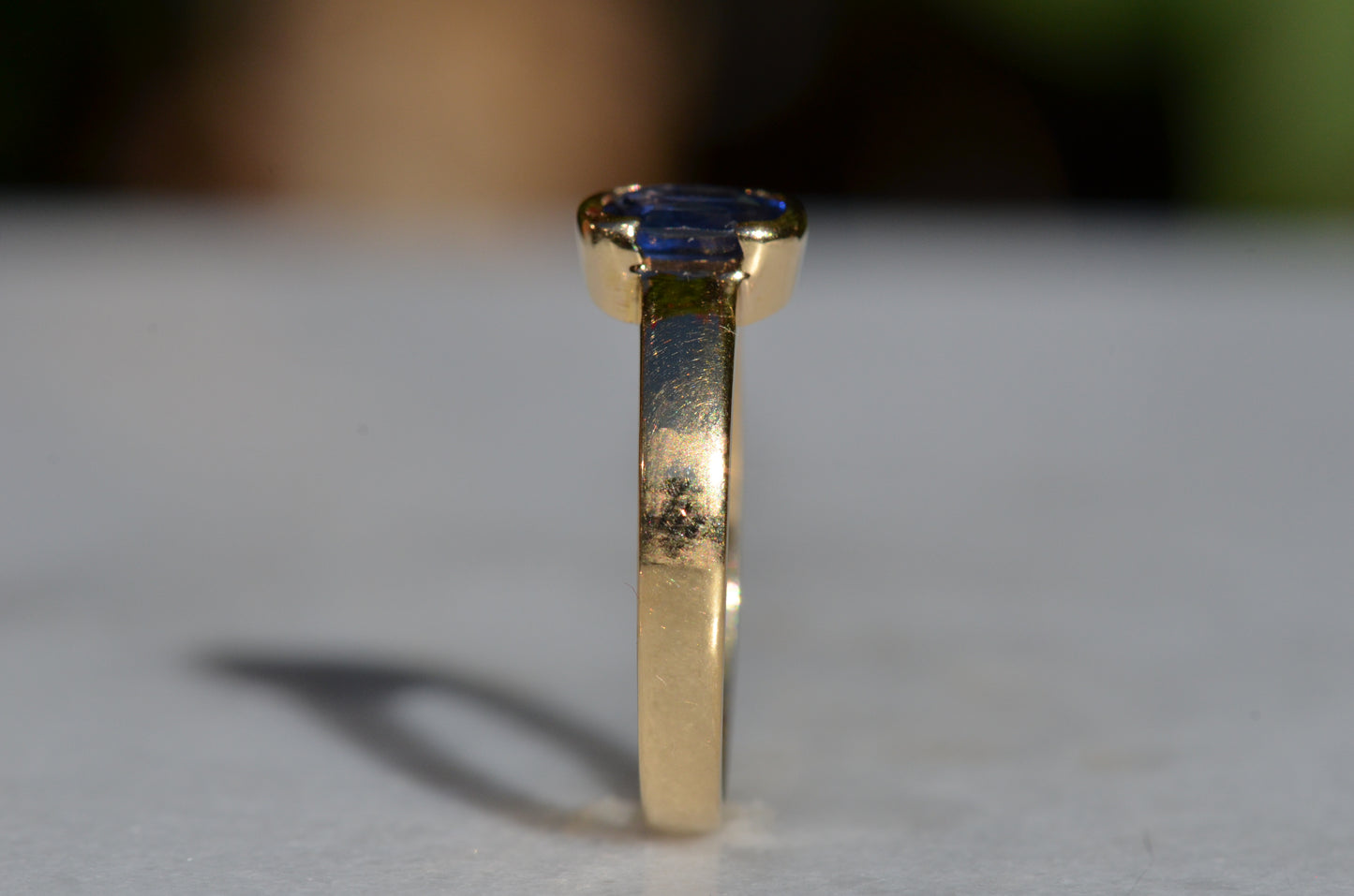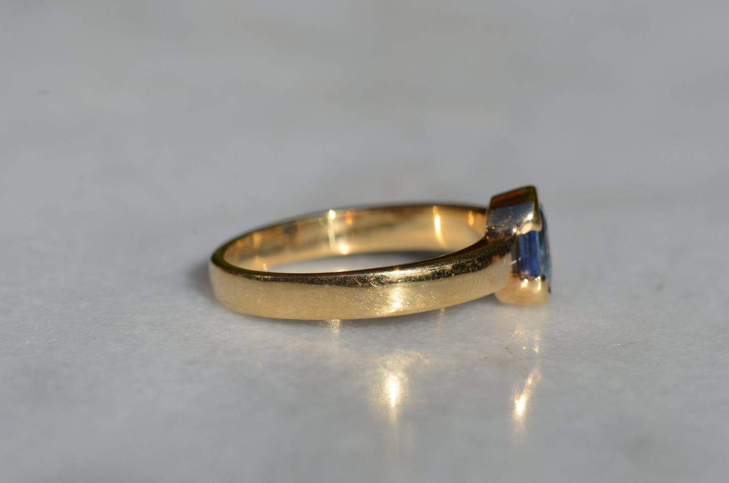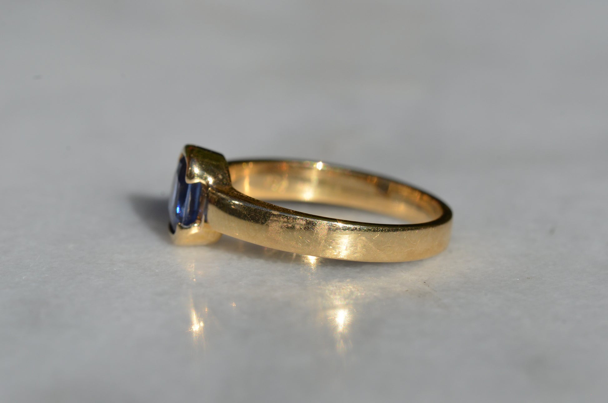 In this stunning solitaire, the broad and smooth band of rich yellow gold is the perfect foil for the star of the show: a velvety blue sapphire. The beloved September birthstone features natural colour zoning that presents as an almost alchemical shifting of different shades and saturations of blue throughout. A demi-bezel setting complements the cushion shape and wide band to great effect, with a result that is both beautiful and unfussy in its practicality.