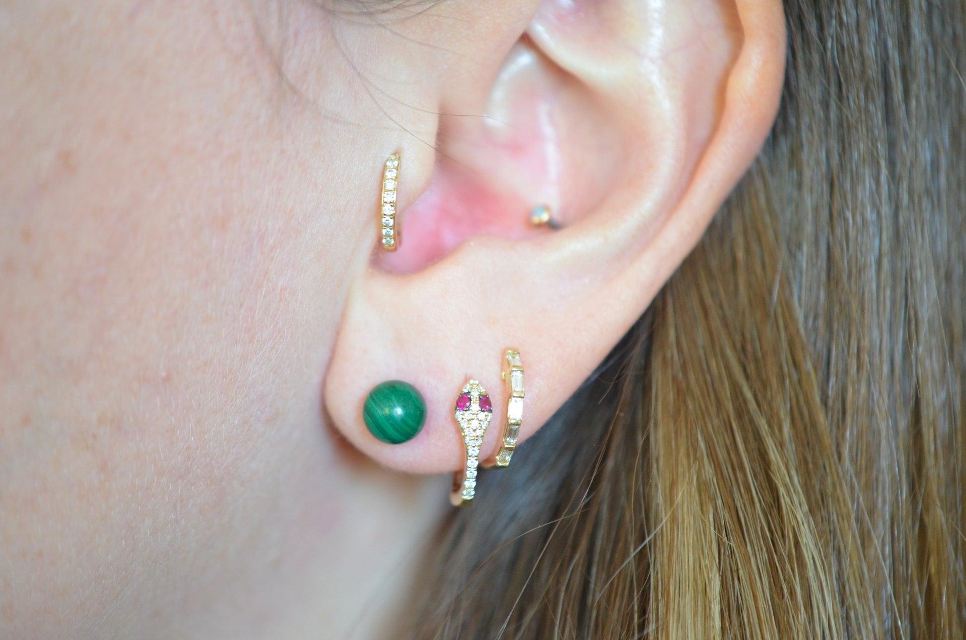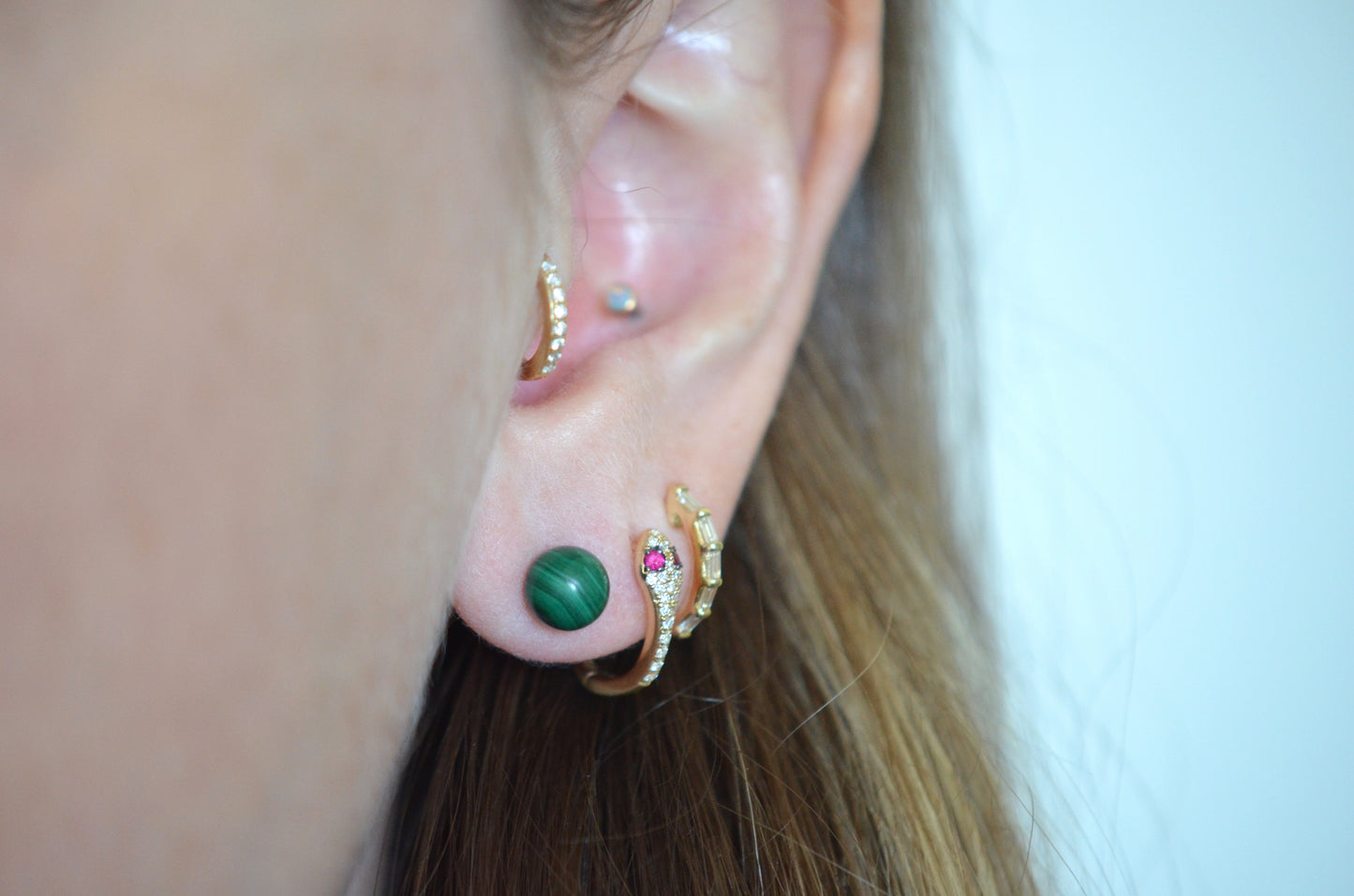There is something so dreamy about the specific, defined banding of malachite - at once earthy and otherworldly. With simple gold posts and no other embellishment, all focus is trained on the gorgeous gemstones. Small enough to wear in an ear stack yet bold enough to wear alone.