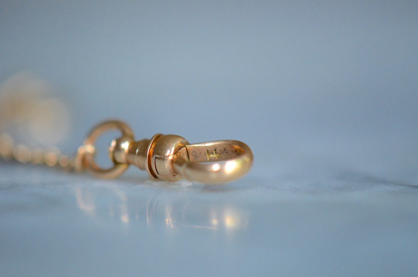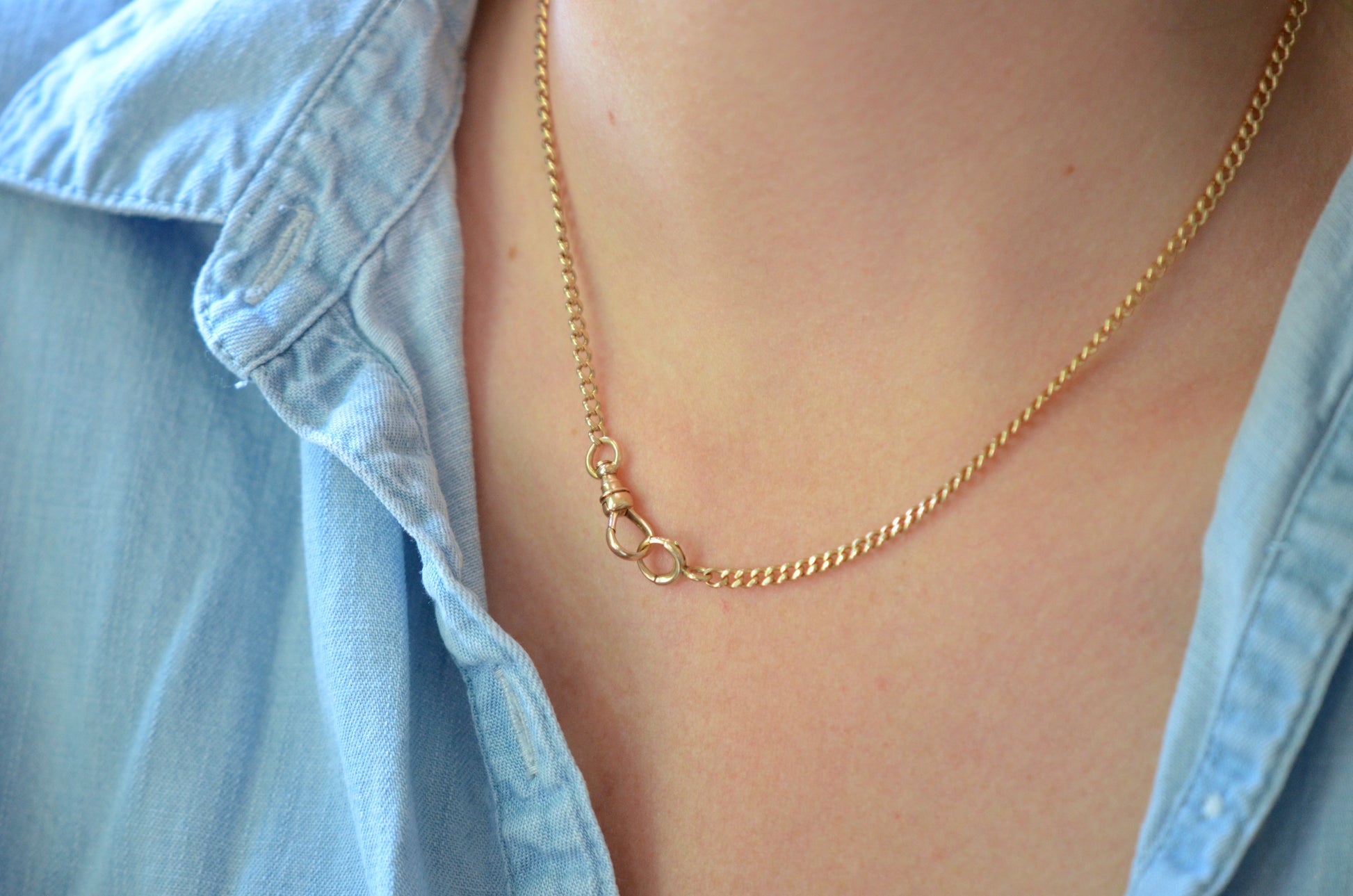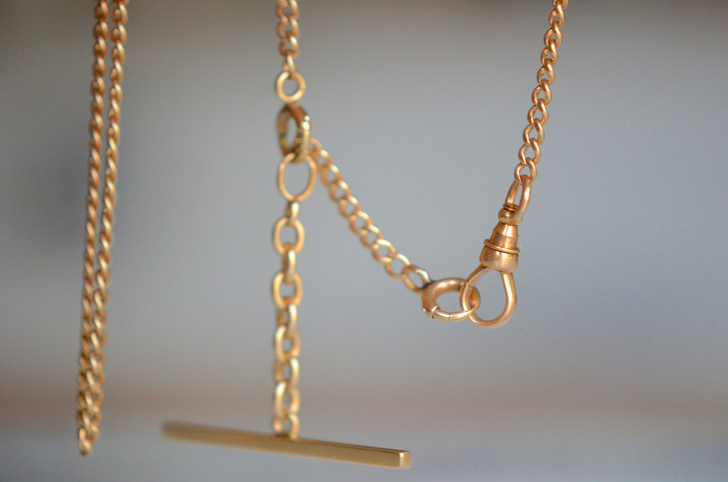 This Edwardian chain is absolutely perfect! Originally a chain to hold a pocket watch, it's an absolutely dreamy piece to add to or begin your ideal neck mess. With a removable segment, you have 16"-18" of usable chain, a t-bar that can detach on its own or come off with the 2" extender, and a large spring ring and single dog clip perfect for attaching charms directly or adding a loaded split ring full of them.