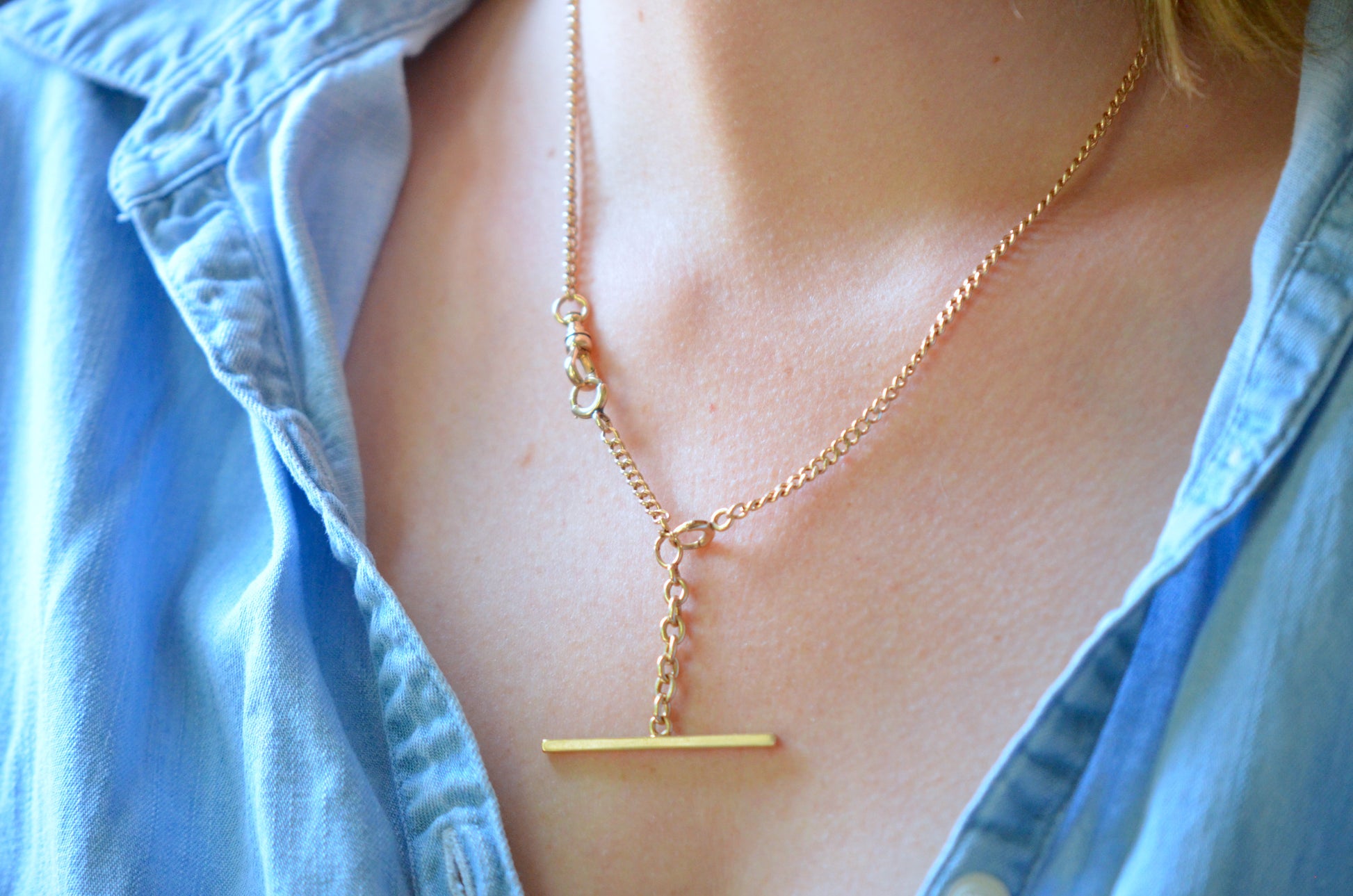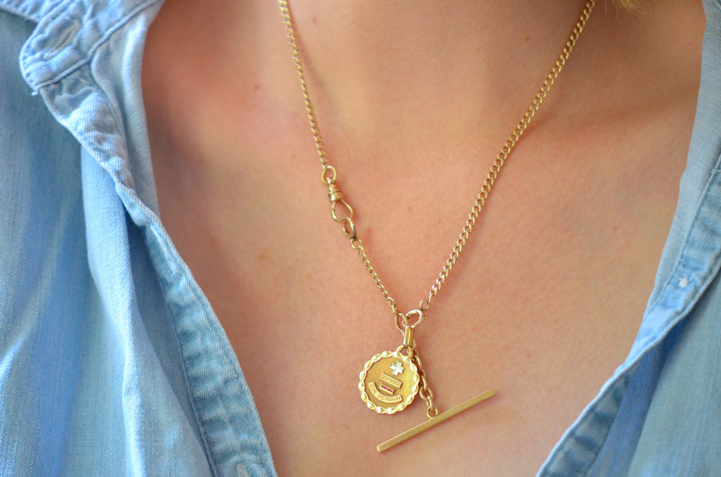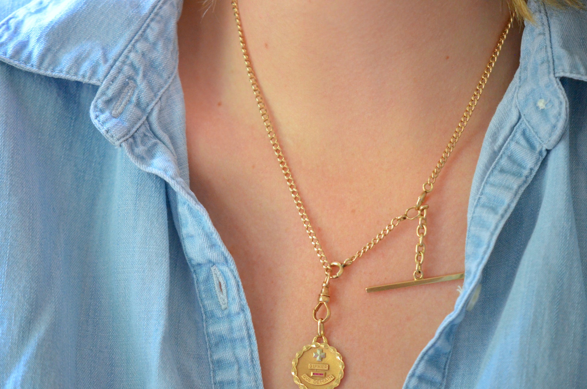 This Edwardian chain is absolutely perfect! Originally a chain to hold a pocket watch, it's an absolutely dreamy piece to add to or begin your ideal neck mess. With a removable segment, you have 16"-18" of usable chain, a t-bar that can detach on its own or come off with the 2" extender, and a large spring ring and single dog clip perfect for attaching charms directly or adding a loaded split ring full of them.