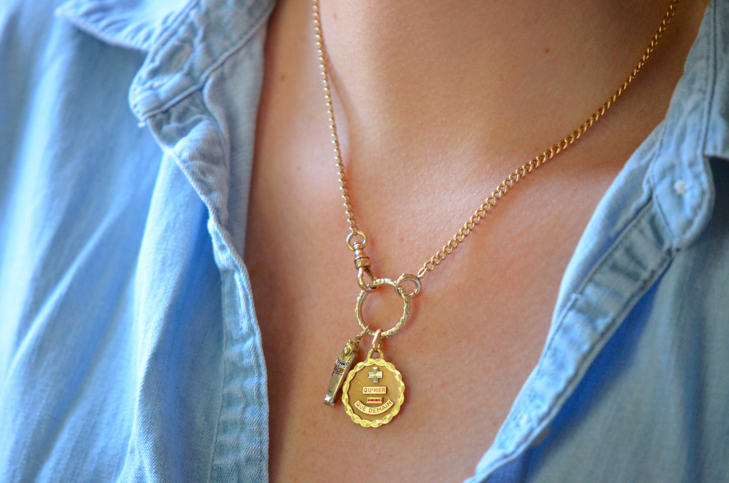 The chain has a perfect weight for everyday wear - heavy enough to feel a little presence, but not so heavy that you can't layer it with other pieces. The extra segment has a change in link styles for added visual interest, and though definitely yellow gold the piece has a soft warm patina that gives it a slight rosy glow.