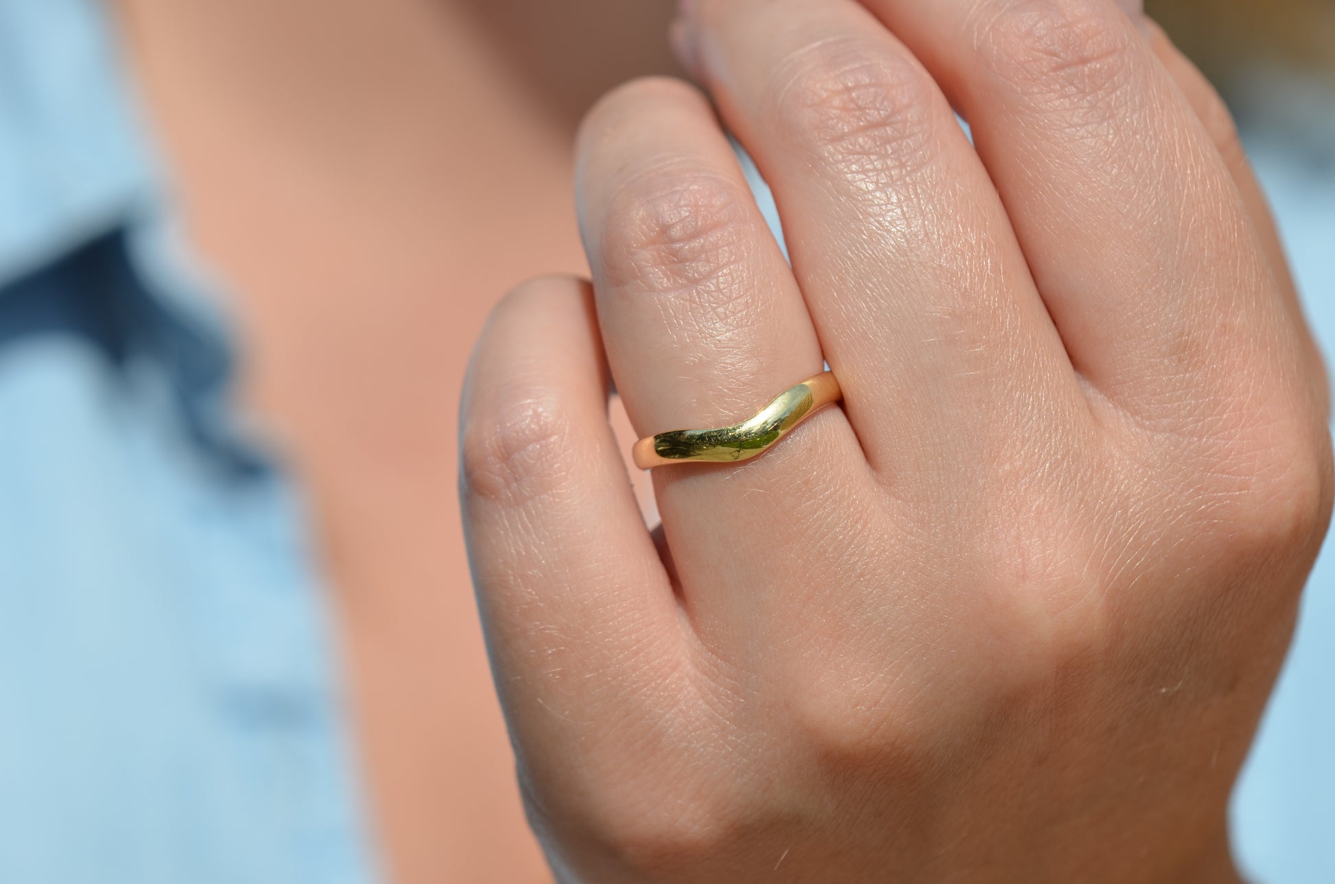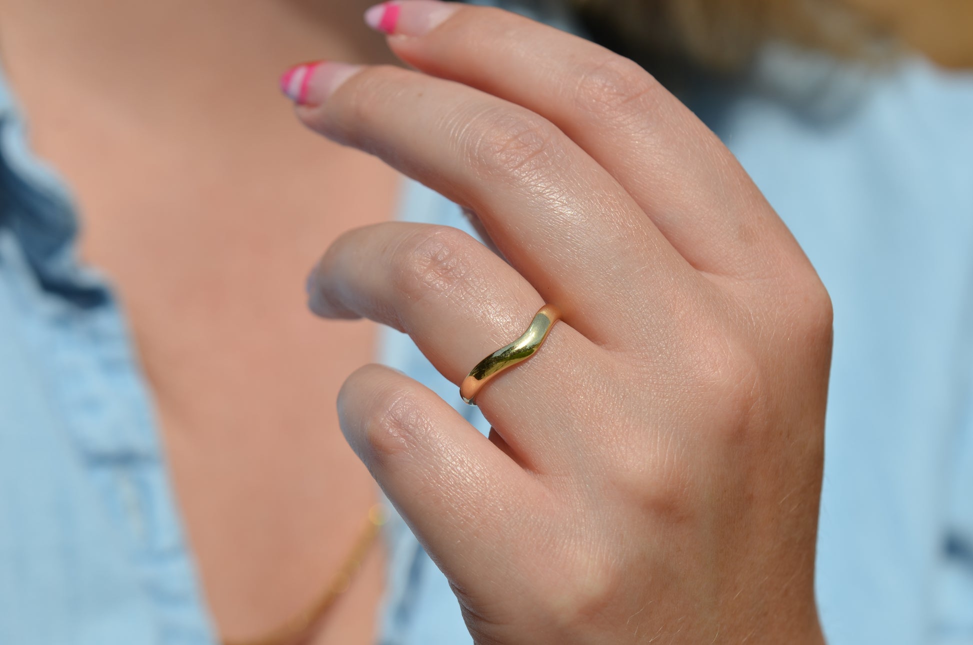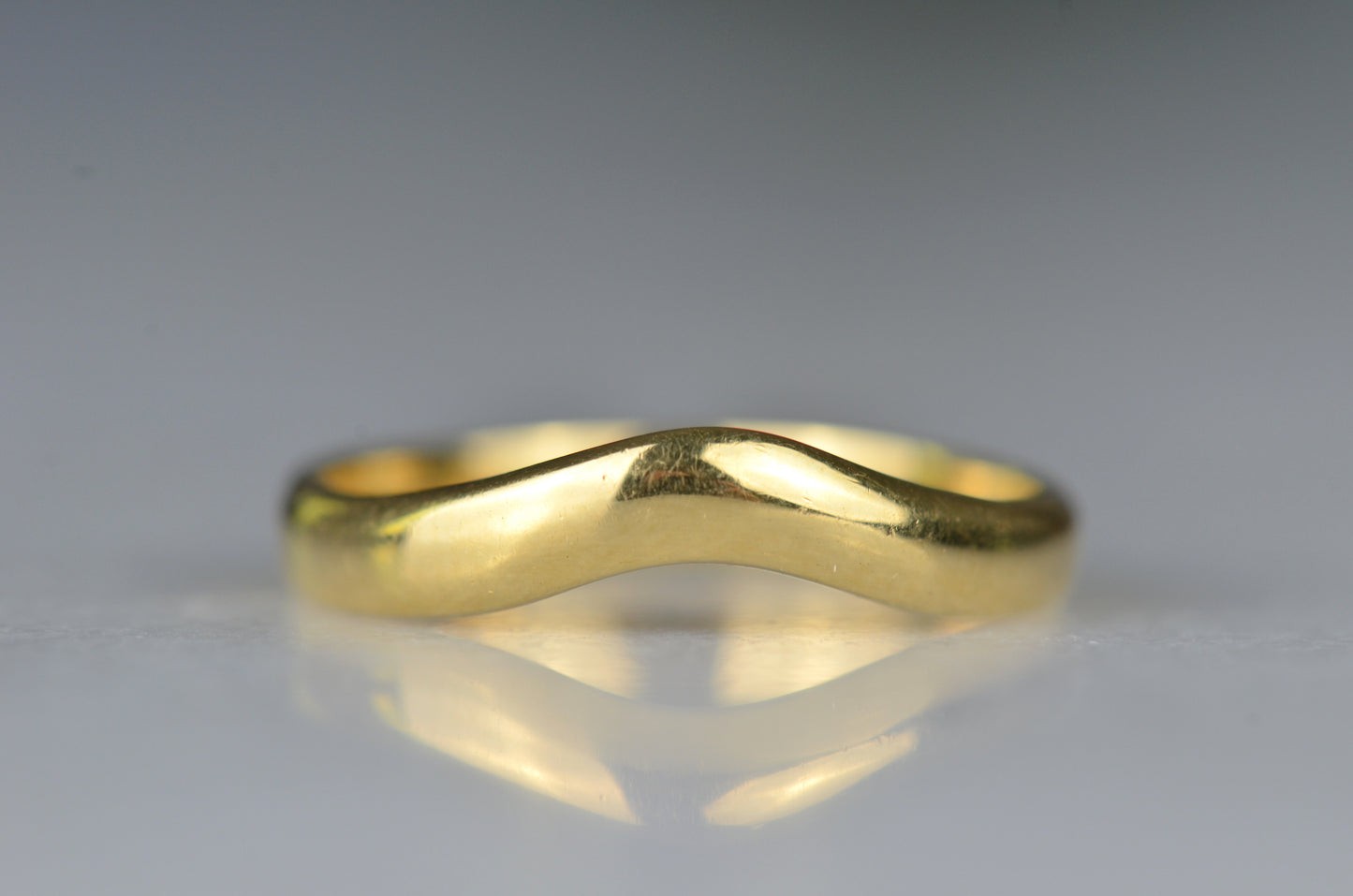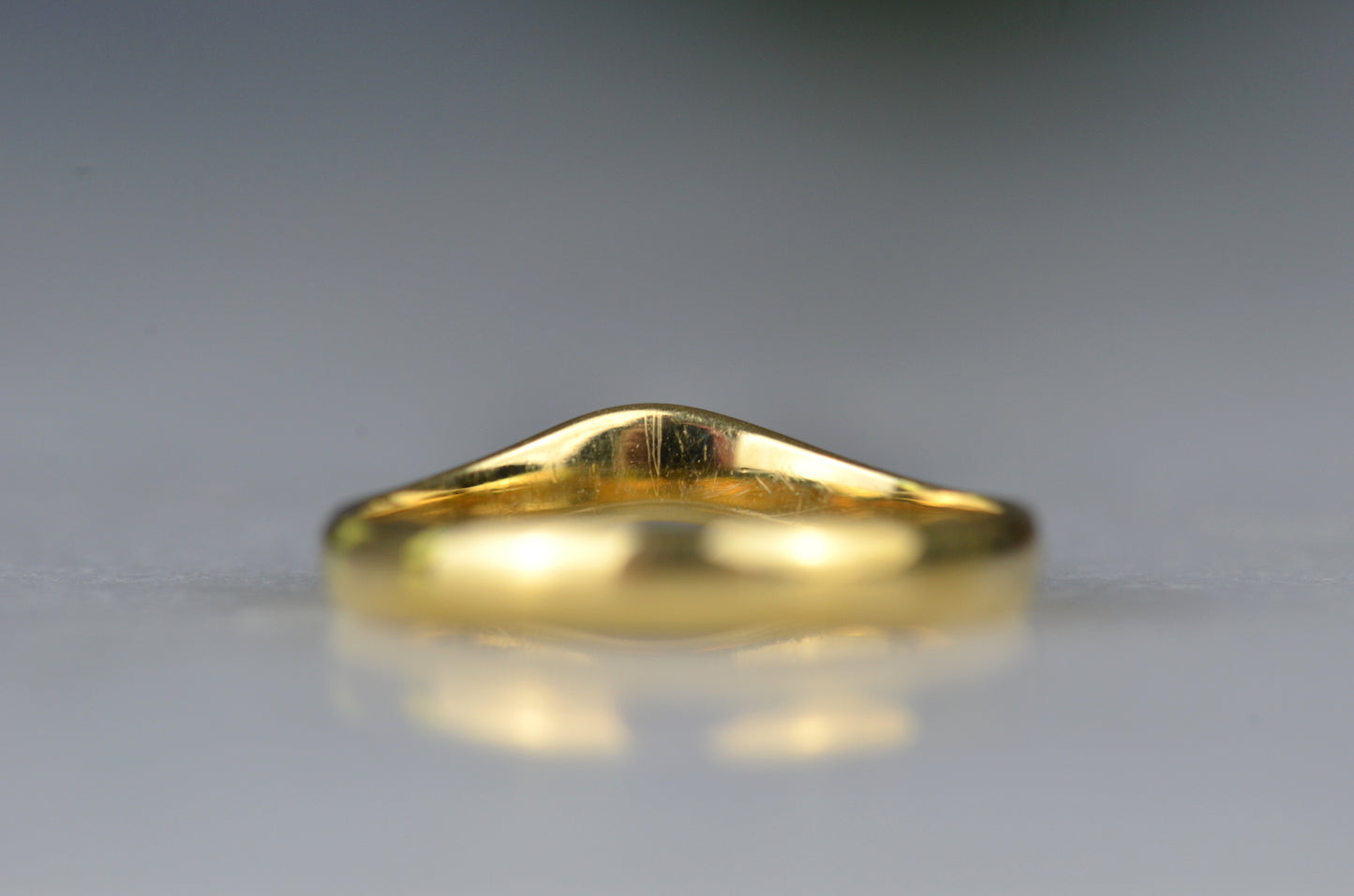 Simple, sweet, and one of those magic bands that seems to just fit with everything! A gentle scoop in an otherwise straight band allows for a snug fit with so many different styles of rings: engagement rings, signet rings, swirling coiled snake rings - even gorgeous stacked against a straight band, adding interest with negative space.