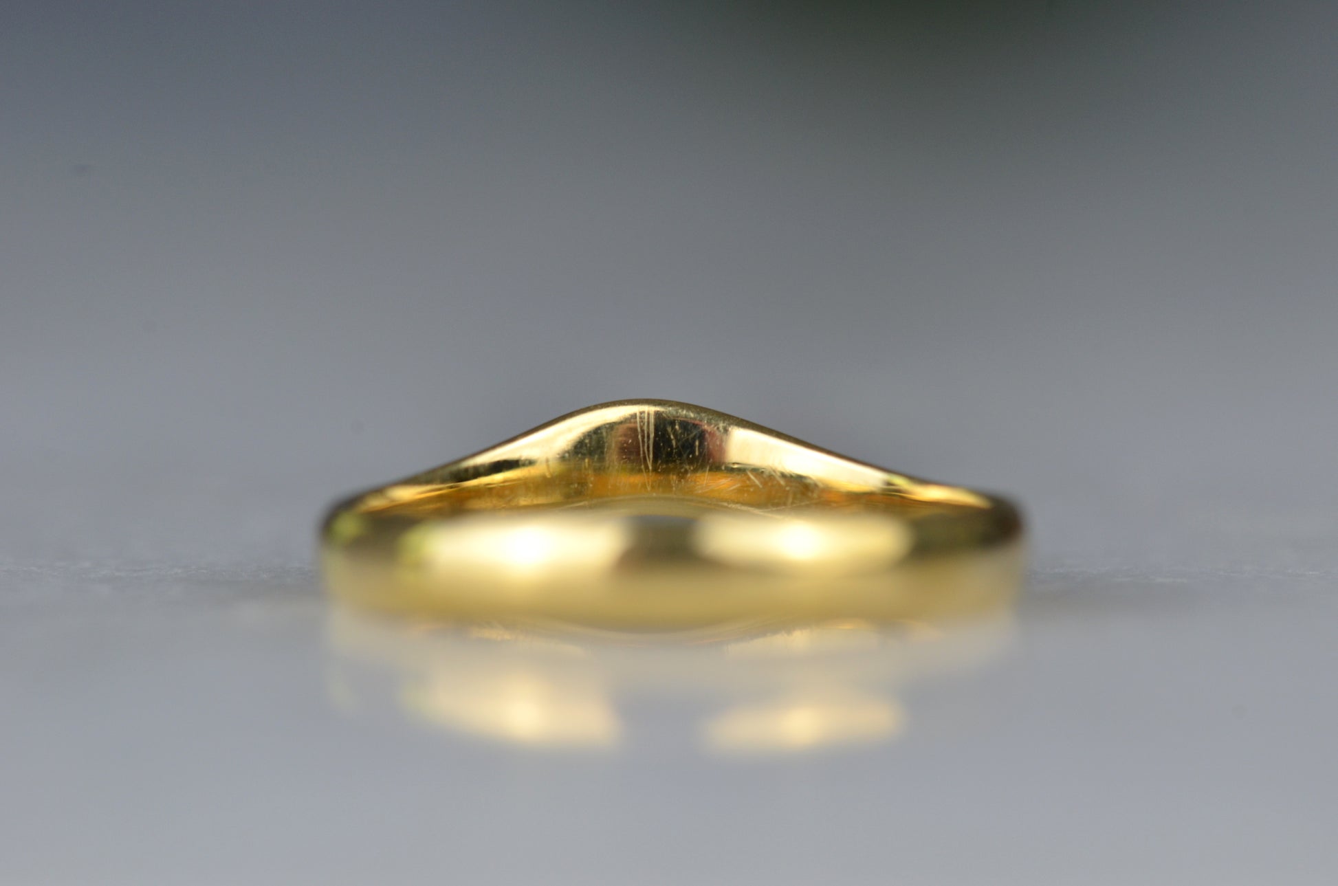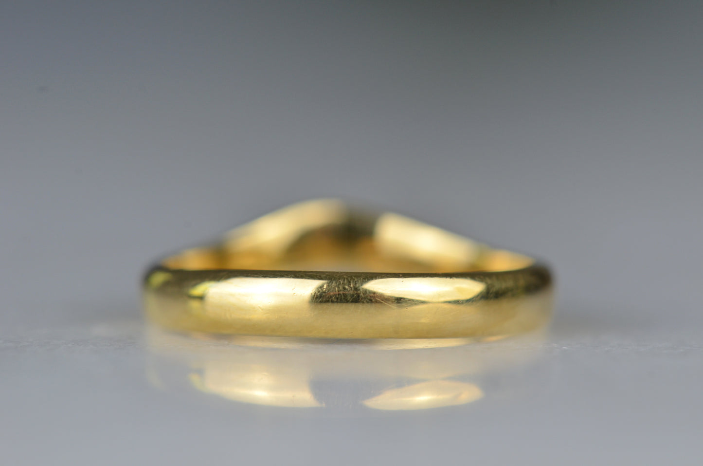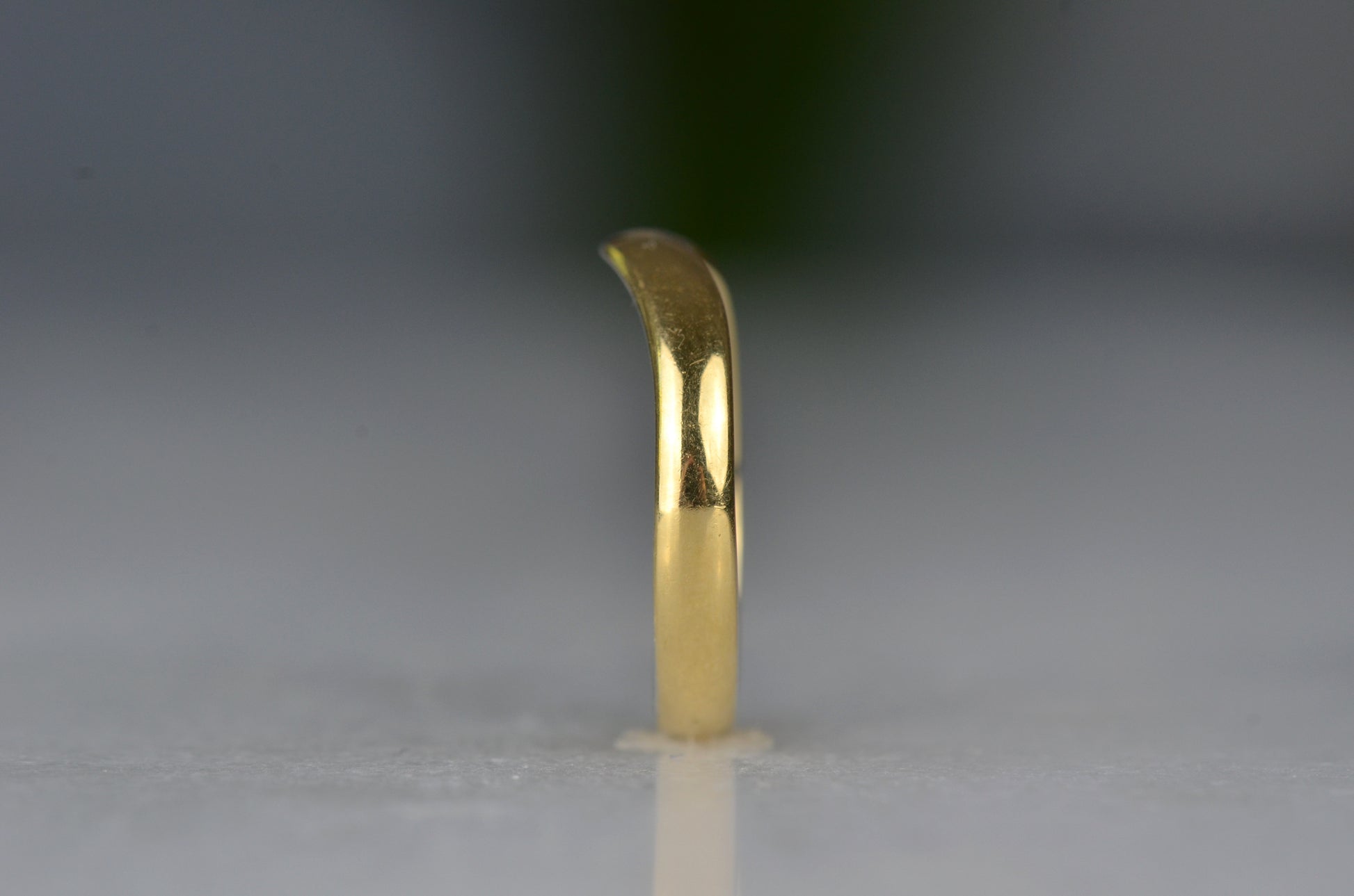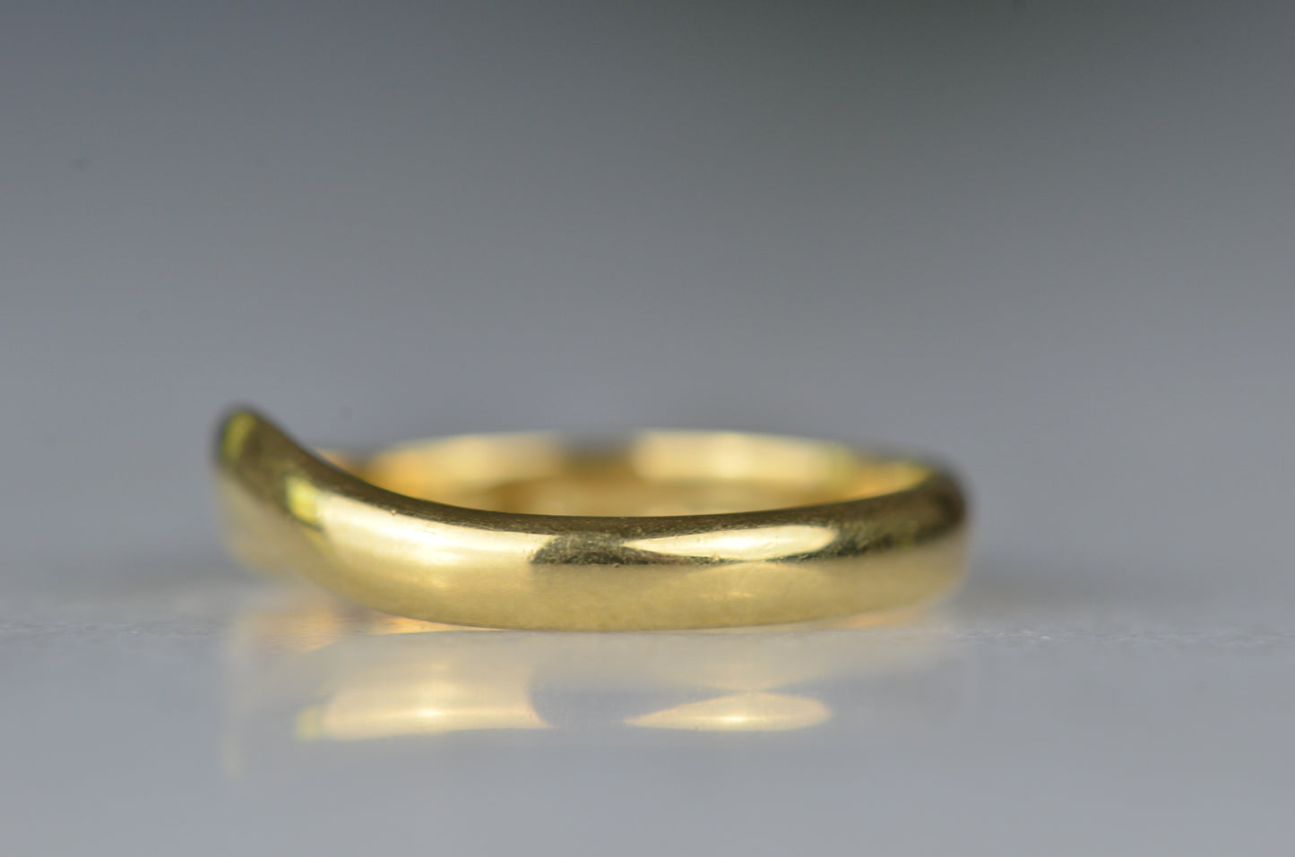 Simple, sweet, and one of those magic bands that seems to just fit with everything! A gentle scoop in an otherwise straight band allows for a snug fit with so many different styles of rings: engagement rings, signet rings, swirling coiled snake rings - even gorgeous stacked against a straight band, adding interest with negative space.