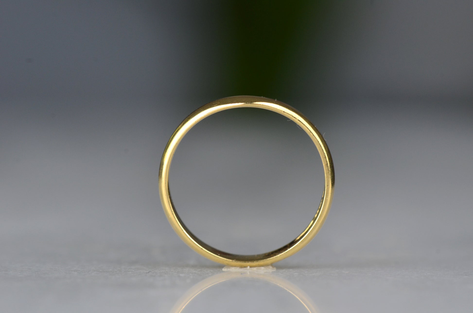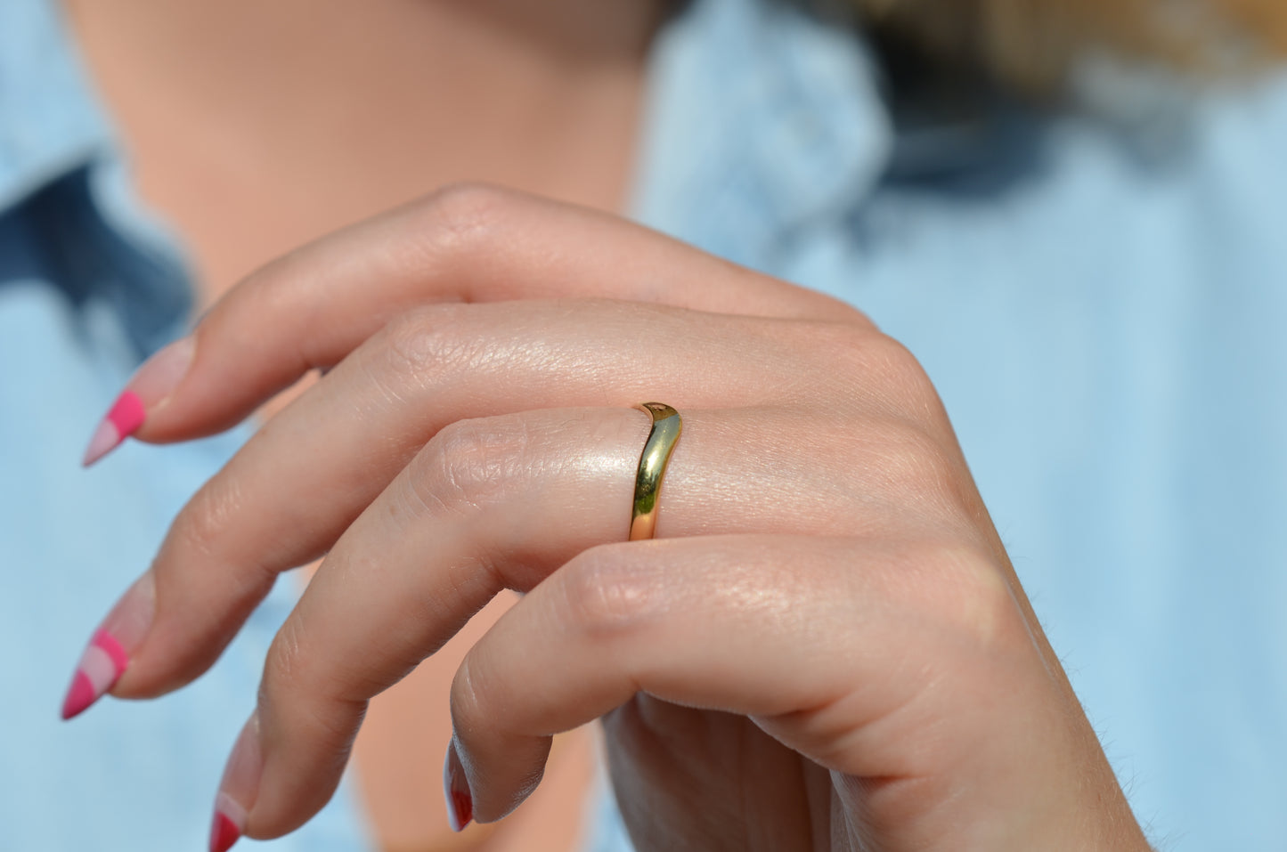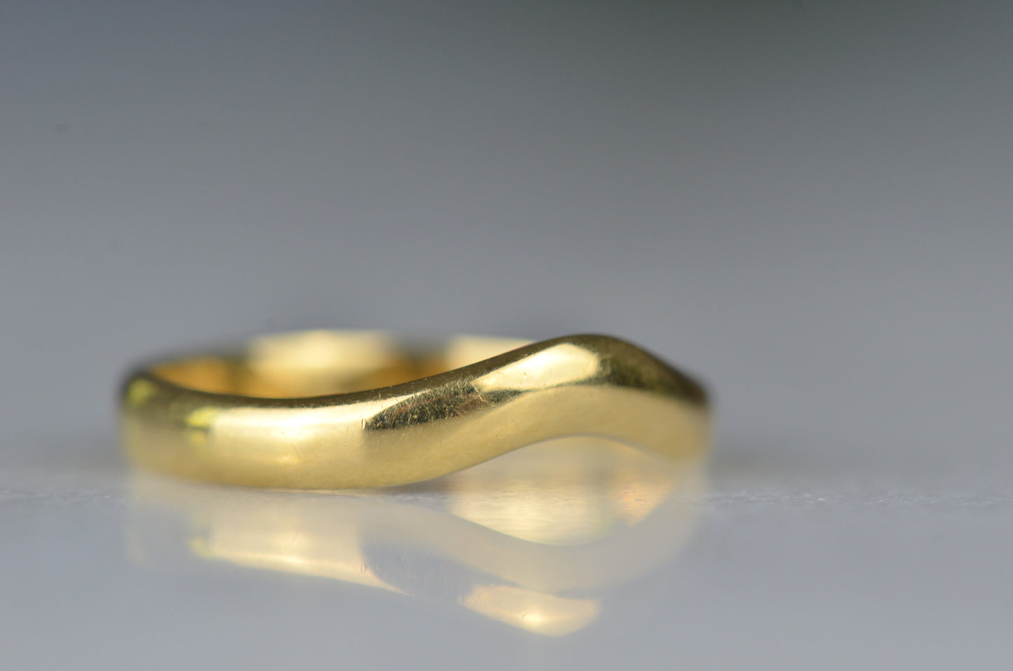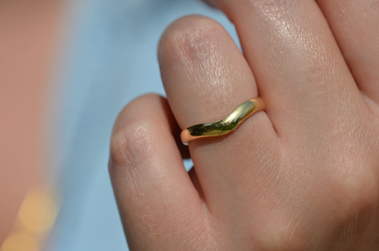 Simple, sweet, and one of those magic bands that seems to just fit with everything! A gentle scoop in an otherwise straight band allows for a snug fit with so many different styles of rings: engagement rings, signet rings, swirling coiled snake rings - even gorgeous stacked against a straight band, adding interest with negative space.