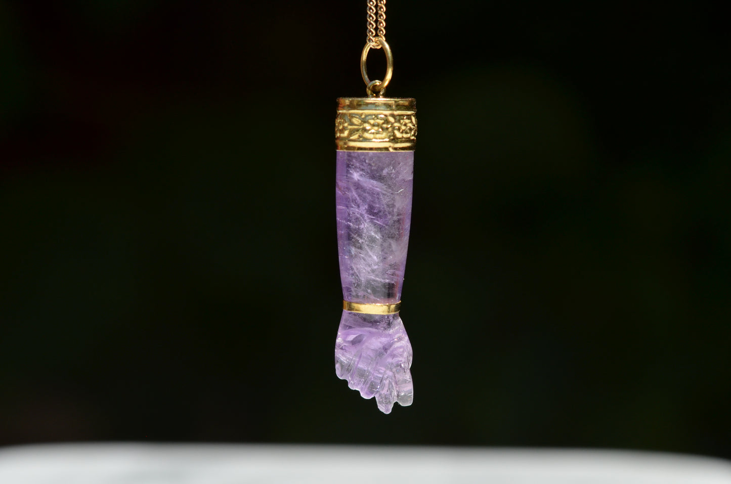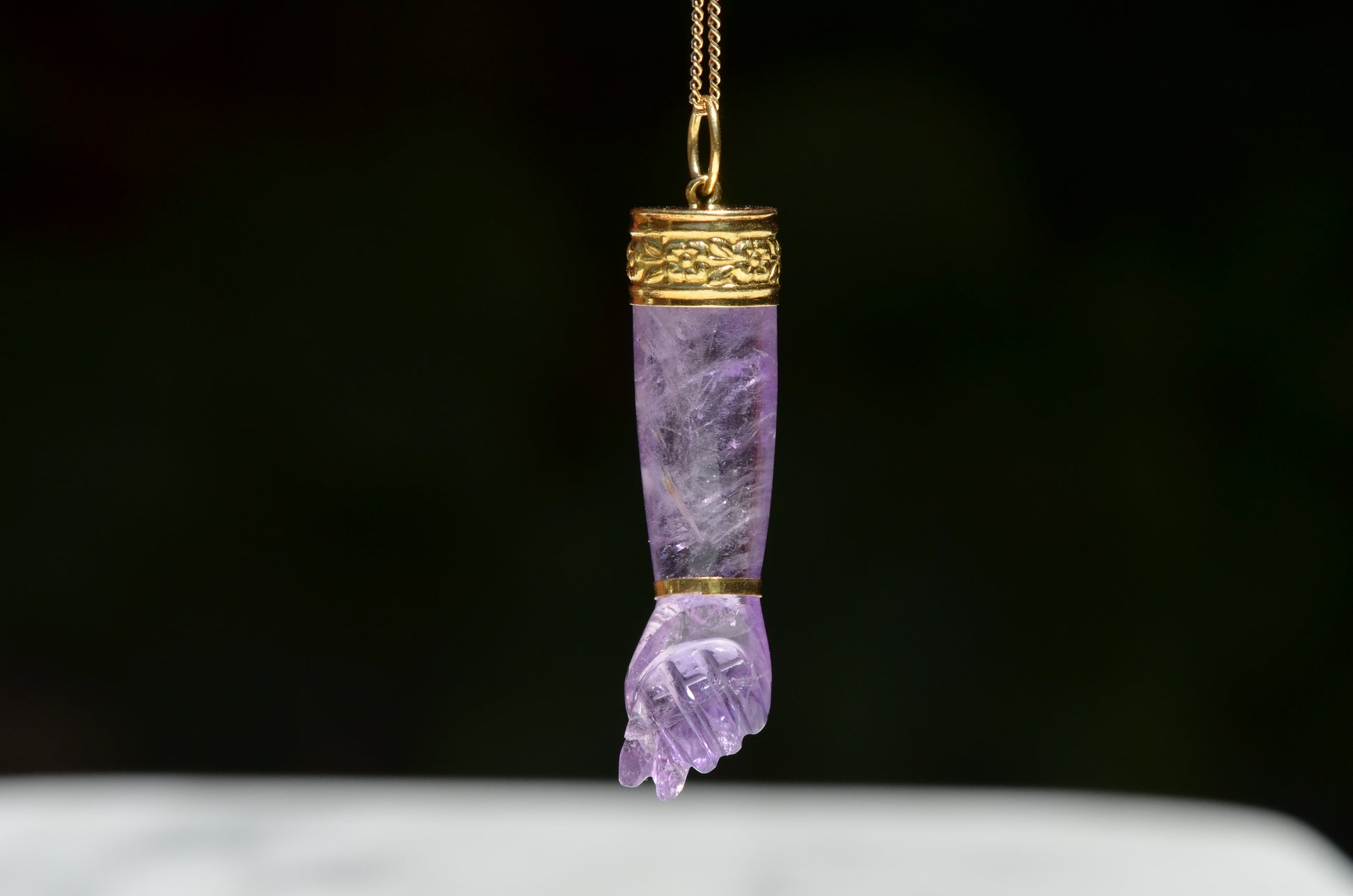 The mano figa (figa being Italian for fig, slang for female genitalia) comes to us as a talisman from Etruscan Italy, though the sign has been used as an obscene gesture throughout cultures for nearly 8,000 years. In ancient times, the amulet was worn as an invocation of fertility and virility, particularly through its reference to femininity. Around the 17th century, the talismans began to rise in popularity in South America - particularly Peru and Brazil - and the symbol is often worn to ward off the evil eye: the gesture is so obscene that it will even distract Satan.