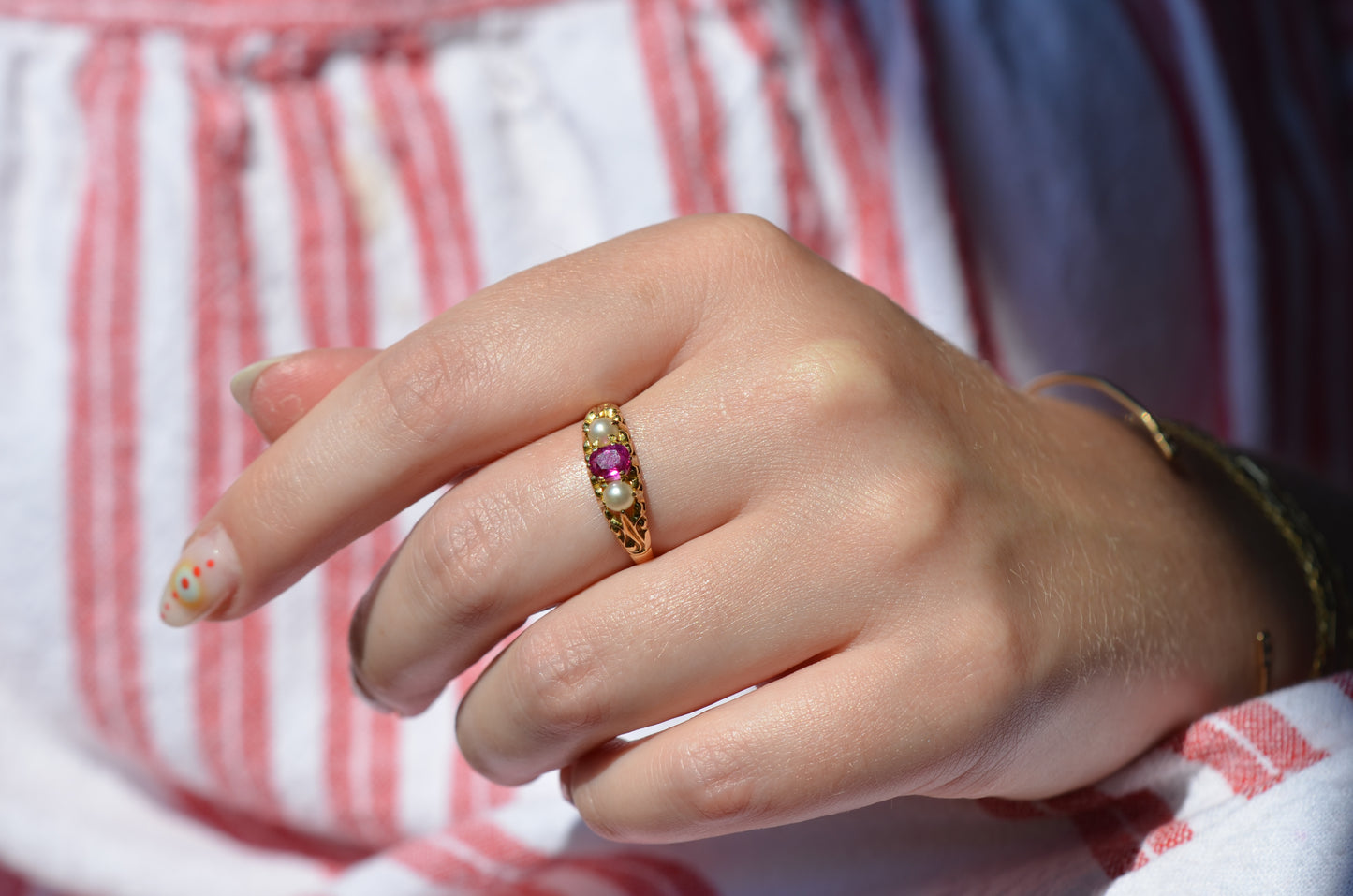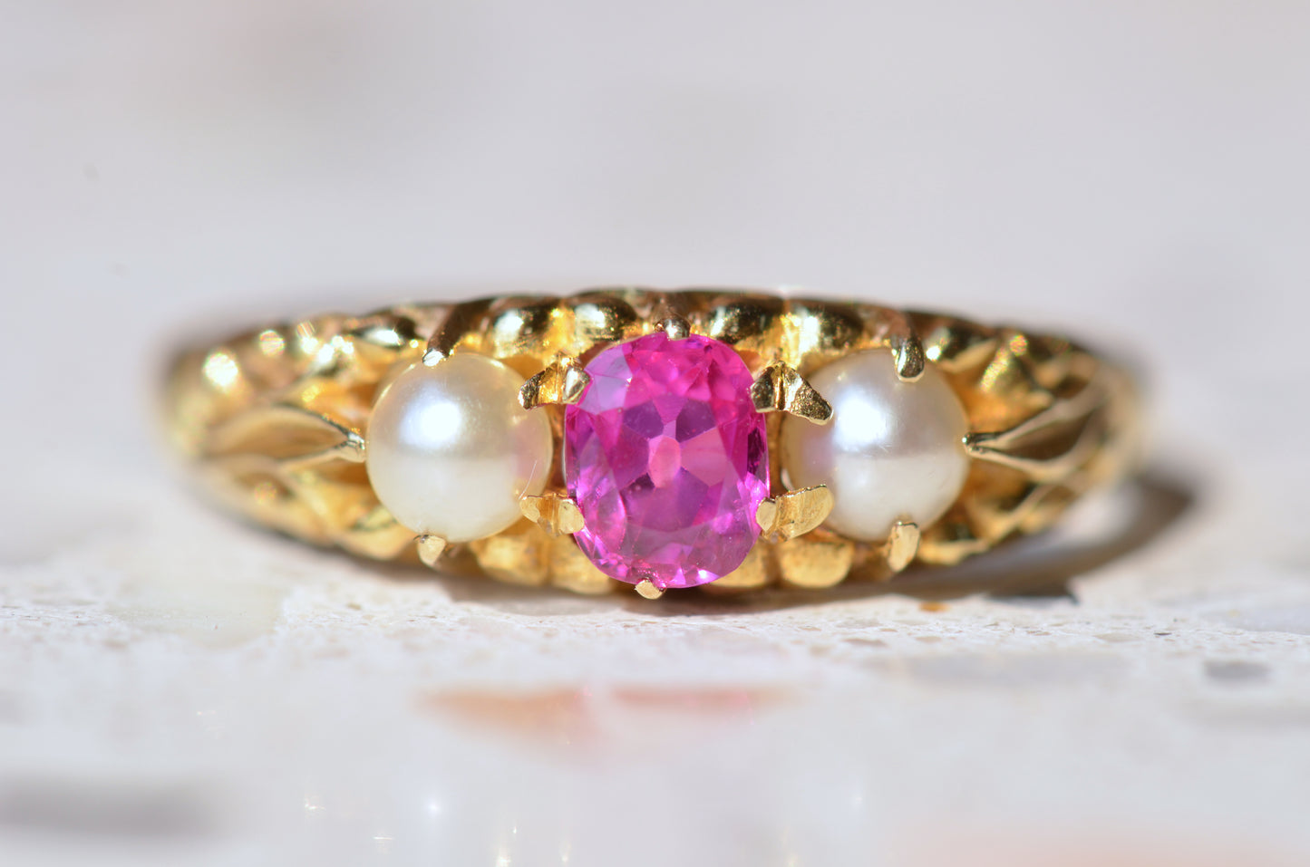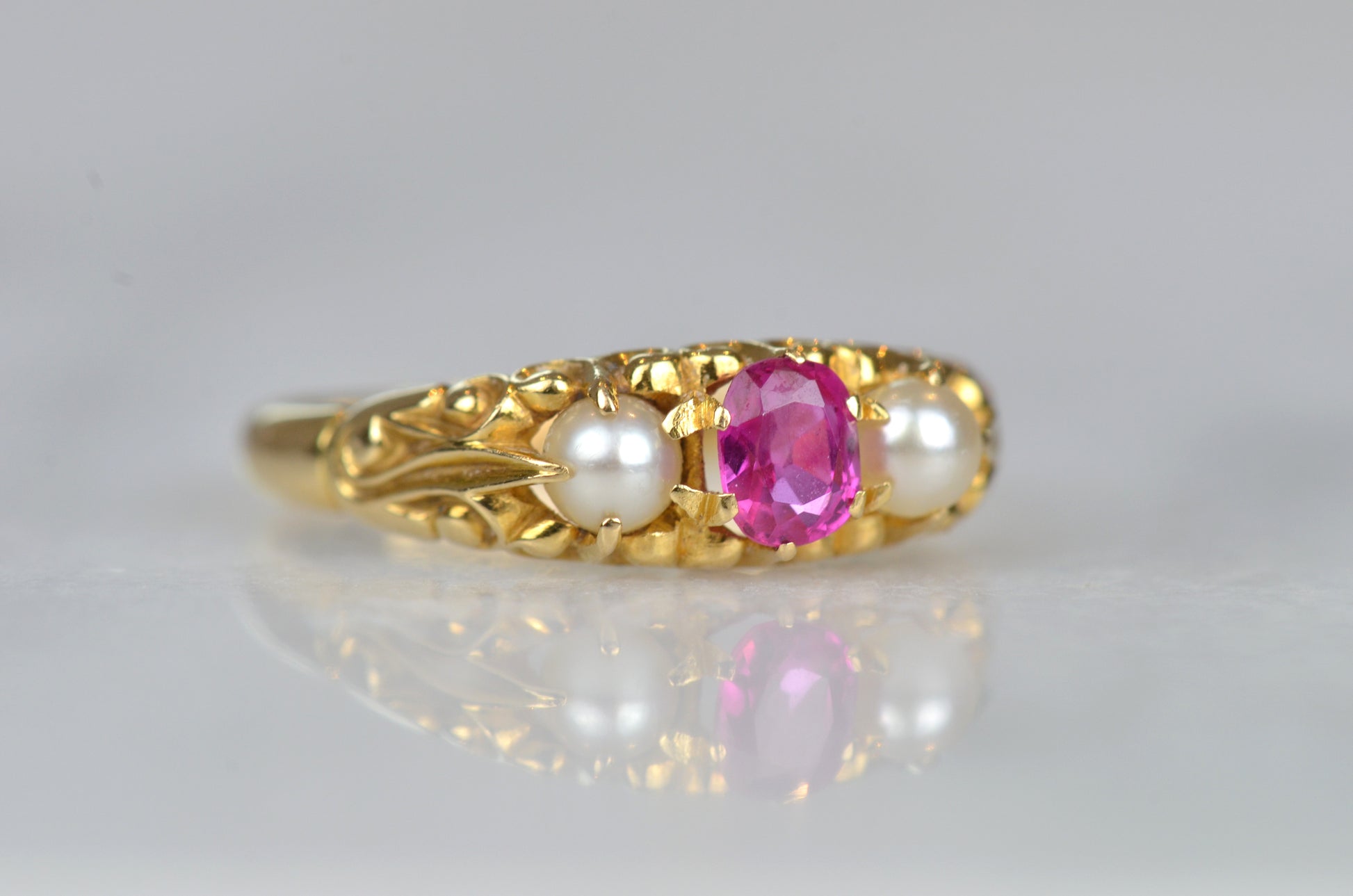 Vibrant Vintage Pink Sapphire and Pearl Ring