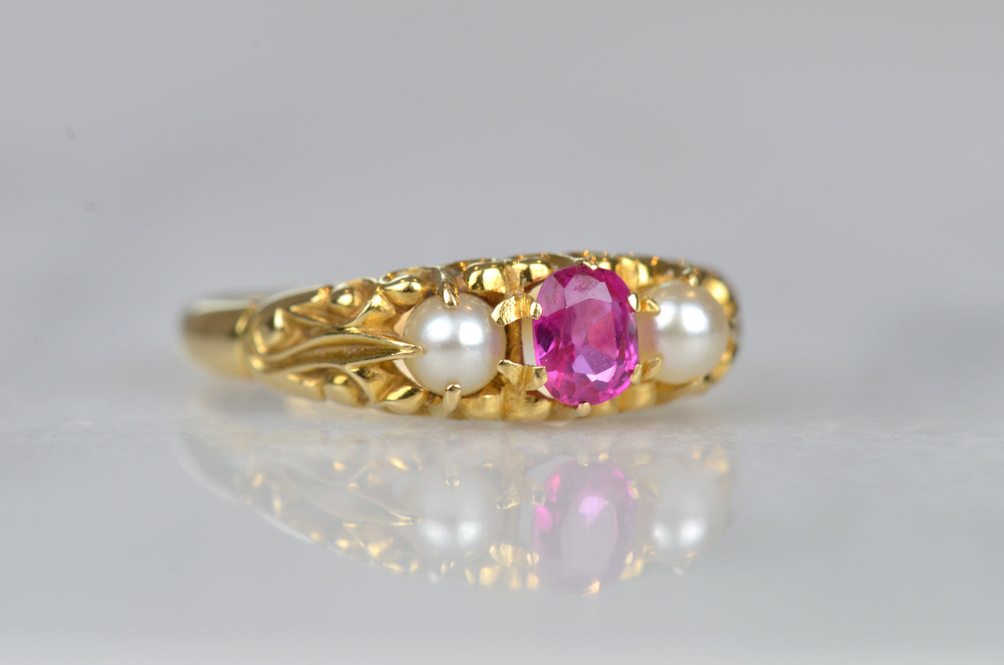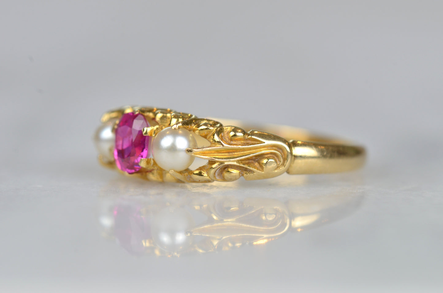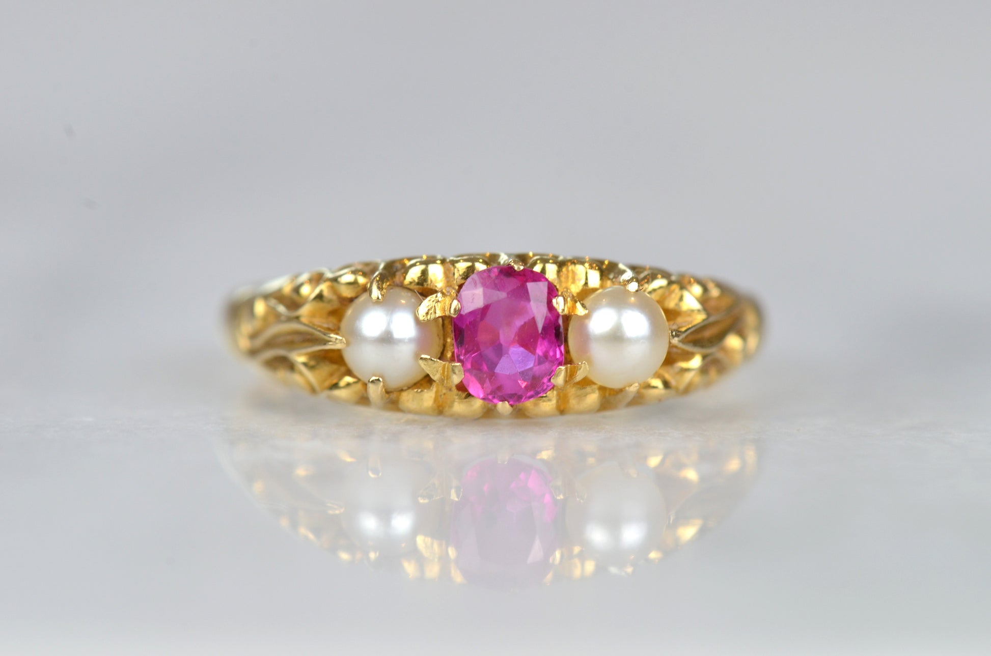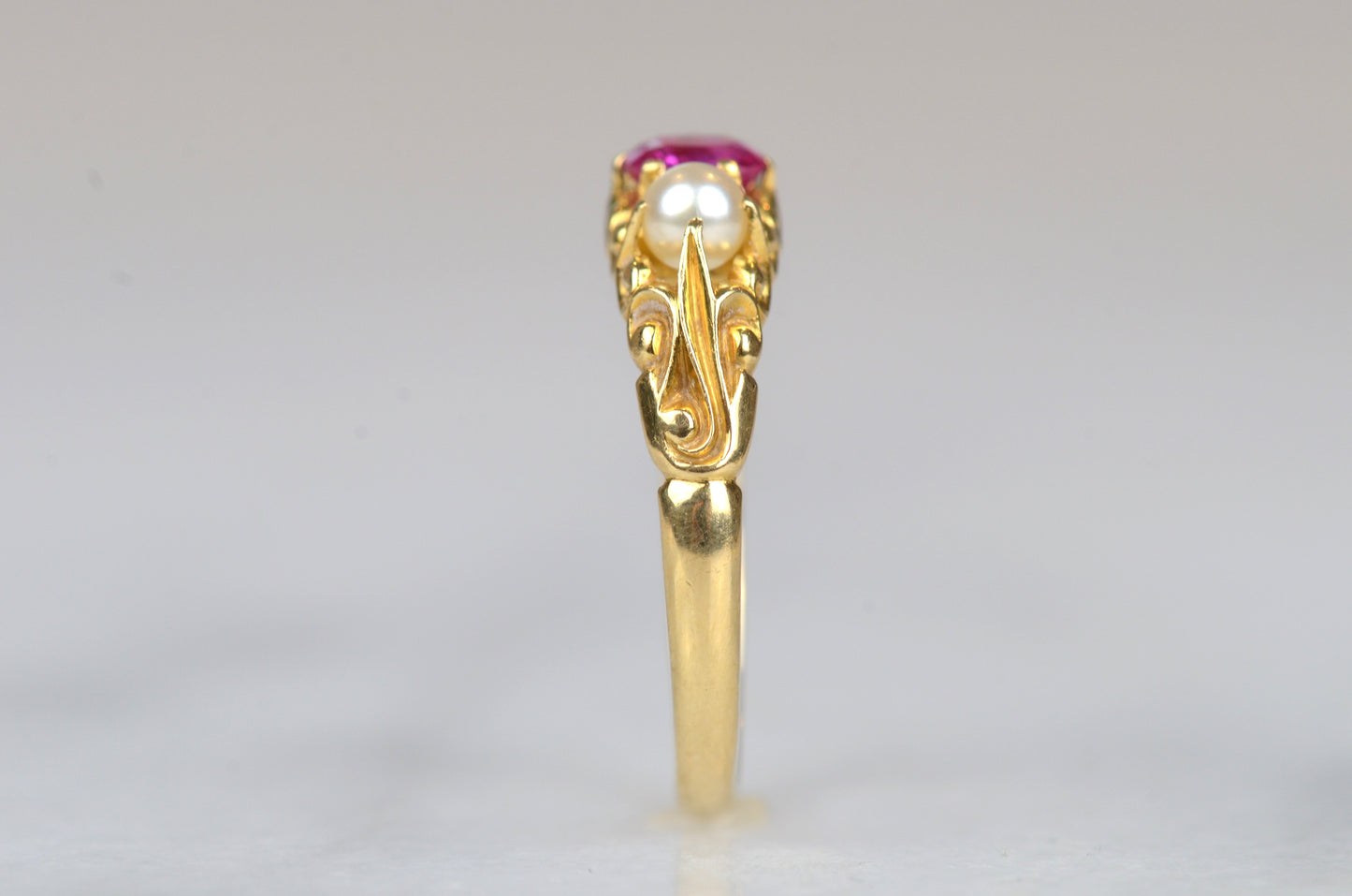 A gorgeous Victorian-inspired ring featuring a vivid pink sapphire flanked by two creamy white pearls in a scalloped and scrolling setting. Often these Victorian Revival rings are lightweight and hollowed out, but this piece has a rich, heavy band and mount, as well as a lovely old cut elongated cushion at its heart. It's clear that someone has tinkered a little with the pearls - one set low while the other is at a jaunty height - but their milky white bodies are the perfect foil for the fiery saturation of the pink sapphire. Though a bit too light and with slight violetish undertones that prevent it from truly being classified as a ruby, the stone has a distinct romance and charm.