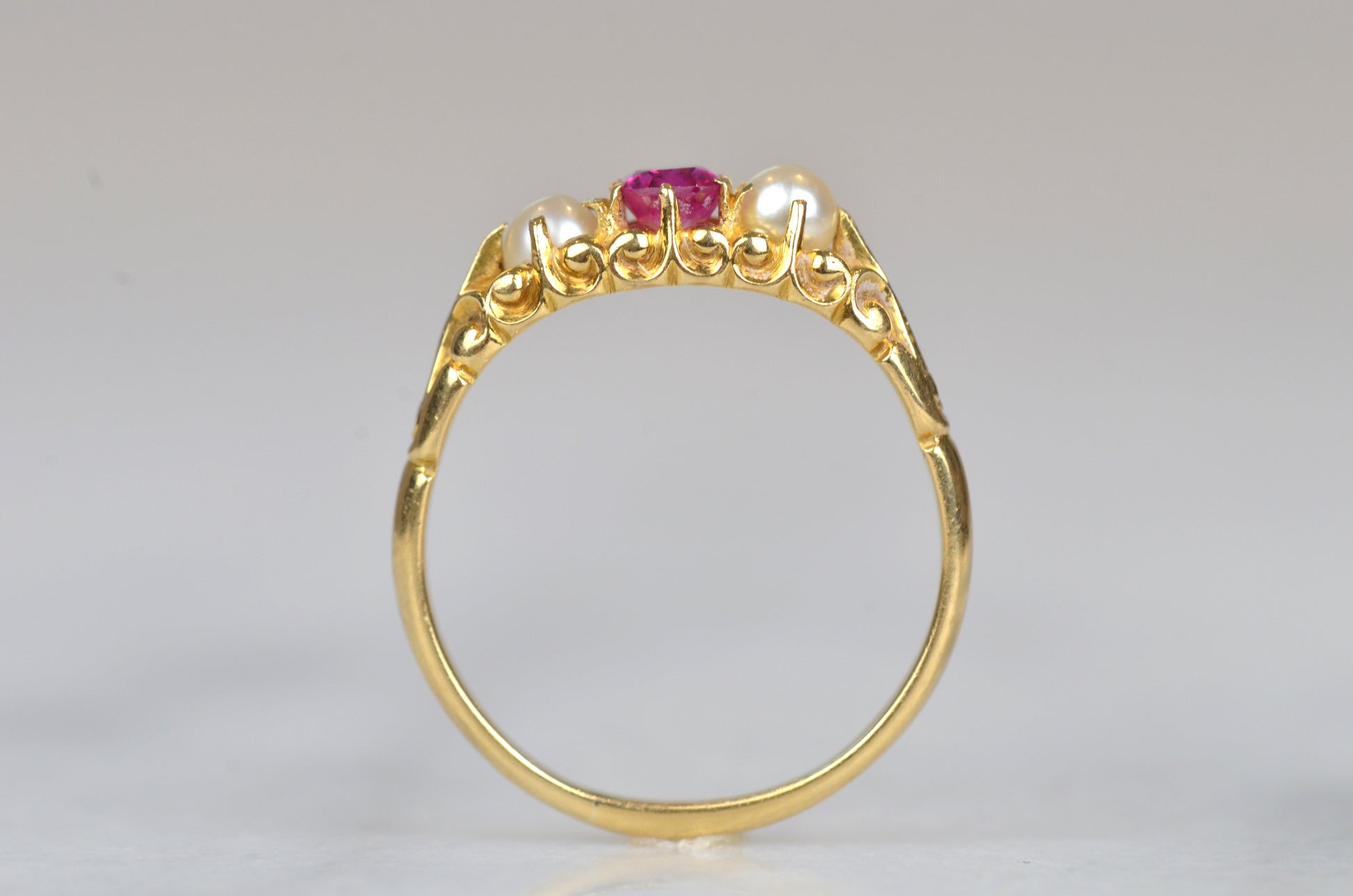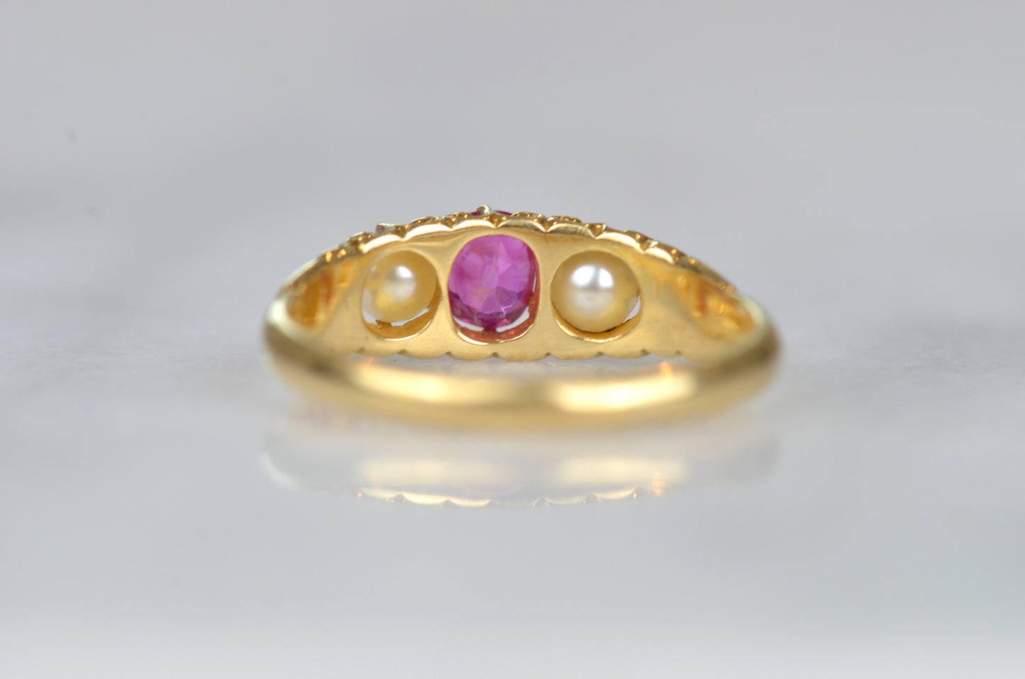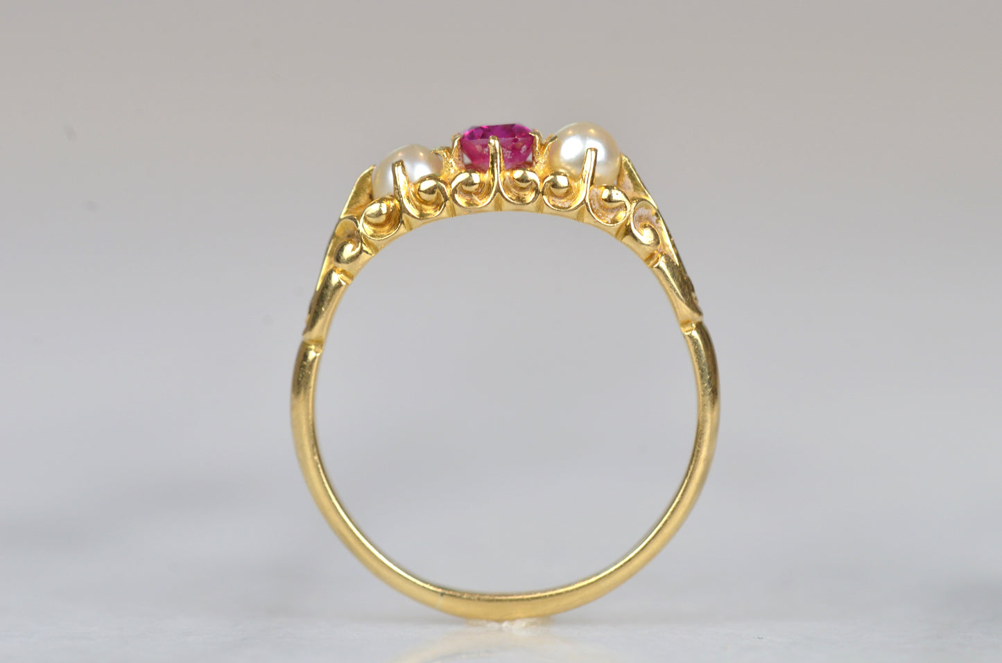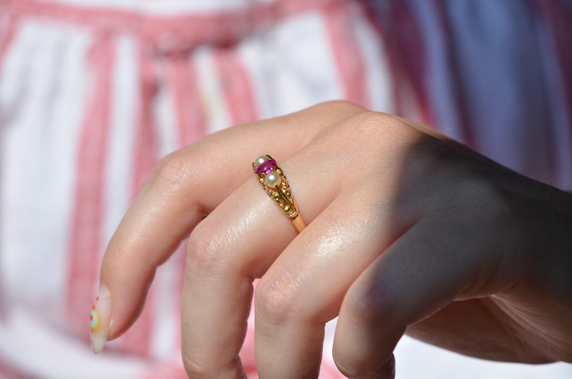 A gorgeous Victorian-inspired ring featuring a vivid pink sapphire flanked by two creamy white pearls in a scalloped and scrolling setting. Often these Victorian Revival rings are lightweight and hollowed out, but this piece has a rich, heavy band and mount, as well as a lovely old cut elongated cushion at its heart. It's clear that someone has tinkered a little with the pearls - one set low while the other is at a jaunty height - but their milky white bodies are the perfect foil for the fiery saturation of the pink sapphire. Though a bit too light and with slight violetish undertones that prevent it from truly being classified as a ruby, the stone has a distinct romance and charm.