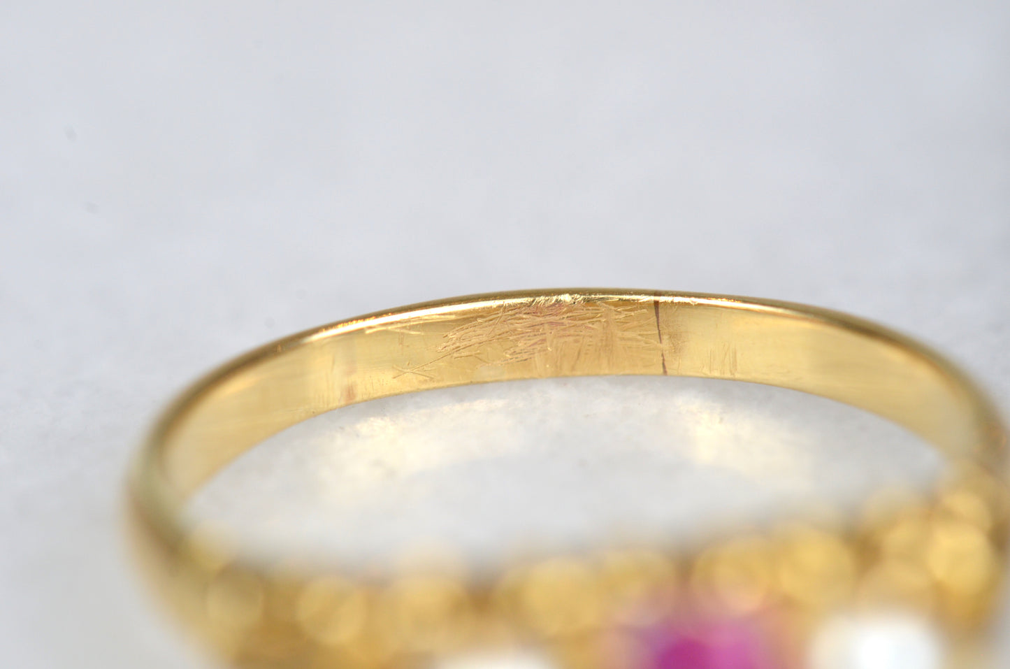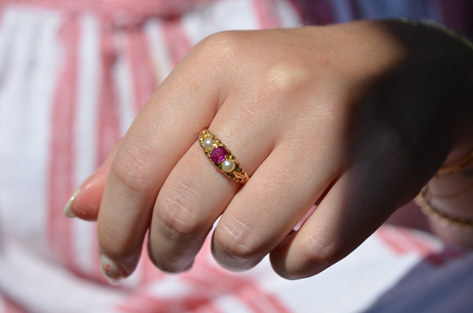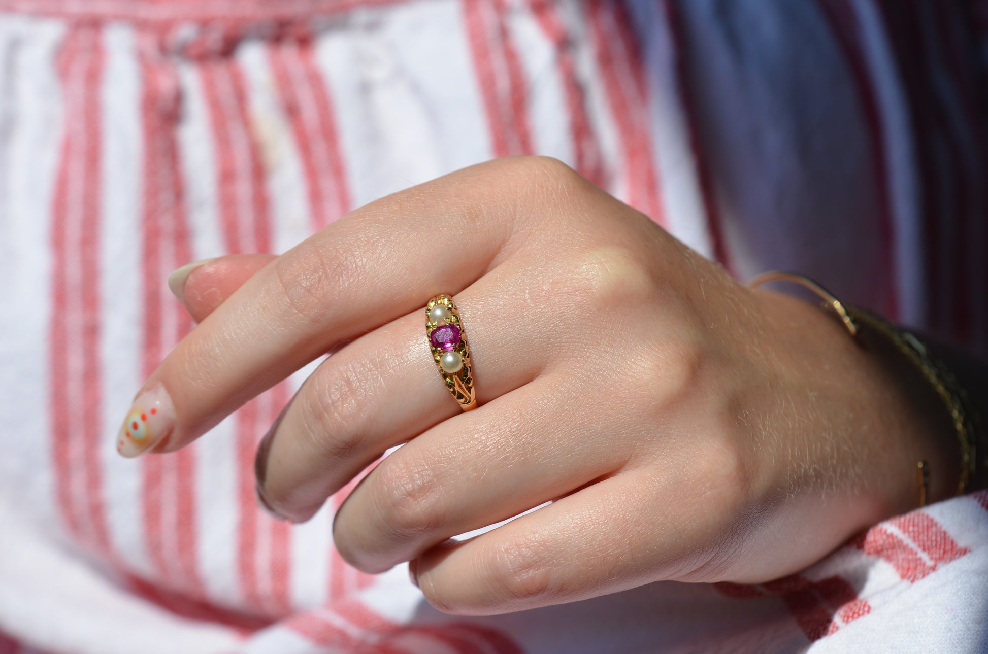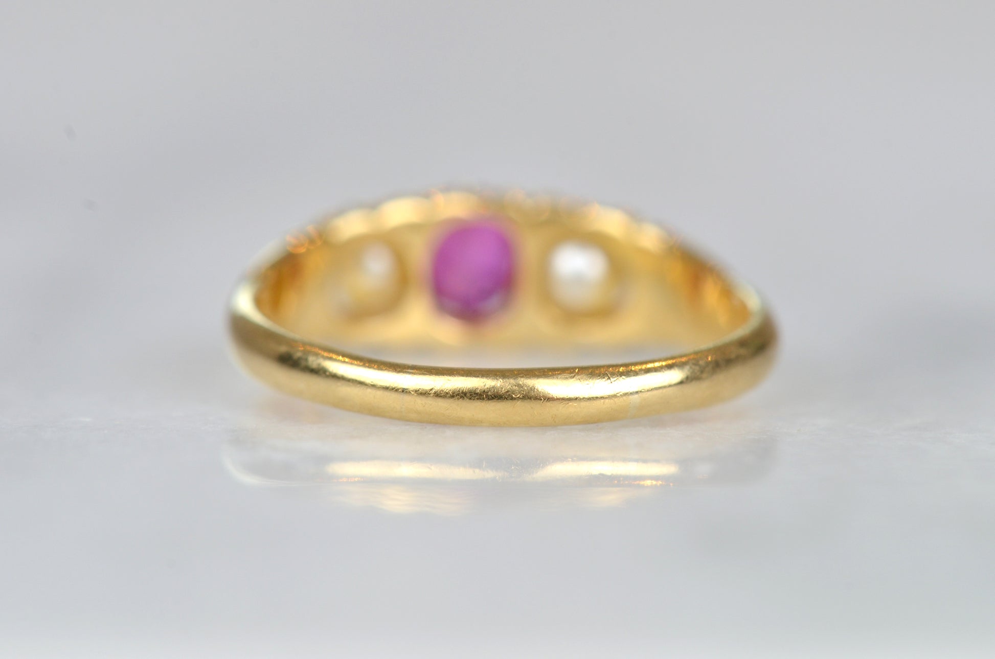 A gorgeous Victorian-inspired ring featuring a vivid pink sapphire flanked by two creamy white pearls in a scalloped and scrolling setting. Often these Victorian Revival rings are lightweight and hollowed out, but this piece has a rich, heavy band and mount, as well as a lovely old cut elongated cushion at its heart. It's clear that someone has tinkered a little with the pearls - one set low while the other is at a jaunty height - but their milky white bodies are the perfect foil for the fiery saturation of the pink sapphire. Though a bit too light and with slight violetish undertones that prevent it from truly being classified as a ruby, the stone has a distinct romance and charm.
