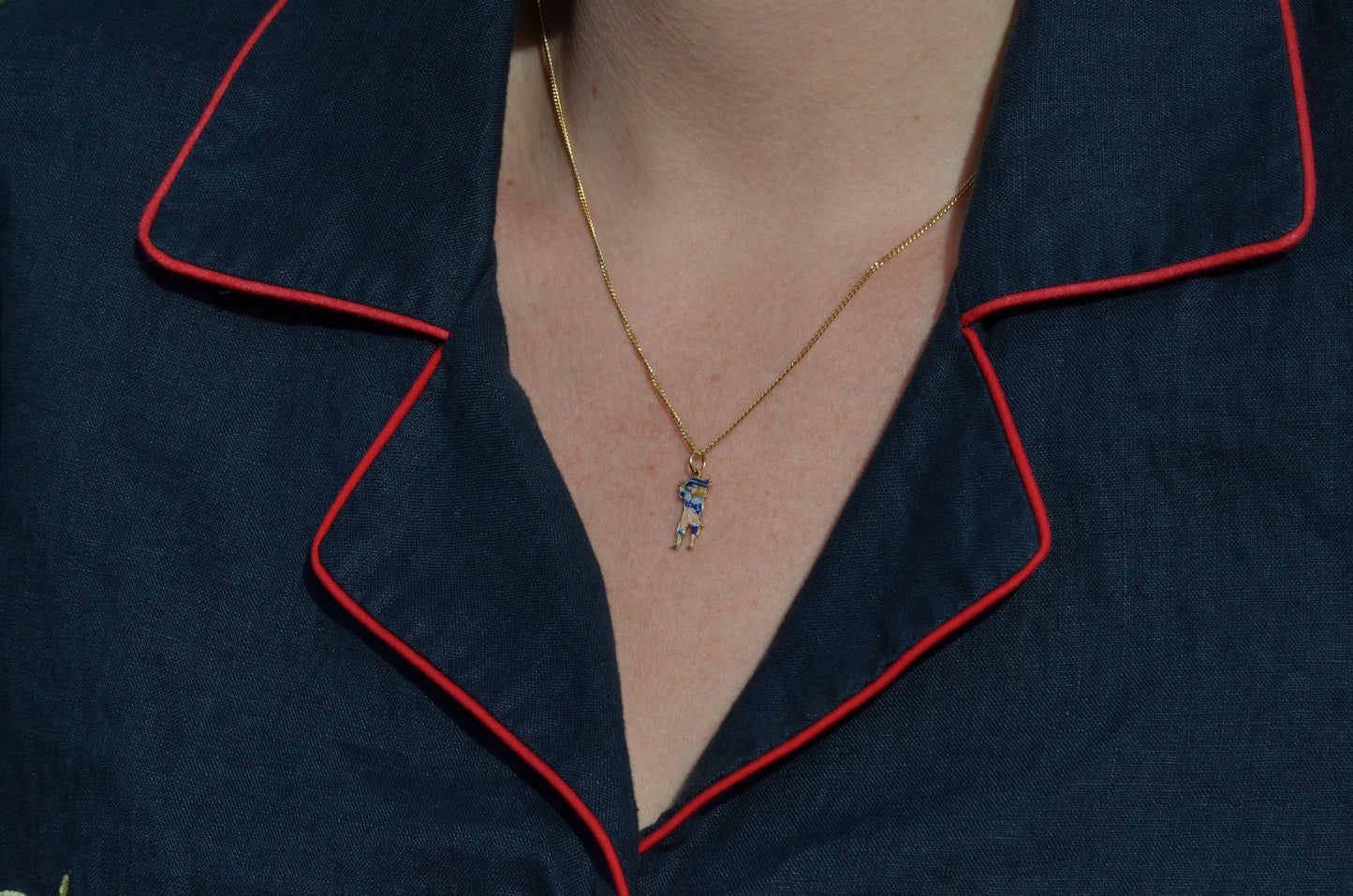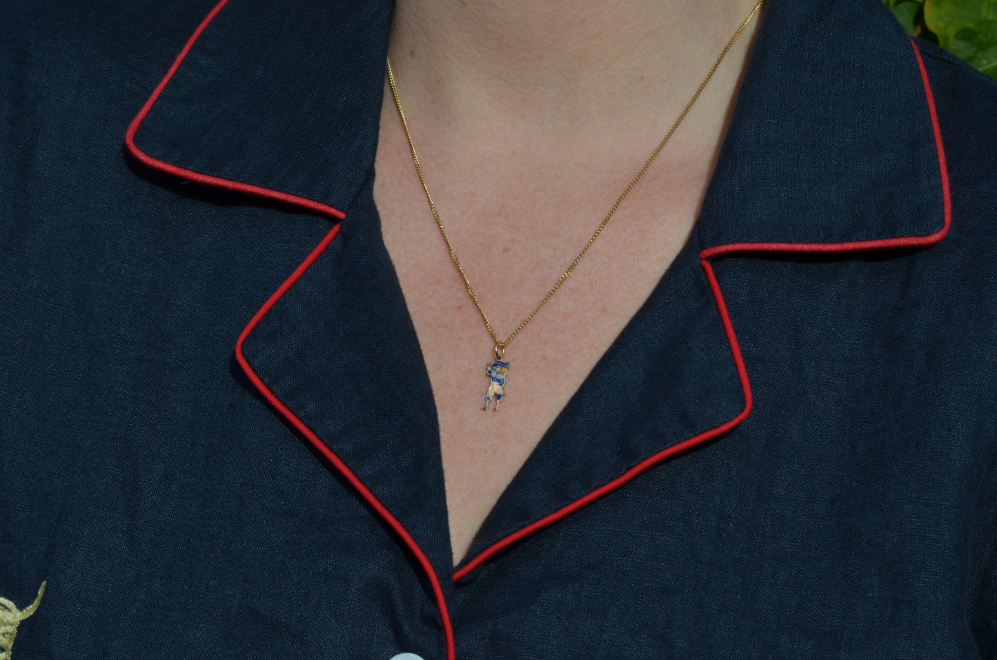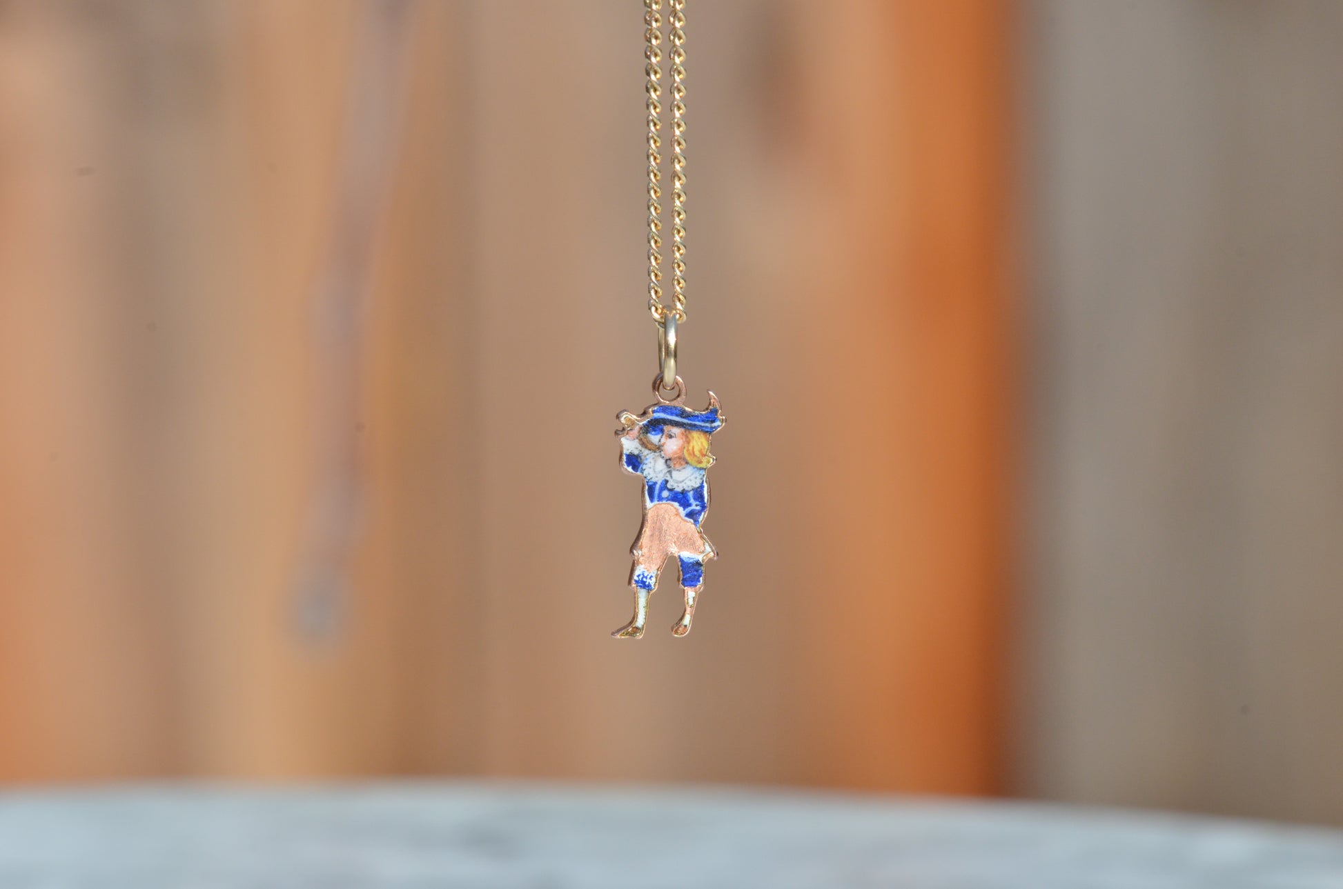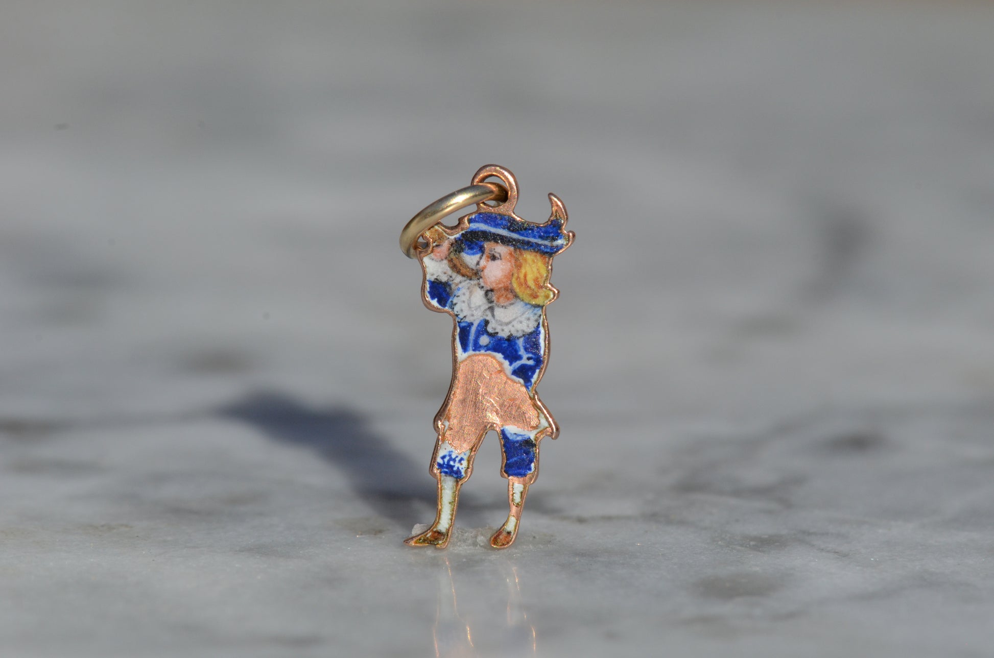 Wellity, wellity, wellity, if it isn't a sweet little prince of a boy in his dandy finery blowing on his precious little horn. Where has his midsection gone? We'll never know, but something about this little enameled charm is how I feel most days: fancy if a little run down, begging for attention but not making it worth your while, and being wholly silly.
