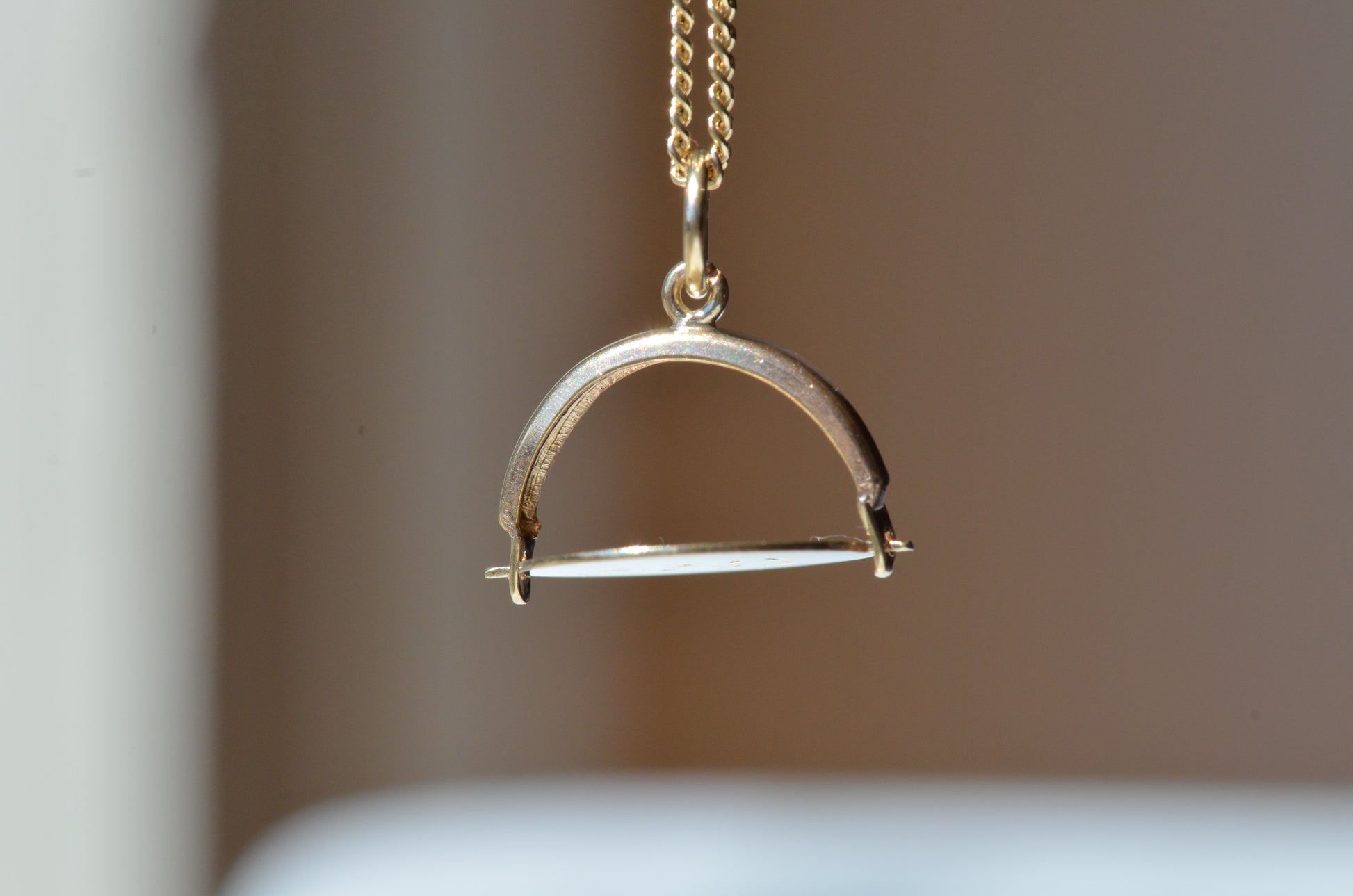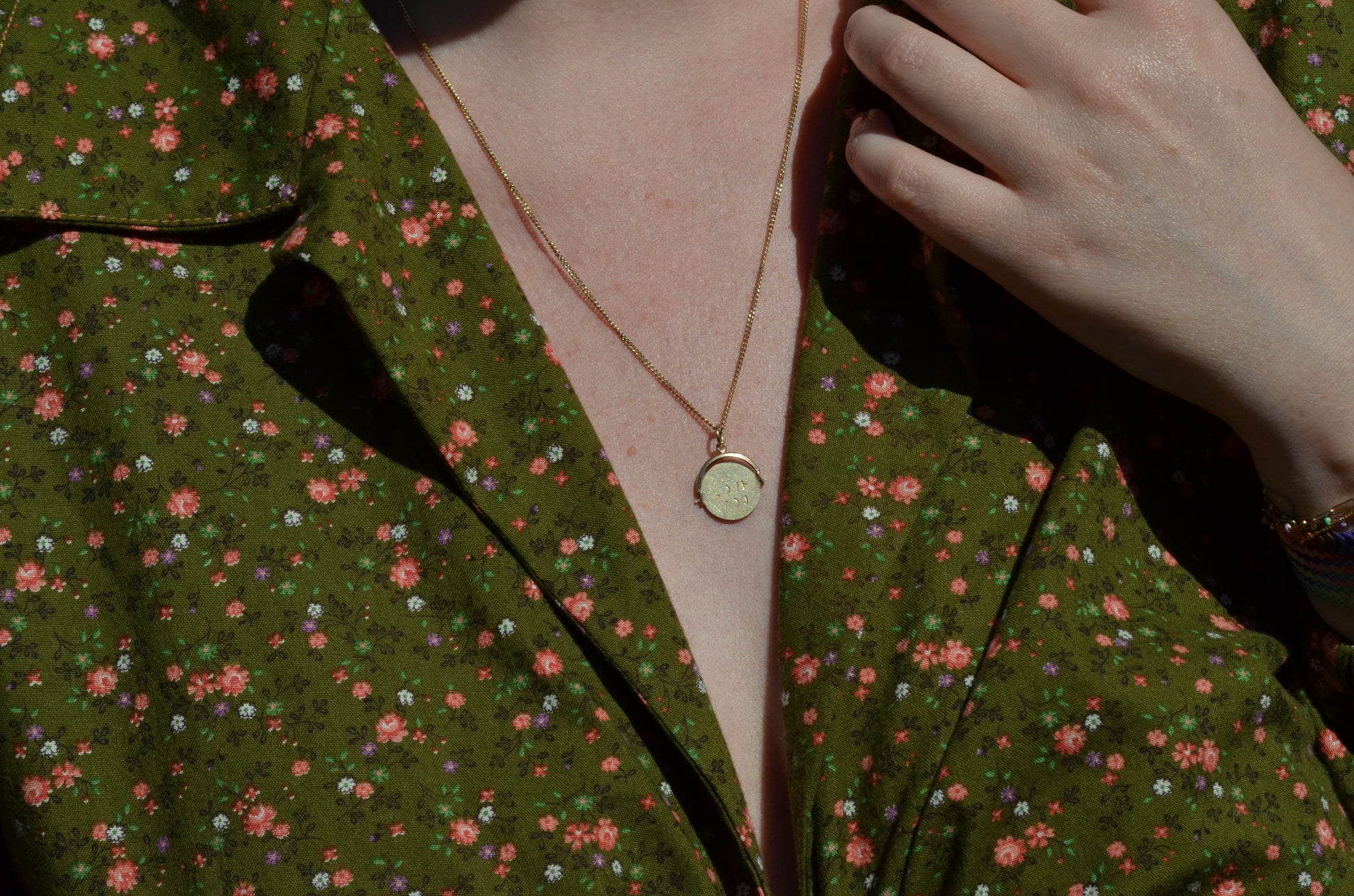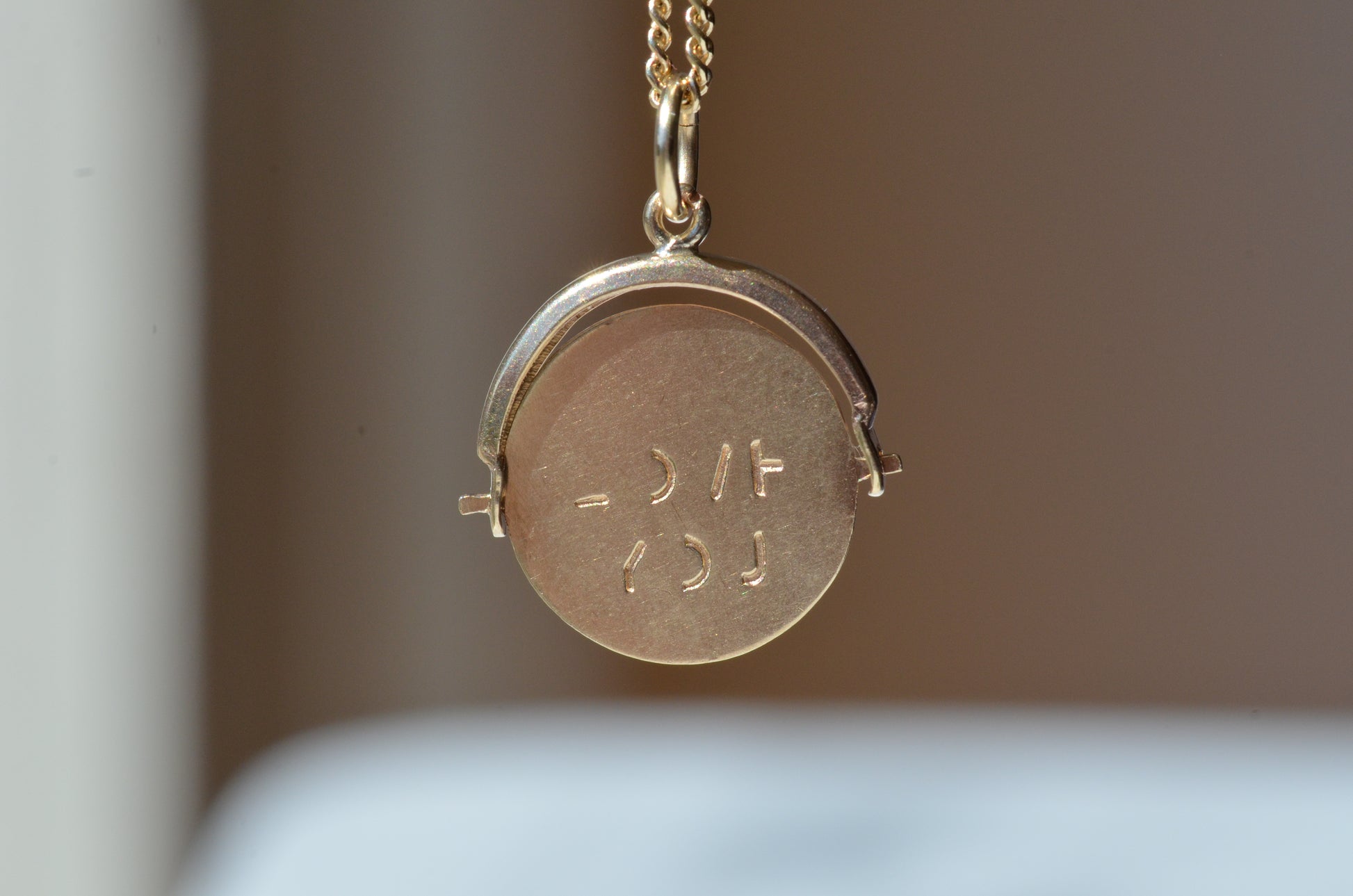 Straight from the midcentury charm craze, these delightful pieces can be added to your own charm bracelet or necklace, or worn alone on a chain to give them all the focus. Each side of the disc bears only a portion of each letter, creating a secret message that is only revealed when the disc is spun and in motion.