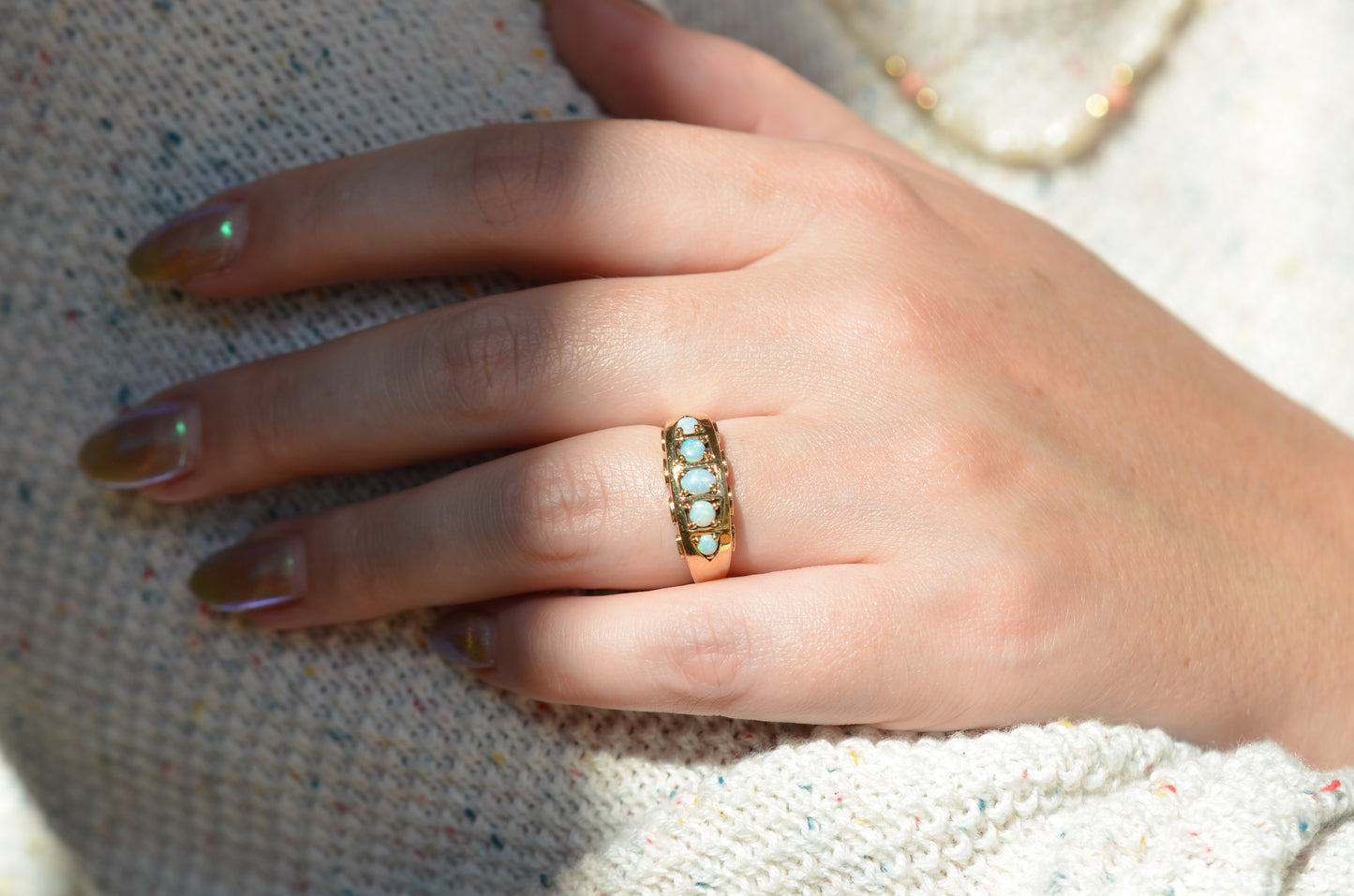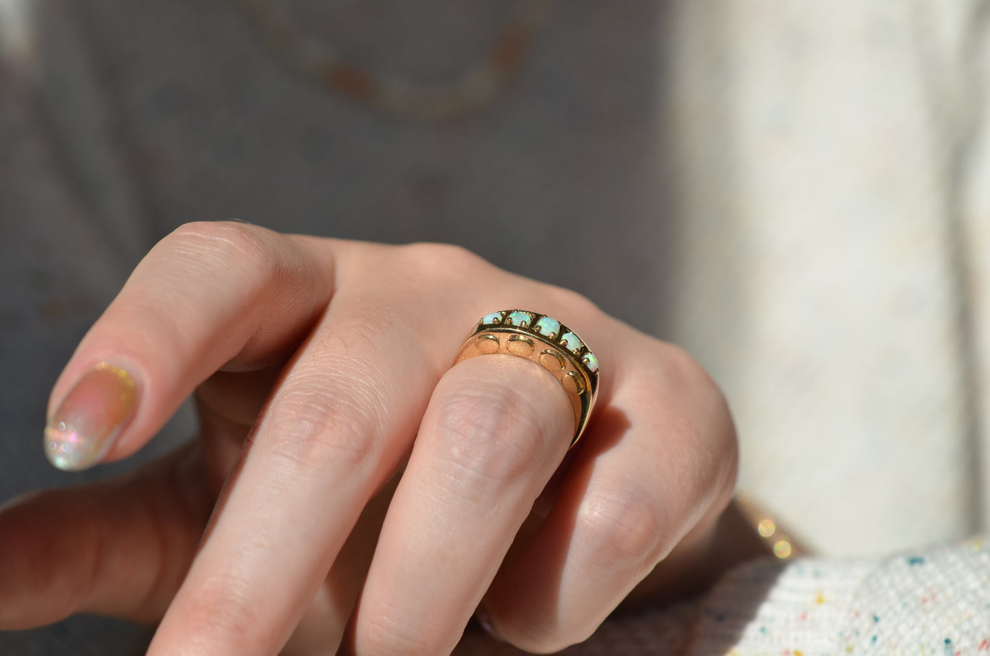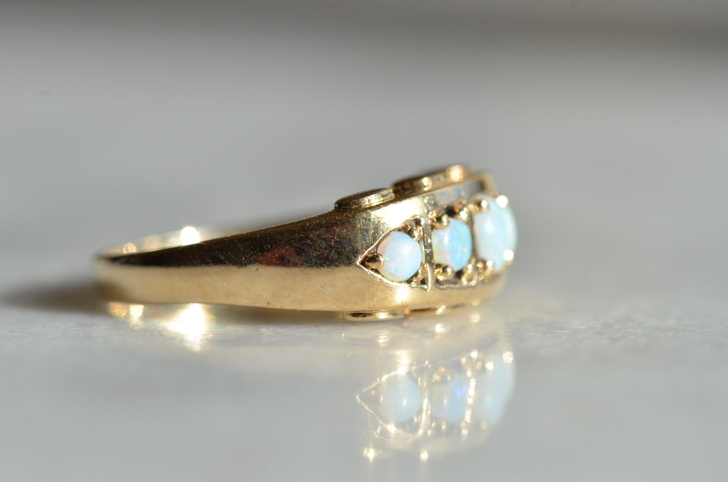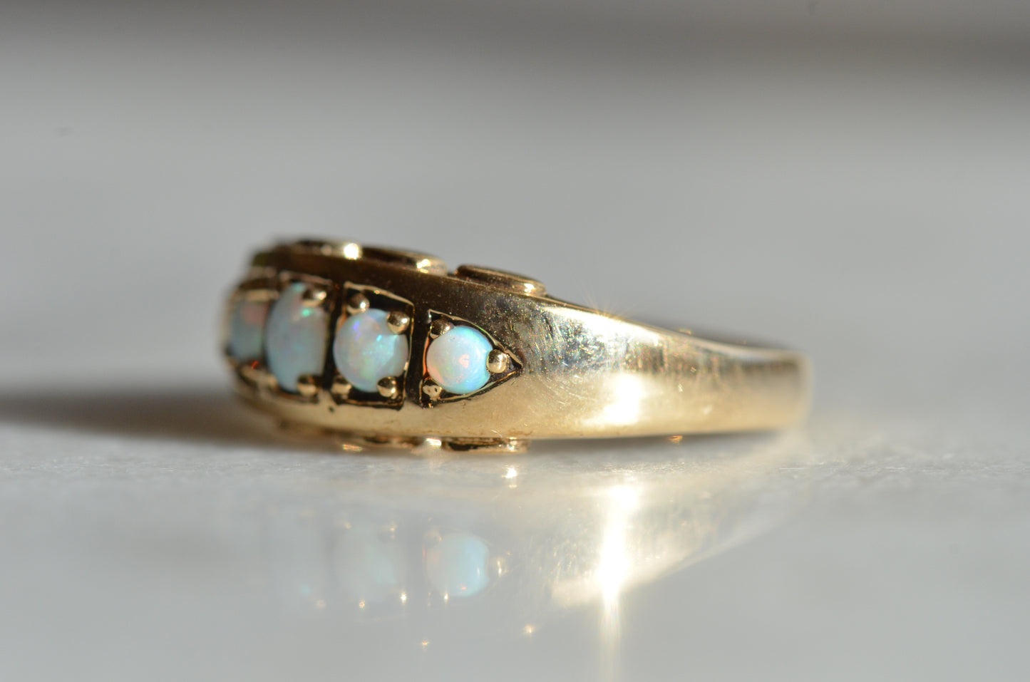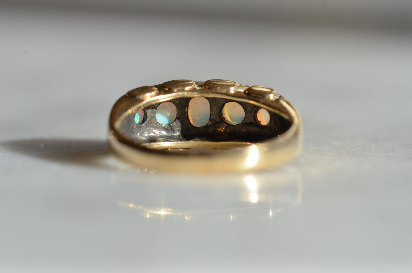 Bright and lively, this vintage ring has a unique almost nautical feel: with the tapered east-west setting, often referred to as a boat setting for the shape, along with round details along the gallery like little portholes, and the churning watery nature of blue opals.