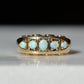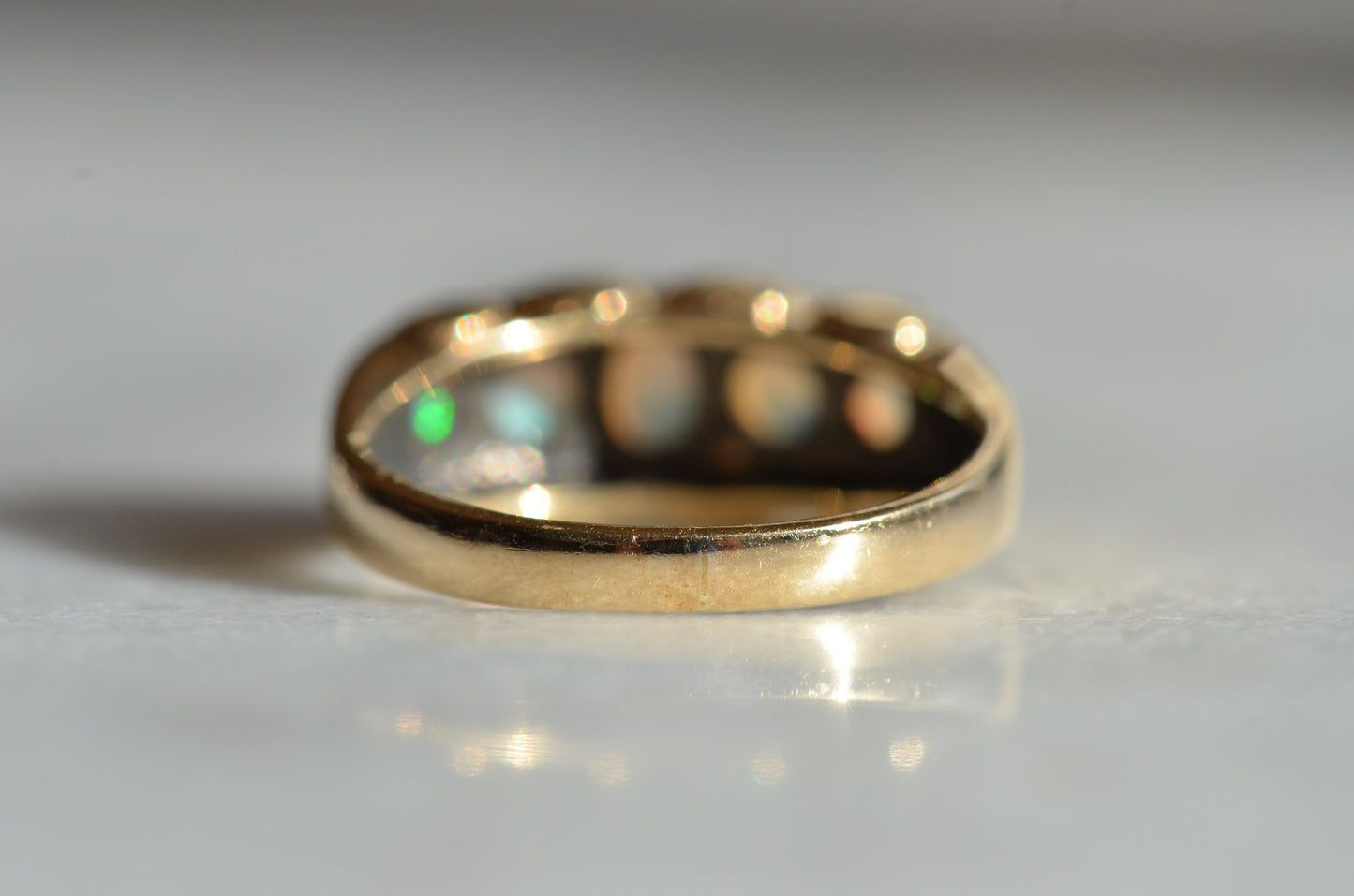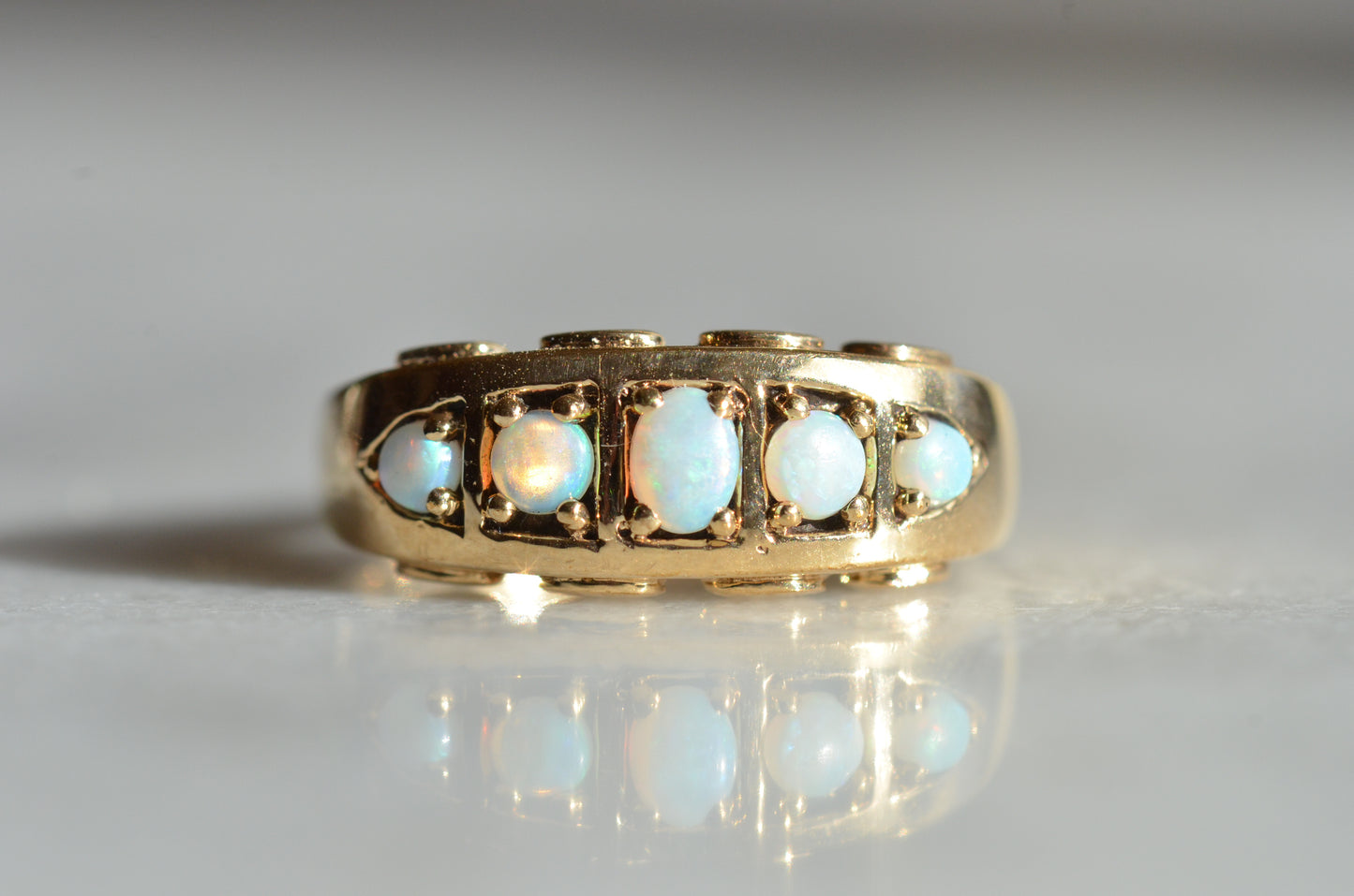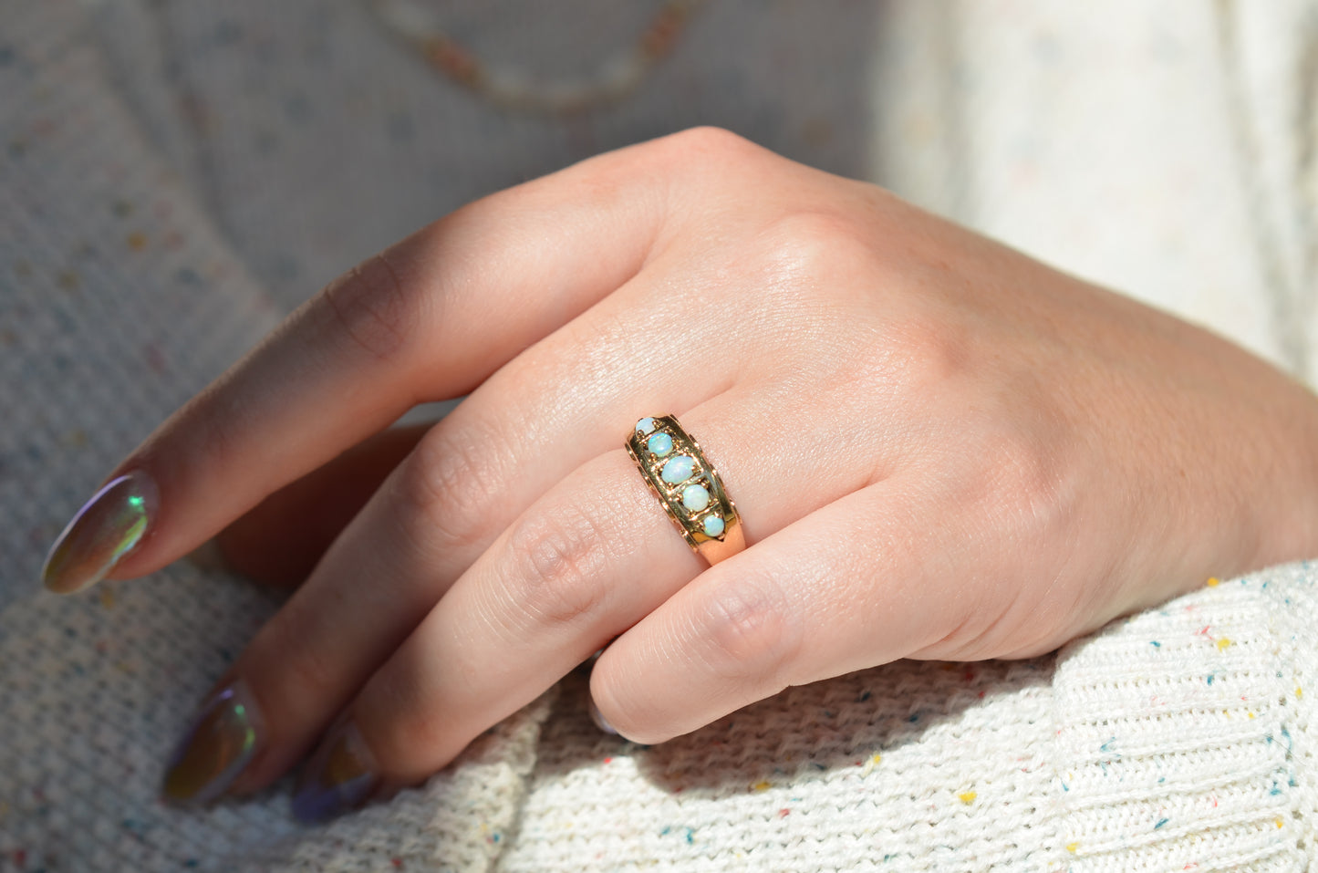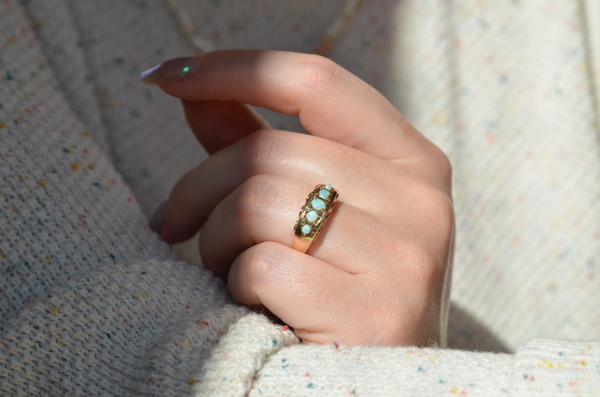 Bright and lively, this vintage ring has a unique almost nautical feel: with the tapered east-west setting, often referred to as a boat setting for the shape, along with round details along the gallery like little portholes, and the churning watery nature of blue opals.
