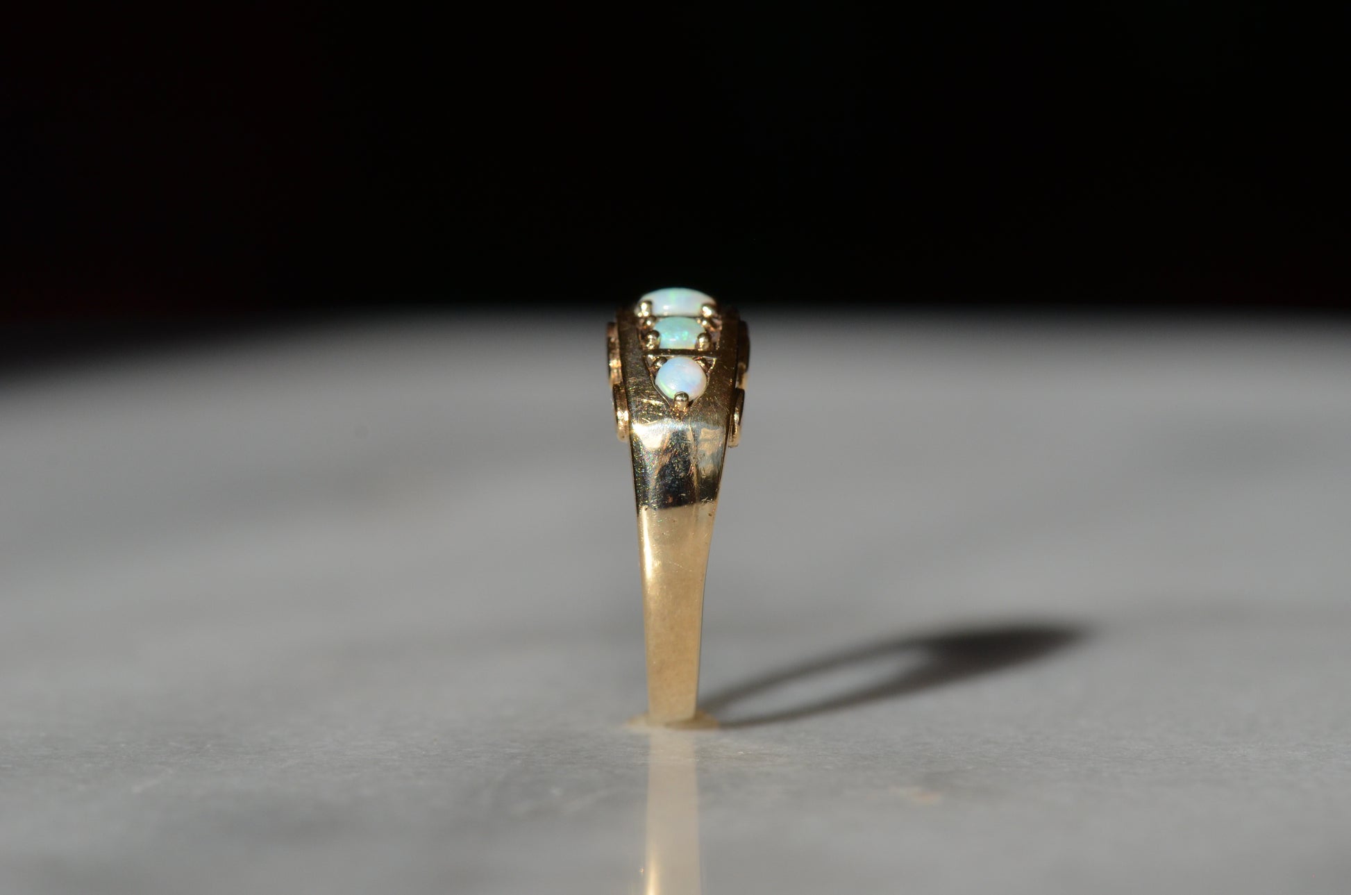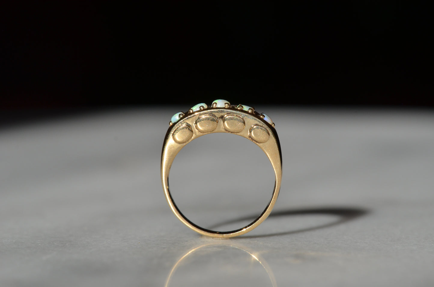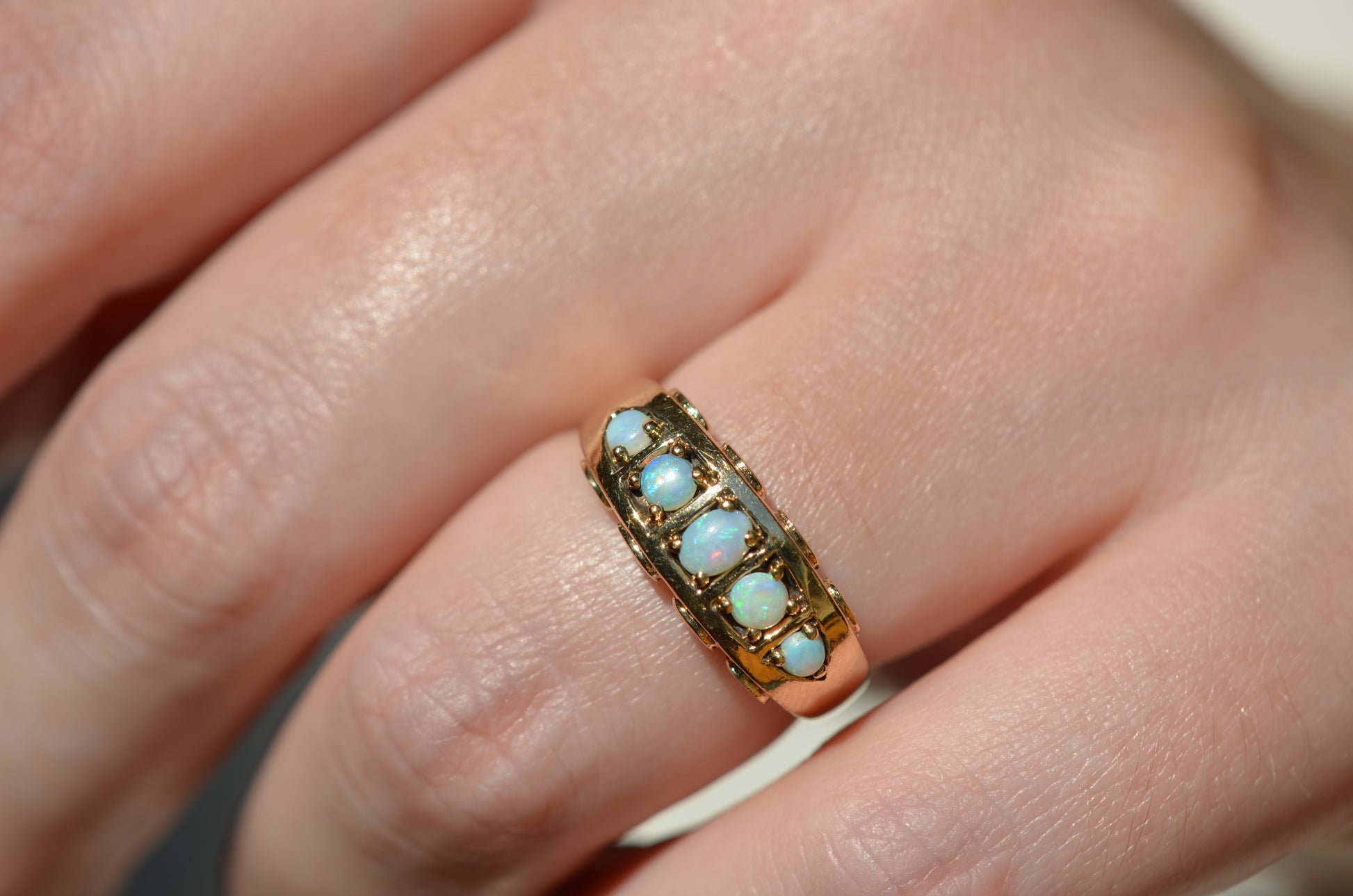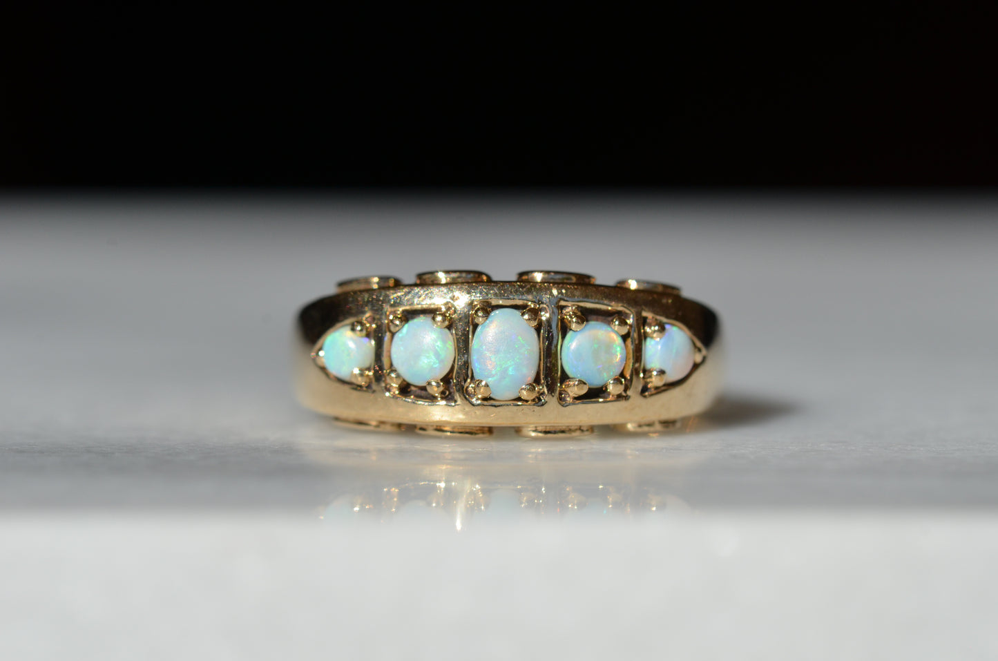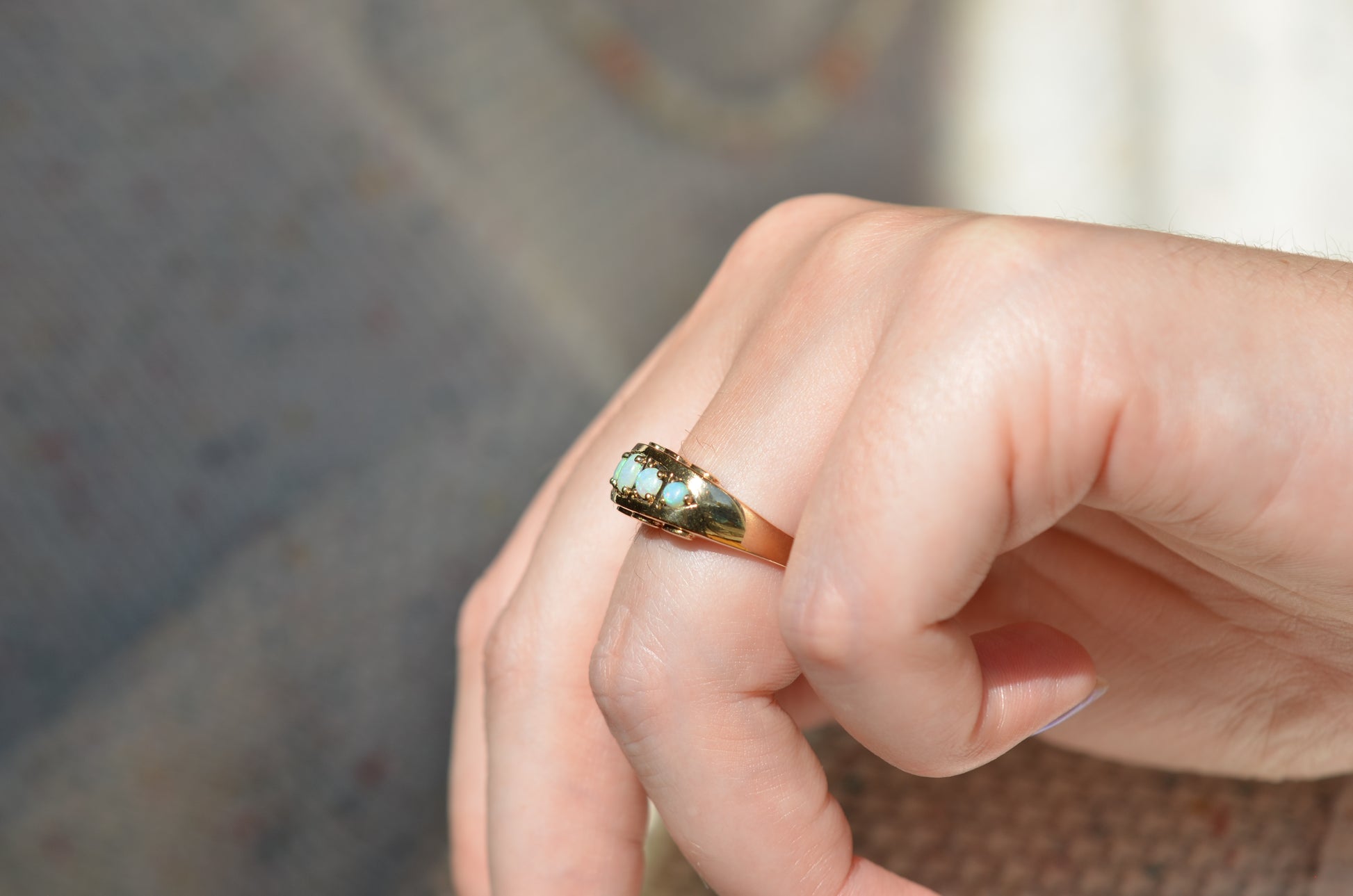 Bright and lively, this vintage ring has a unique almost nautical feel: with the tapered east-west setting, often referred to as a boat setting for the shape, along with round details along the gallery like little portholes, and the churning watery nature of blue opals.