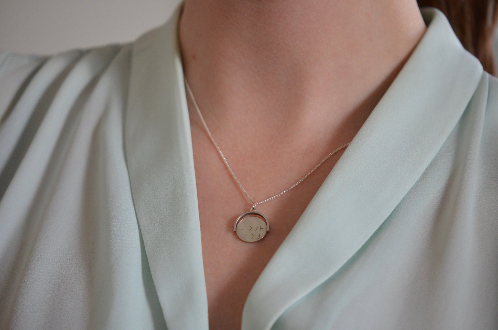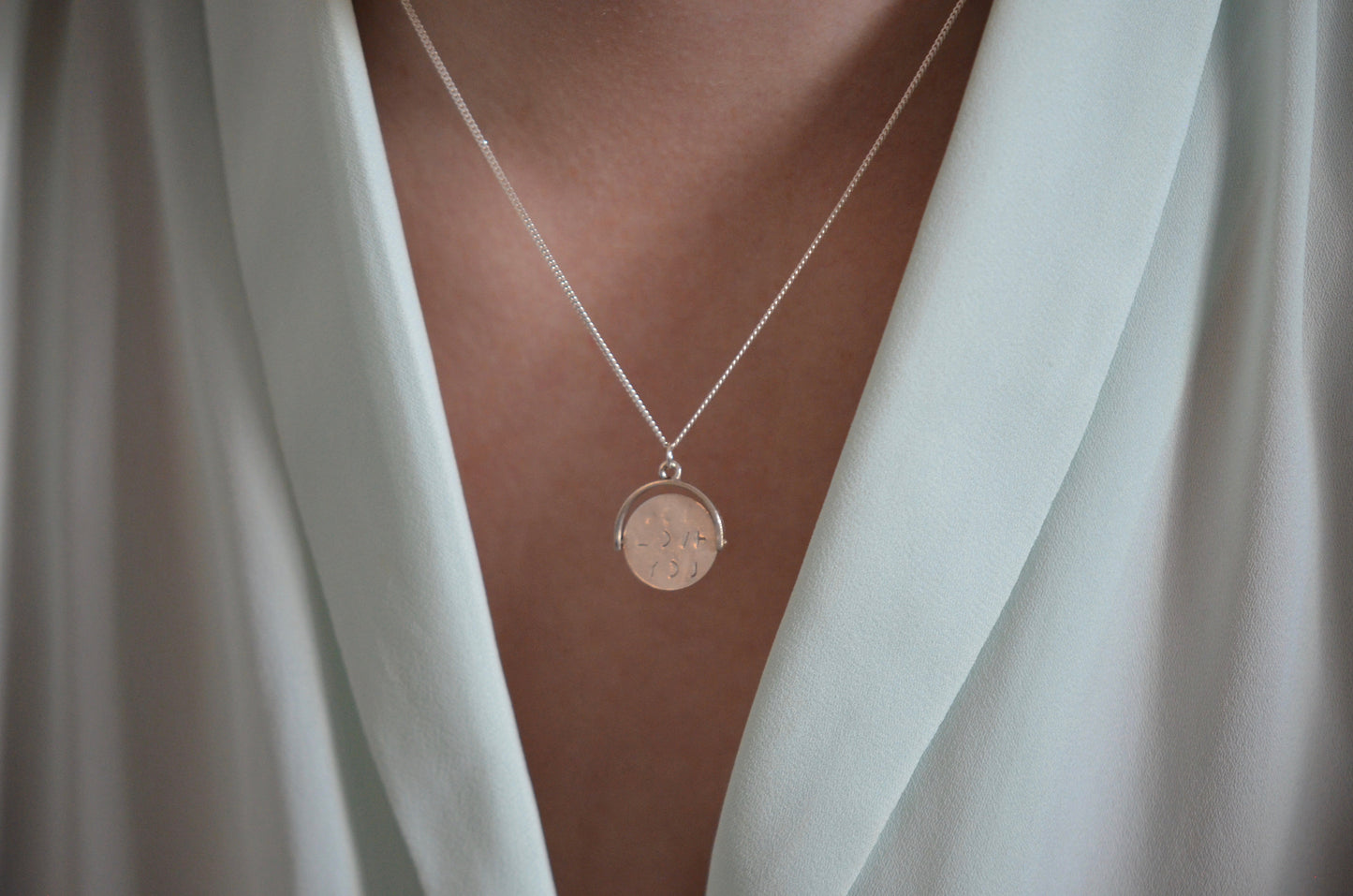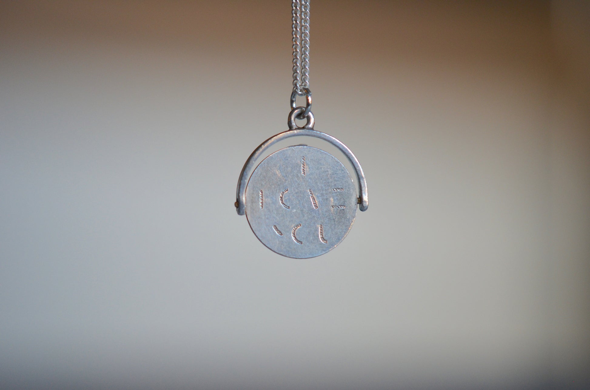 Straight from the mid-century charm craze, these delightful pieces can be added to your own charm bracelet or necklace, or worn alone on a chain to give them all the focus. Each side of the disc bears only a portion of each letter, creating a secret message that is only revealed when the disc is spun and in motion.