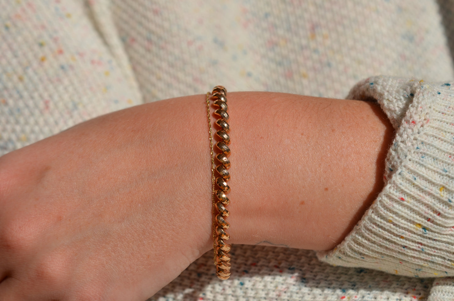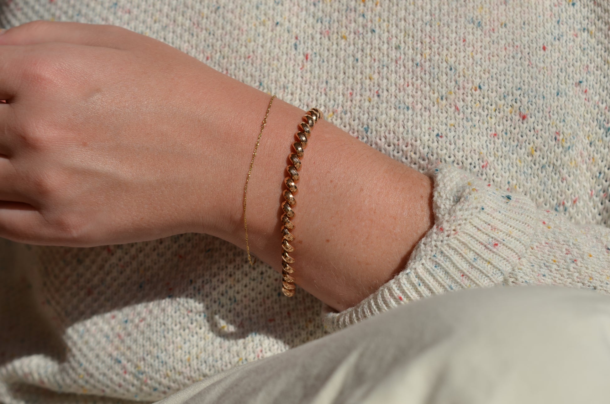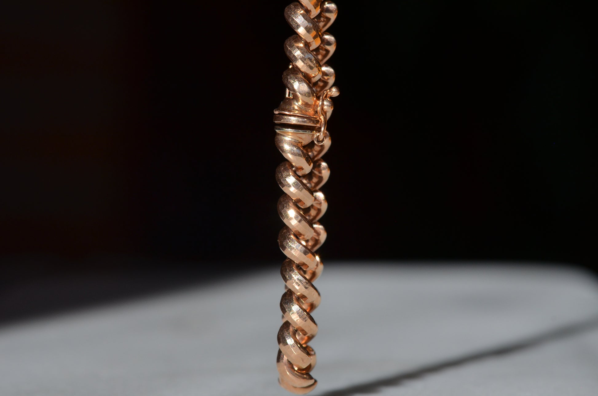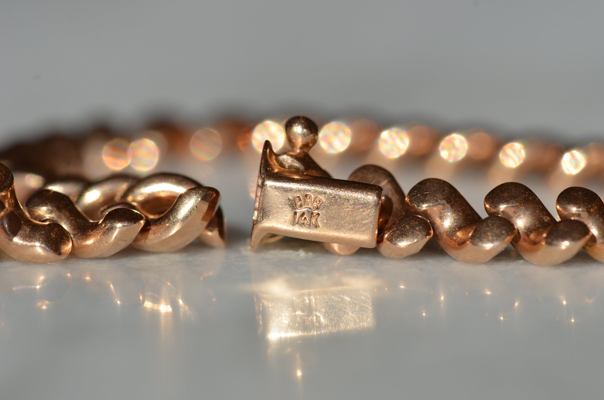 A gorgeous and covetable San Marco style bracelet with shimmering facets and perfectly puffed links. Affectionately called "macaroni" bracelets for their resemblance to the iconic noodle, this style of link was a mainstay of the 1980s and 1990s and has made a fierce comeback. To be expected from their era, they provide a lot of look for a more minimal weight, with hollow formed links, but by no means feel insubstantial. You'll love the way the sun hits these curves and will no doubt be wearing it day in and day out.