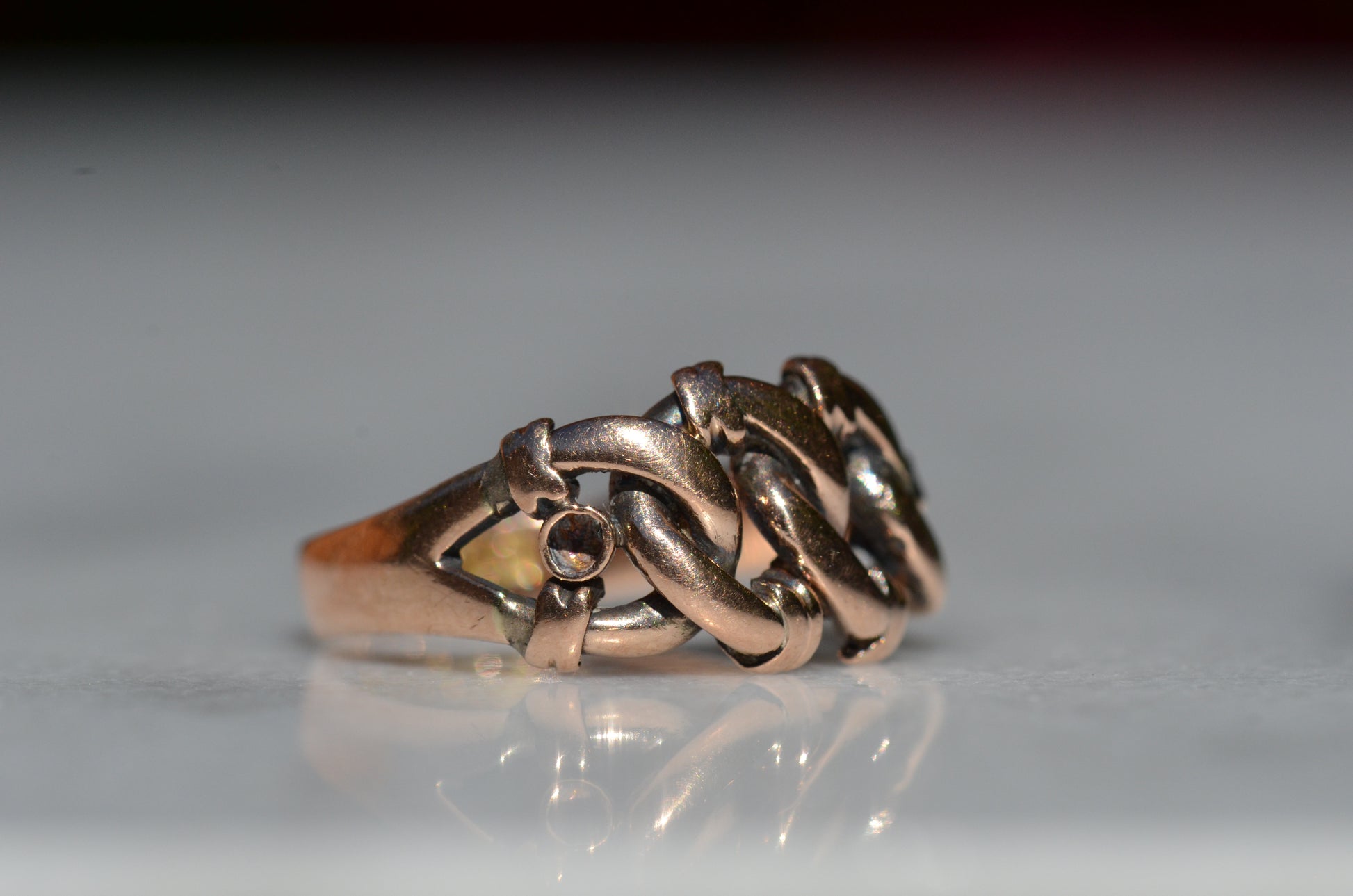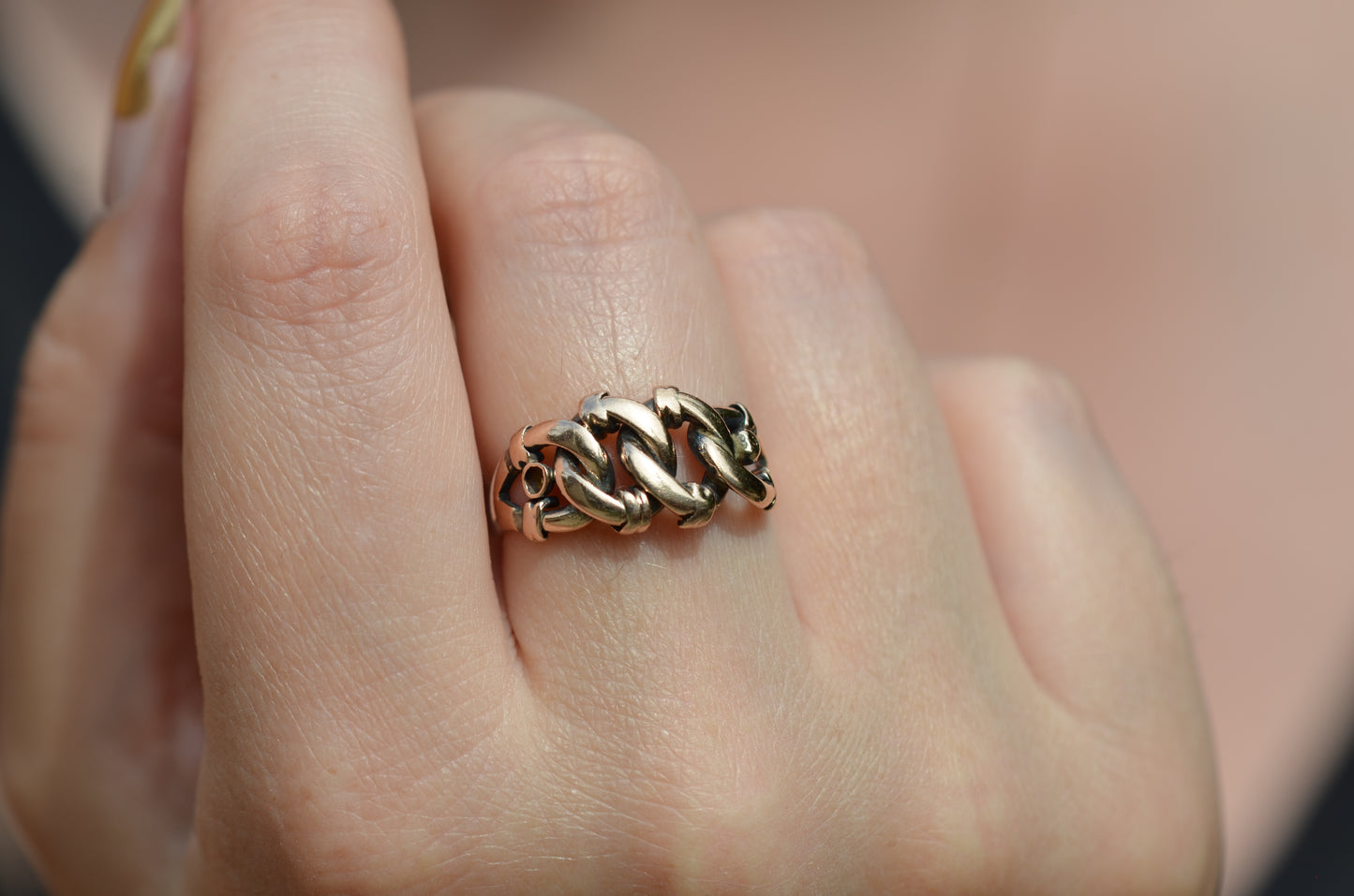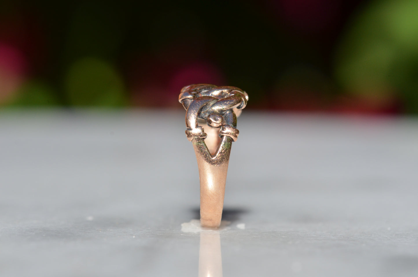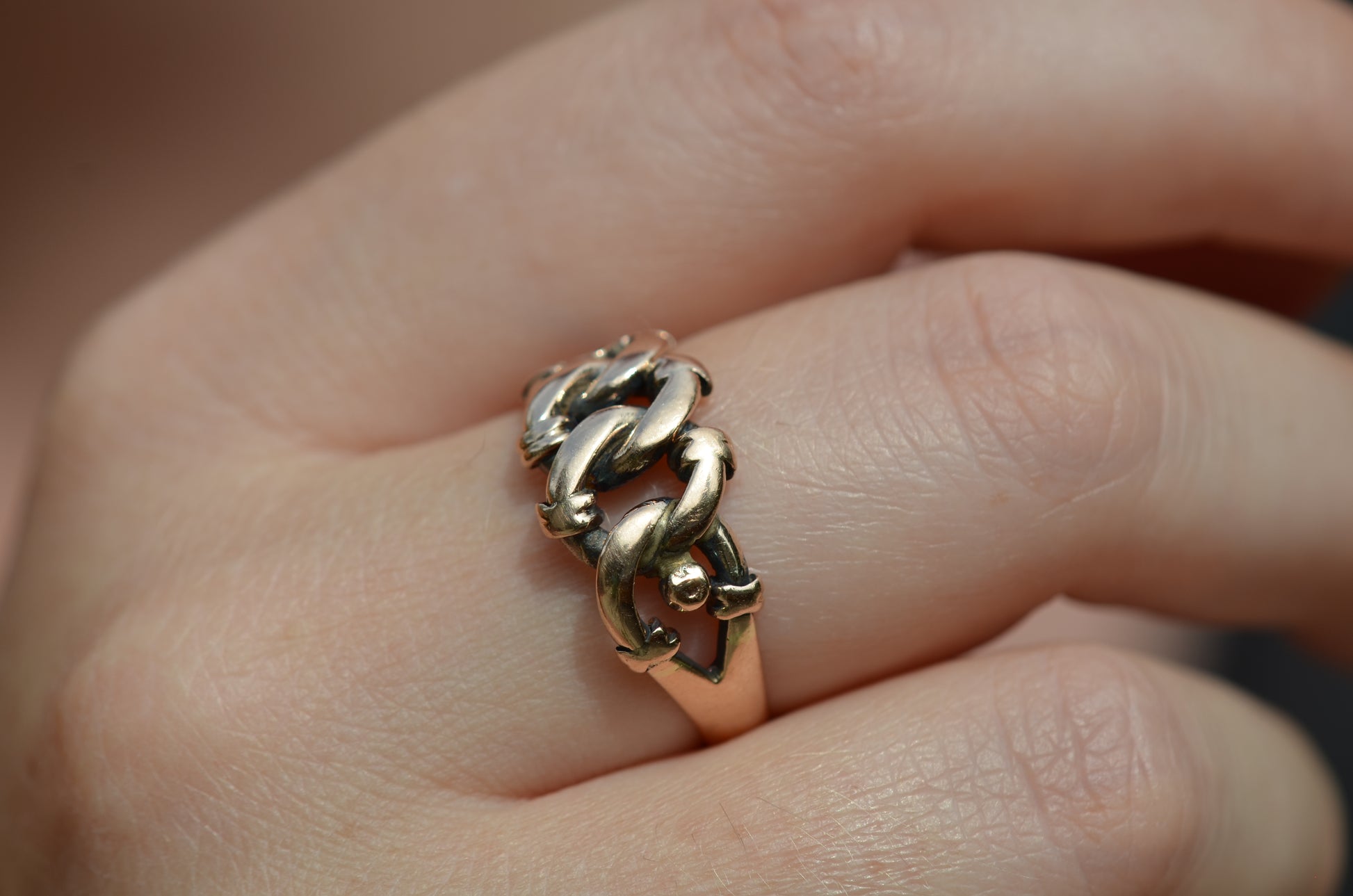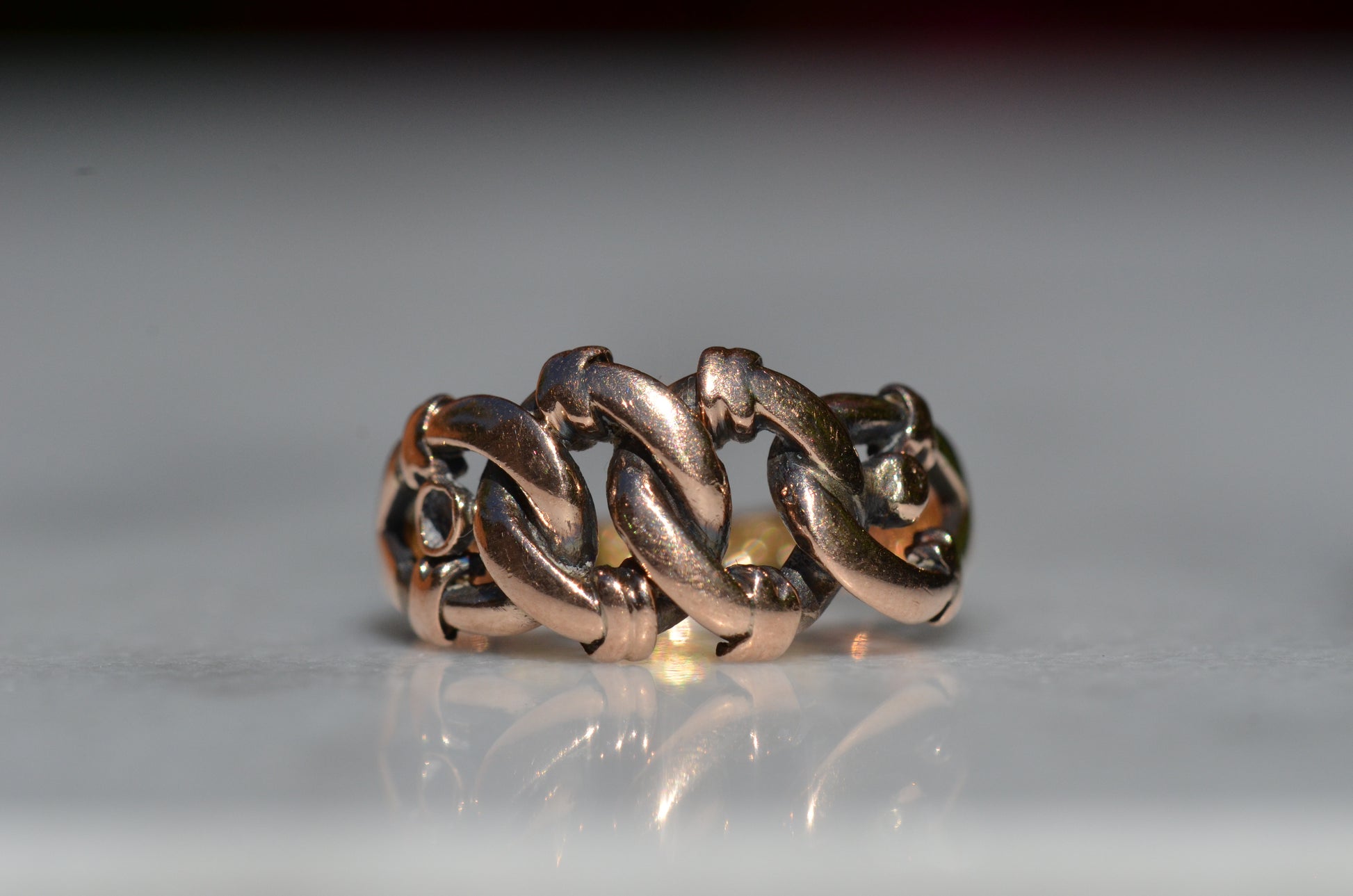 A lovely late Victorian style crafted in the Edwardian period this unique ring takes its cues from woven-look keeper rings and intricately entwined lovers' knots. While the appearance here is almost of a chain, it has a nautical feel and maintains the romantic charm of its inspirations.